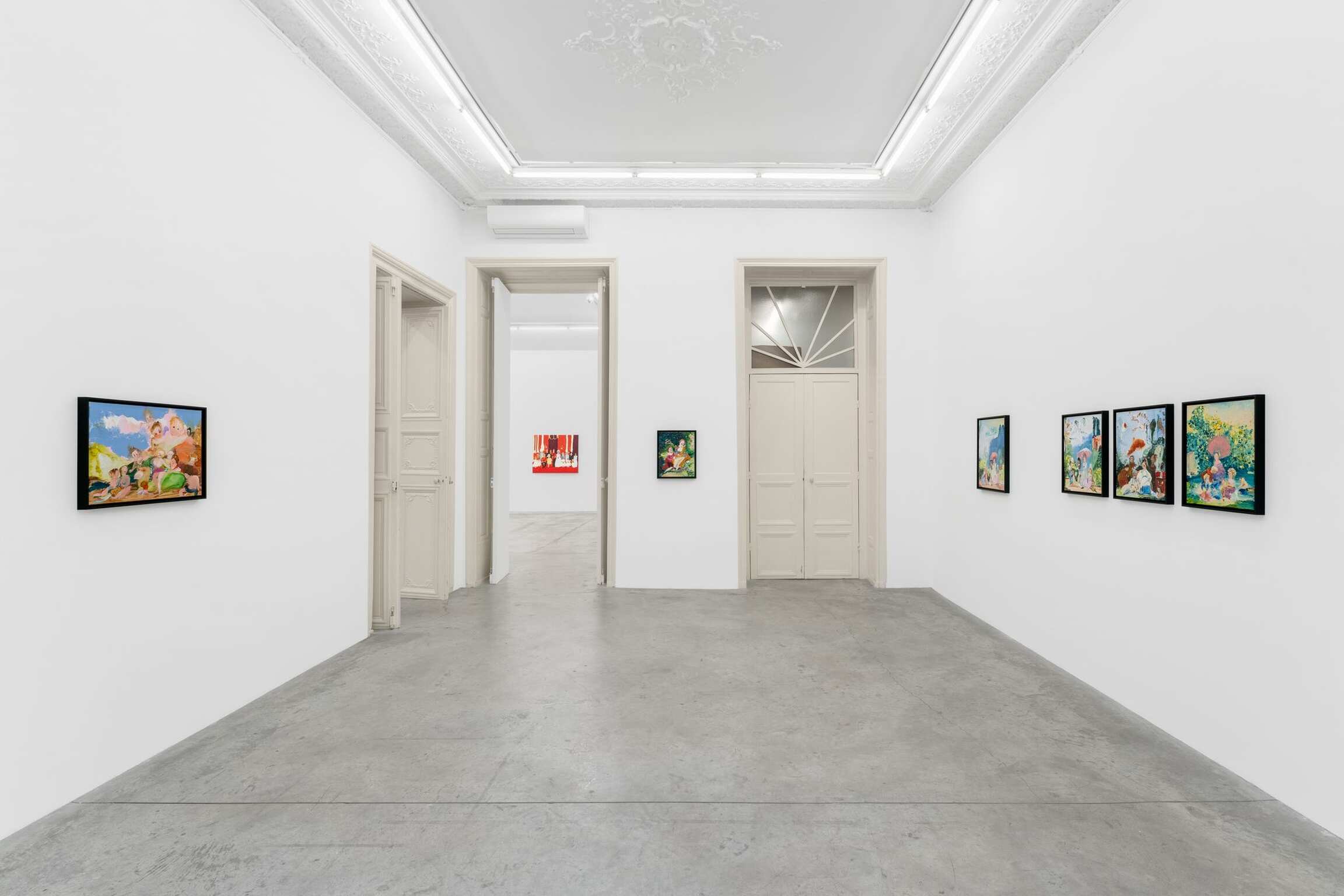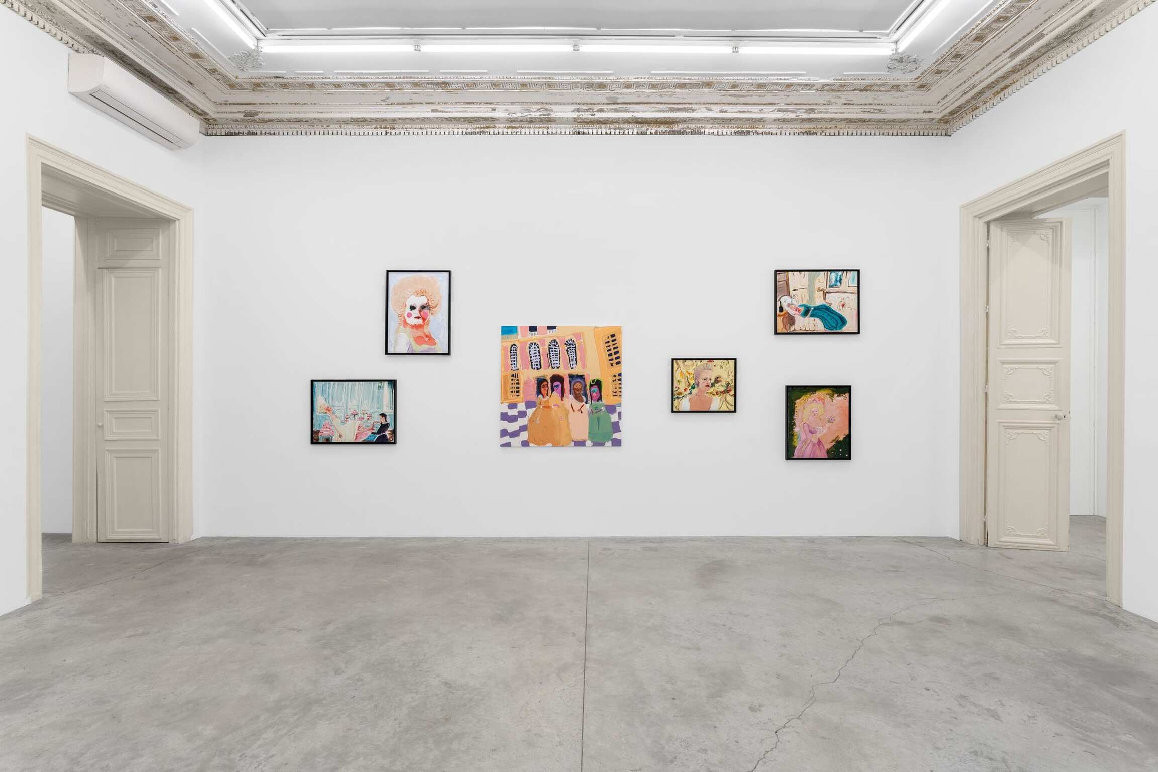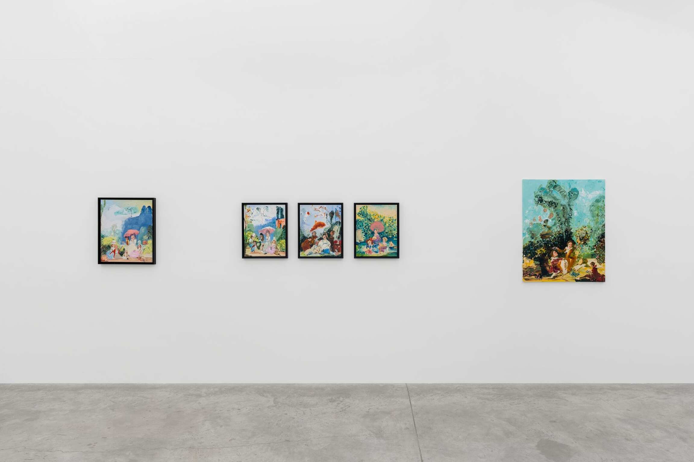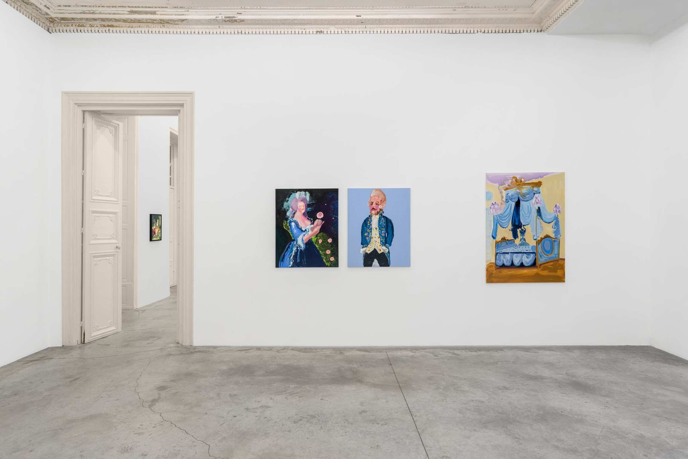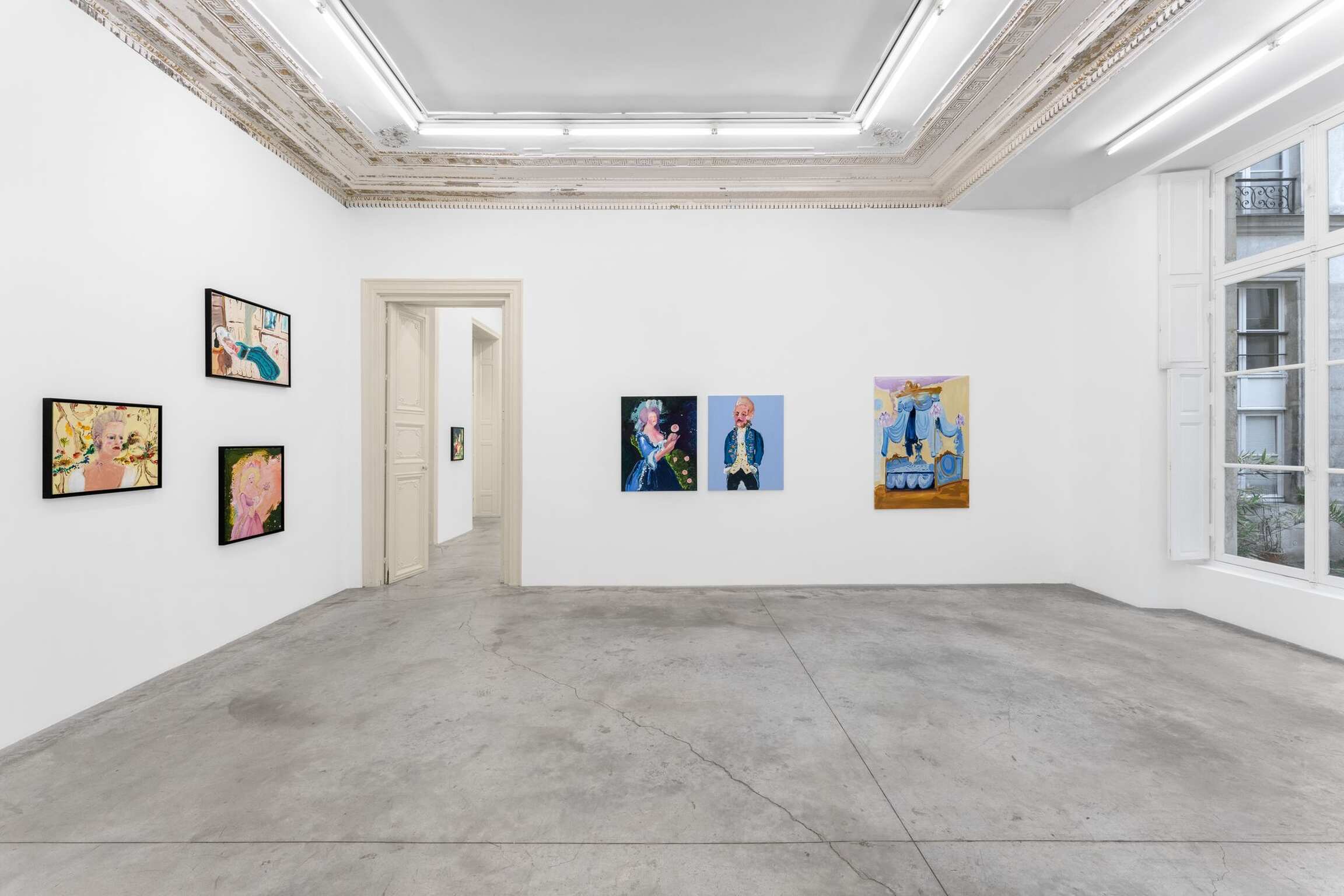 The work of Genieve Figgis is that of a liberation enterprise. It is a question, canvas after canvas, of relieving our imaginations and releasing the beings - or the spectres - who haunt our History. From Madame de Pompadour to Marie-Antoinette, from Count Fersen to Napoleon, she evokes a universe of royalty and power, where a brittle prestige gives way to a voluptuous strangeness, where characters become creatures, inhabitants of a grotesque world. The singular touch of Figgis gives each portrait the appearance of a mask, a disguise, and her work at large amounts to an ethereal study of a carnival cast. The artist offers us distance; the comic and the absurd free us from the weight of a suffocating heritage of representatives and symbols which no one chose. These portraits present surreal beings where garish colours mingle, where gazes are lost, where mouths twist and expressions melt. There is, in each one of them, a form of monstrosity. This strategy of subversion pushes Figgis towards the canons of the Rococo genre, in particular La Bascule by Jean-Honoré Fragonard (1750-1752), or Lovers in a Park by Boucher (1758). Many works also show rural and bucolic worlds, places of leisure and scenes of pleasure. The paintings are filled with cherubic angels and signs of love. The Rococo style, which appeared at the beginning of the 18th century, was precisely intended to make people forget reality, the decline of a past glory through light scenes of gaiety, of joie de vivre. The paintings of the period depict pastoral scenes and walks of aristocratic couples, which Figgis echoes, morphs, and dissects here. The multiple portraits of Marie-Antoinette are an homage to this figure and a recognition of her long-lasting influence and presence in history, a place that so many remarkable women are still deprived from. For Figgis, Marie-Antoinette remains an icon, and her paintings try to grasp a character who went through a forced marriage and her search for happiness in the golden jail of Versailles.