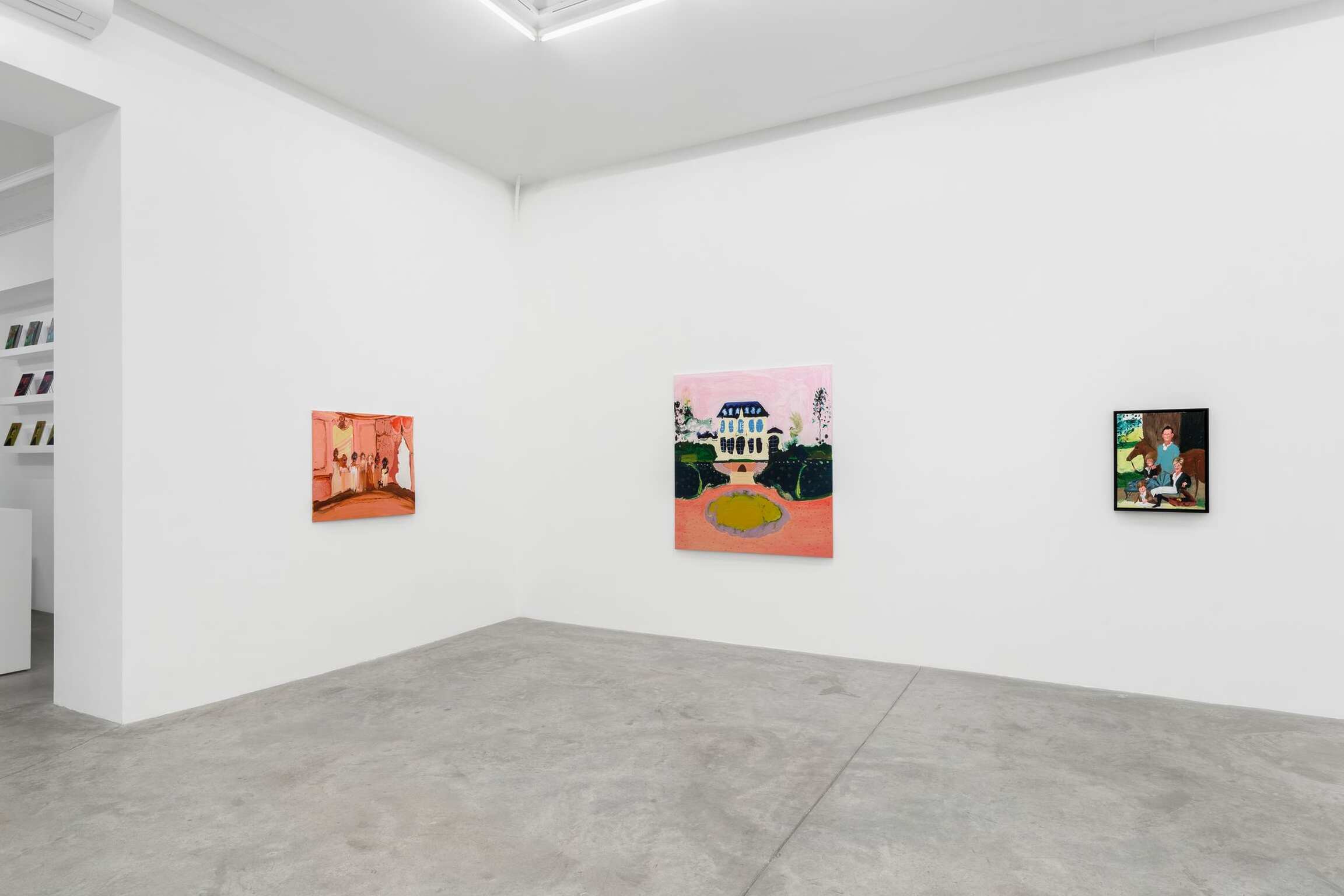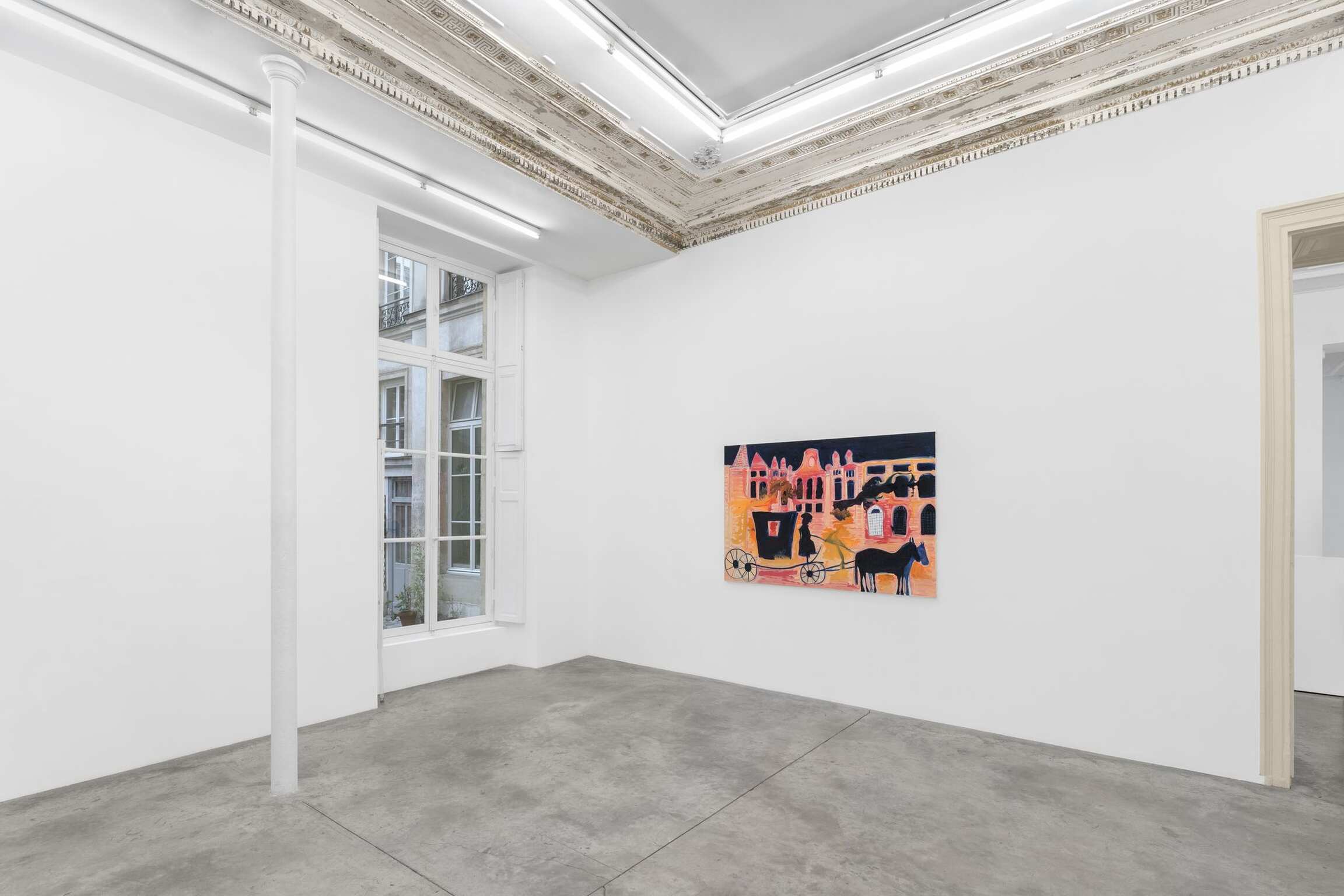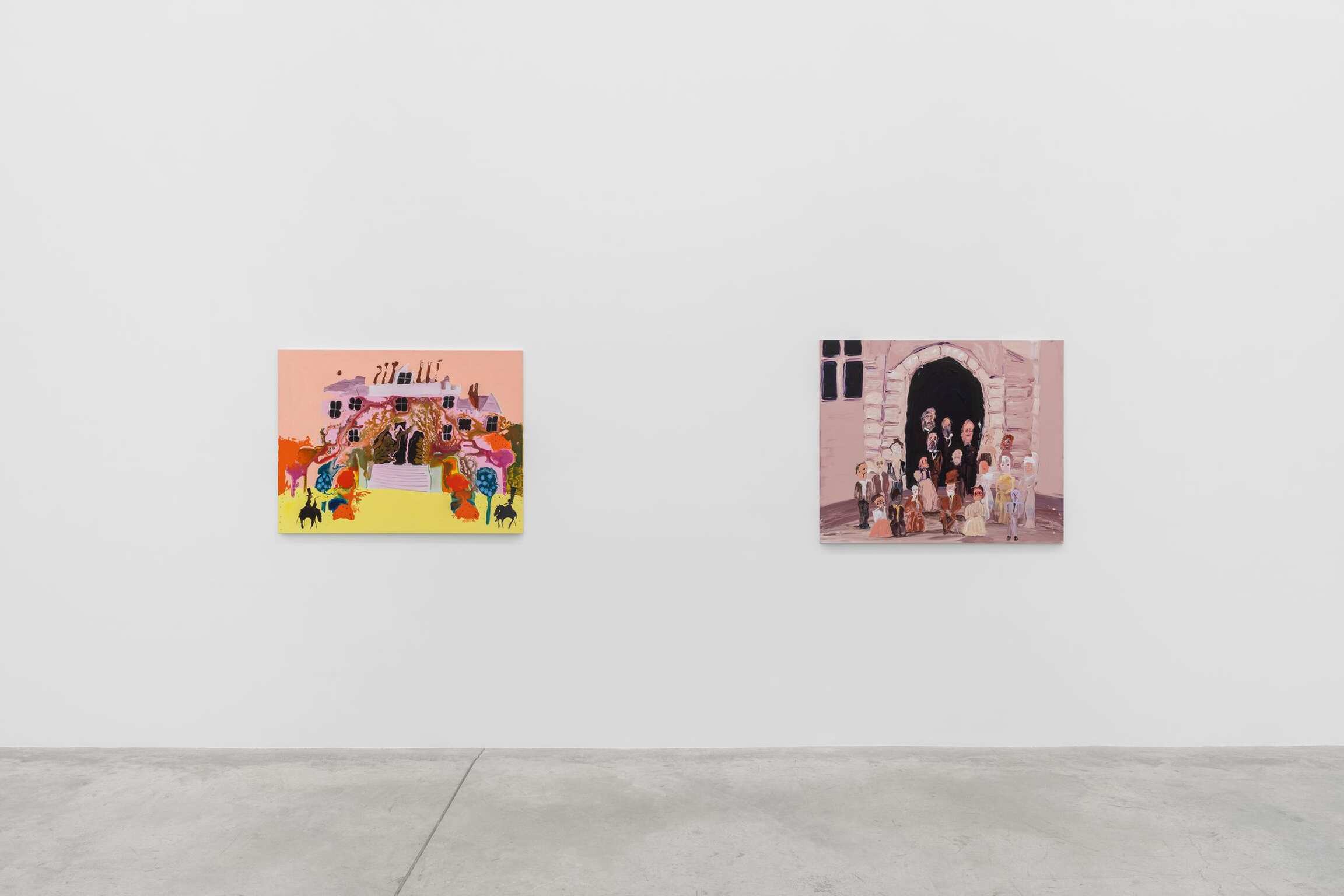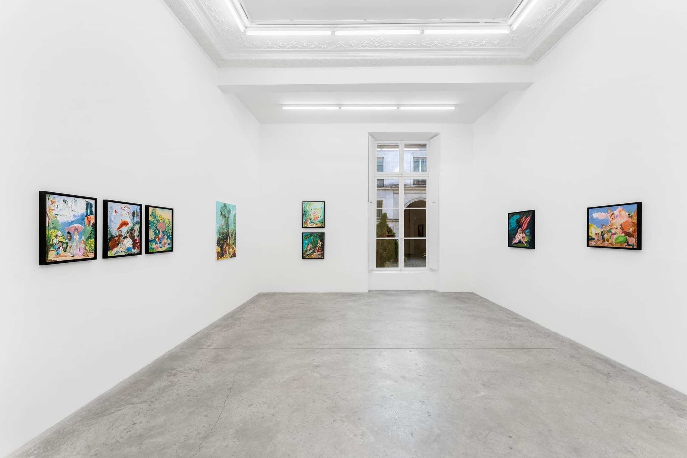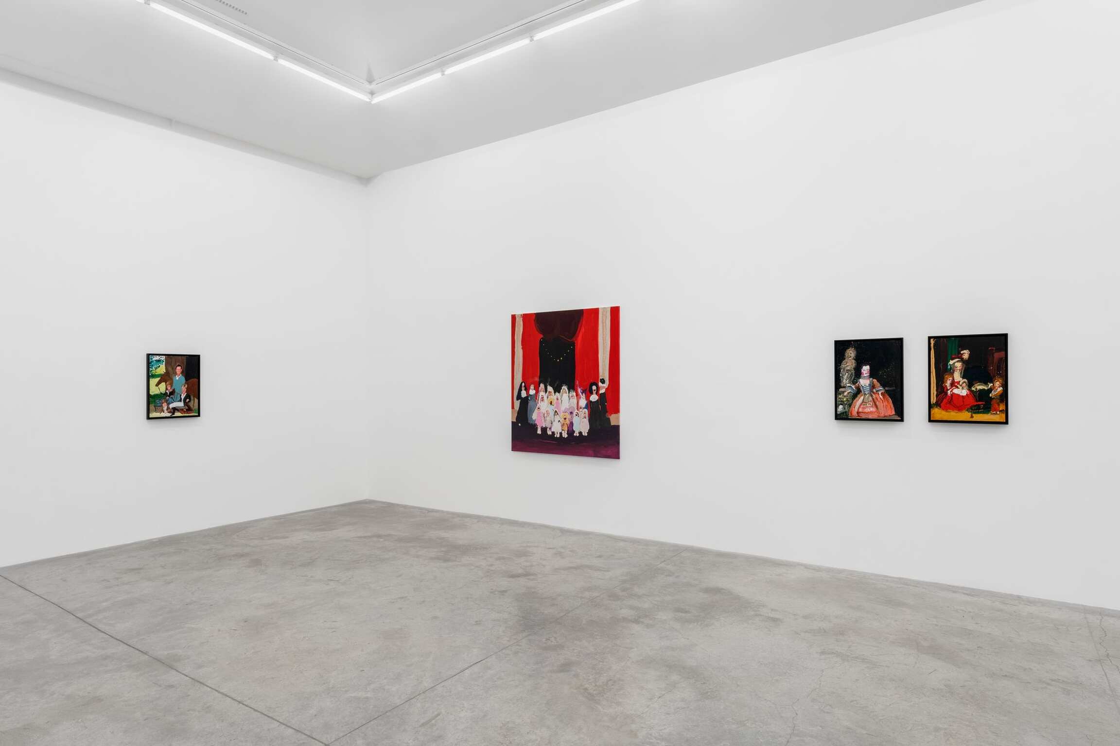 The work of Genieve Figgis is that of a liberation enterprise. It is a question, canvas after canvas, of relieving our imaginations and releasing the beings - or the spectres - who haunt our History. From Madame de Pompadour to Marie-Antoinette, from Count Fersen to Napoleon, she evokes a universe of royalty and power, where a brittle prestige gives way to a voluptuous strangeness, where characters become creatures, inhabitants of a grotesque world. The singular touch of Figgis gives each portrait the appearance of a mask, a disguise, and her work at large amounts to an ethereal study of a carnival cast. The artist offers us distance; the comic and the absurd free us from the weight of a suffocating heritage of representatives and symbols which no one chose. These portraits present surreal beings where garish colours mingle, where gazes are lost, where mouths twist and expressions melt. There is, in each one of them, a form of monstrosity. This strategy of subversion pushes Figgis towards the canons of the Rococo genre, in particular La Bascule by Jean-Honoré Fragonard (1750-1752), or Lovers in a Park by Boucher (1758). Many works also show rural and bucolic worlds, places of leisure and scenes of pleasure. The paintings are filled with cherubic angels and signs of love. The Rococo style, which appeared at the beginning of the 18th century, was precisely intended to make people forget reality, the decline of a past glory through light scenes of gaiety, of joie de vivre. The paintings of the period depict pastoral scenes and walks of aristocratic couples, which Figgis echoes, morphs, and dissects here. The multiple portraits of Marie-Antoinette are an homage to this figure and a recognition of her long-lasting influence and presence in history, a place that so many remarkable women are still deprived from. For Figgis, Marie-Antoinette remains an icon, and her paintings try to grasp a character who went through a forced marriage and her search for happiness in the golden jail of Versailles.