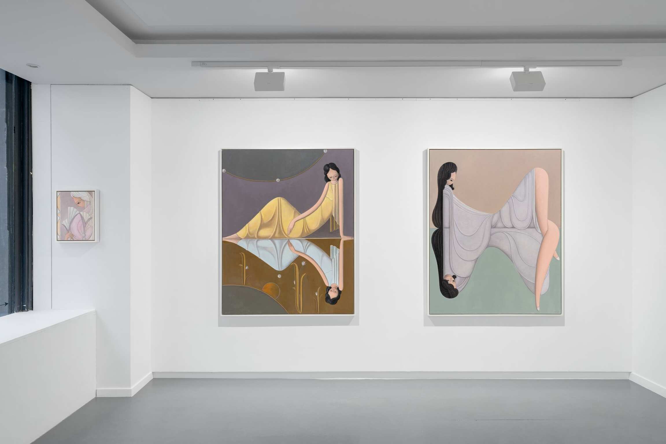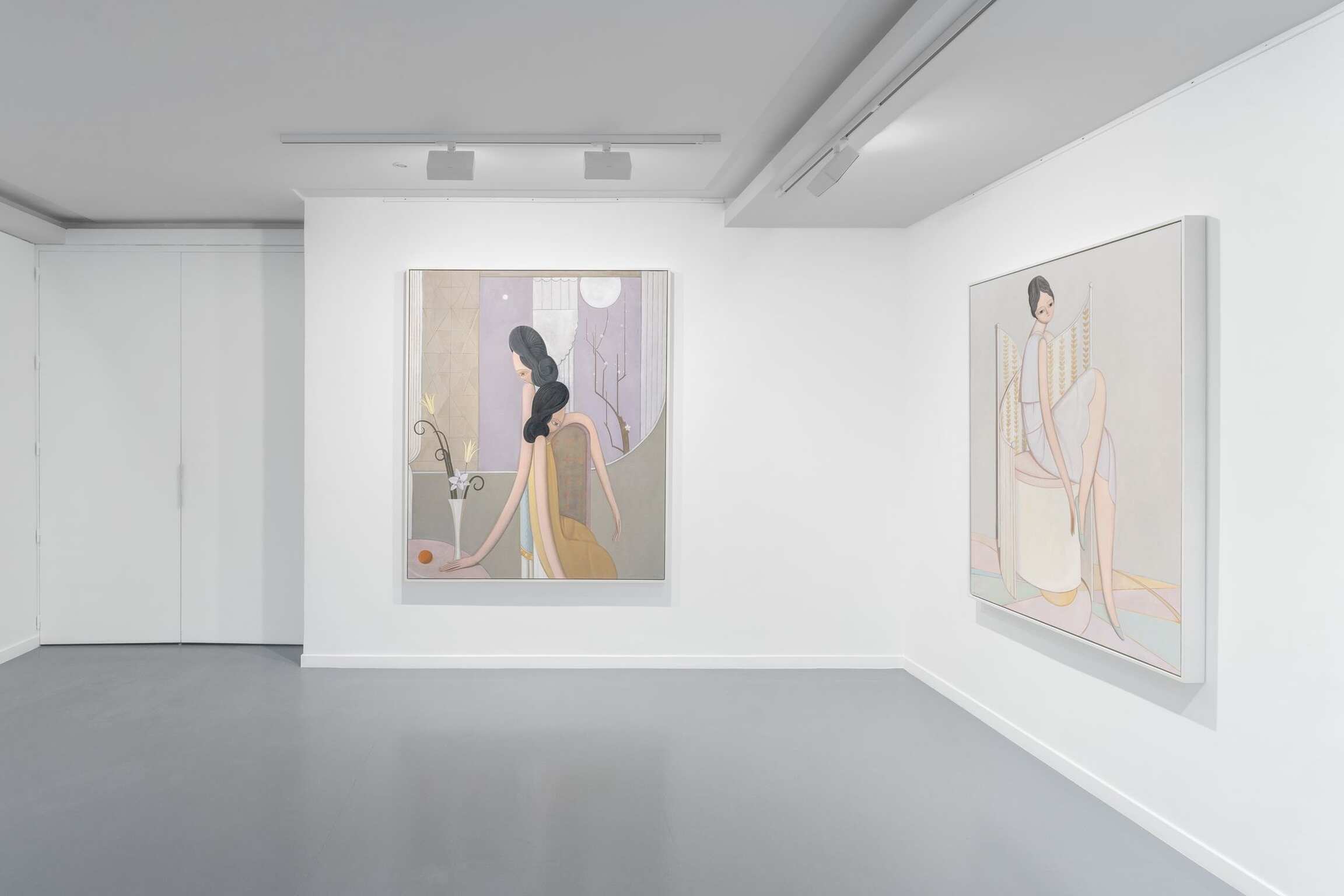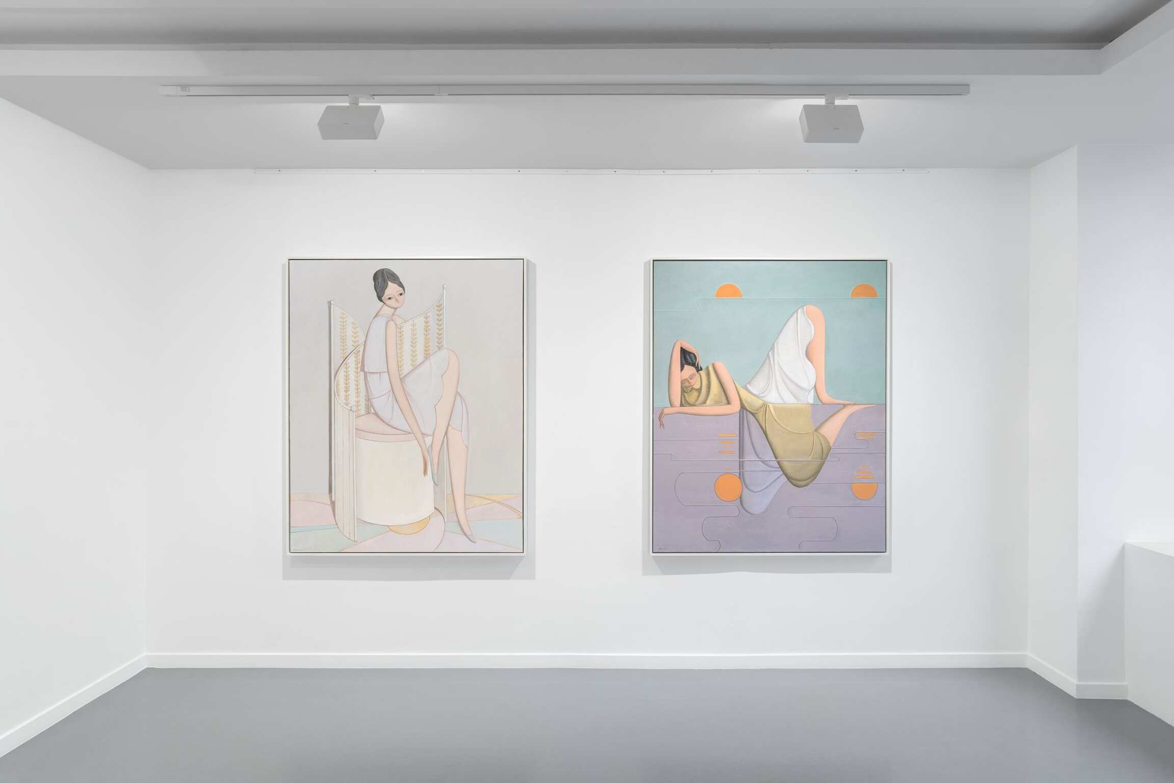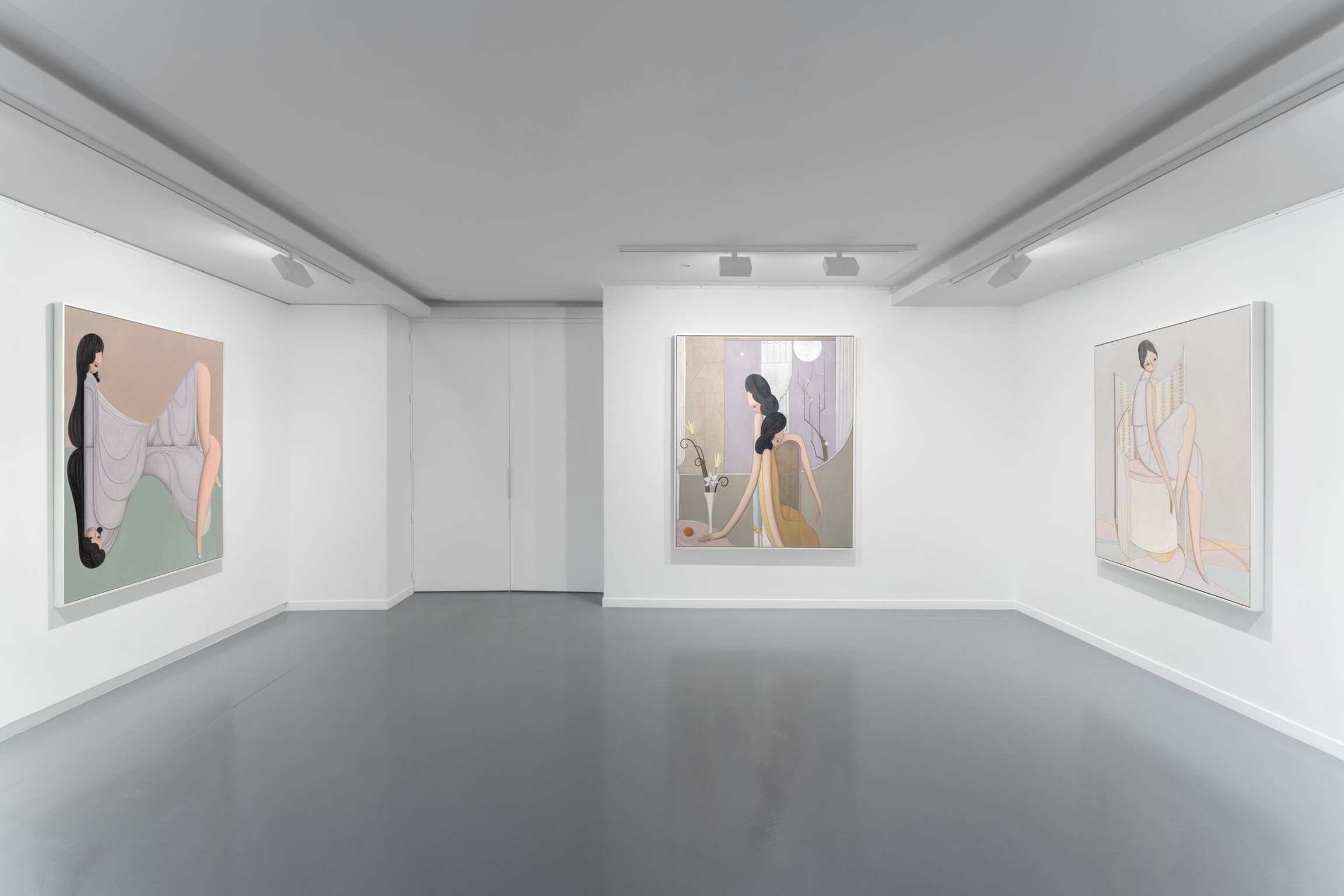 Ji Xin connaît par ailleurs les classiques de la peinture chinoise et une forme de tradition de la scène de genre qu’il aurait actualisée et épurée, ayant en mémoire les « Calendar Paintings », toujours populaires à Shanghai ou, si l’on remonte au 18ème siècle, les représentations de la Dynastie Qing, à l’exemple de celles de Leng Mei. Mais il aime encore davantage ceux qui ont nourri des ponts entre les cultures orientales et occidentales. Si Henri Matisse s’était laissé séduire par la calligraphie chinoise, on connaît peut-être moins en Europe Lin Fengmian, l’un des premiers artistes chinois à être venu étudier à Dijon, puis à Paris, de 1918 à 1925. Son doux style figuratif dépeignait des élégantes en intérieur ou entourées de fleurs. Quand SanYu, installé à Montparnasse dans les années 1920, et qui fut d’ailleurs l’ami de Matisse, représentait corps féminins et végétations dans des univers éthérés. Ji Xin cultive ce lien entre les deux mondes et, sans imposer de temporalité claire et reconnaissable, évoque pour ses protagonistes une retraite choisie et une solitude plus propice à la méditation qu’à la désillusion. Réalisées également avec ce qui peut l’entourer à l’atelier - tel élément de mobilier ou telle fleur qui renverra à une saisonnalité précise de l’année - les toiles s’imposent par leur quiétude. L’absence de multiplication d’ornements permet de concentrer le regard et la pensée sur le sujet de l’intimité et de tenter de comprendre la présence de cette figure ambigüe du double. Personnifie-t-elle le subconscient ou un guide spirituel ? Ou s’agit-il aussi d’une métaphore de l’acte créatif, poétique et d’une pensée qui, en nous échappant, valorise le dépassement de soi ?