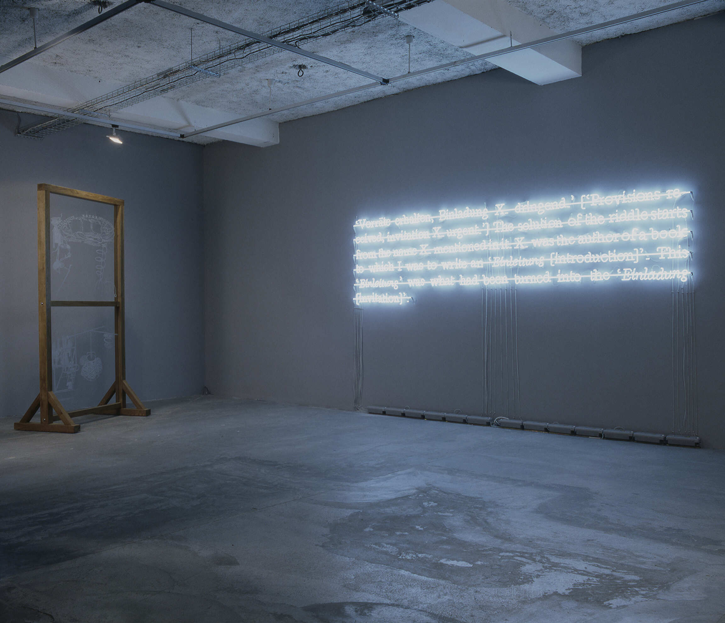 ~ An historical work by Joseph Kosuth titled ‘The Solution of the Riddle (Zero & Not)’. The paragraph employed in the work is from Sigmund Freud and was originally utilized in an exhibition at Leo Castelli Gallery in New York in 1986 as wall-paper printed for his celebrated installation at 112 Greene Street. The work for the present exhibition, a white neon work, is from 1987.
