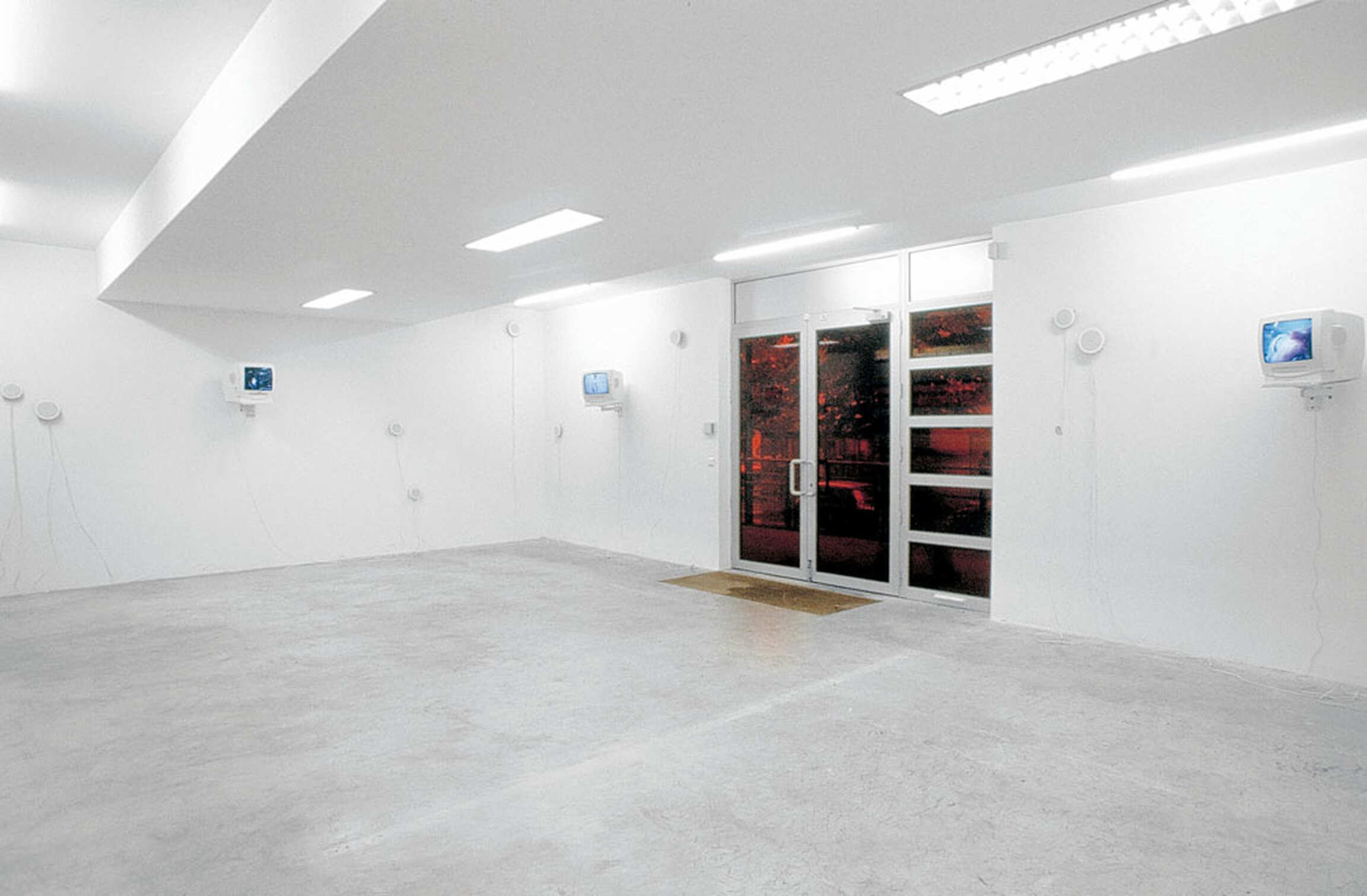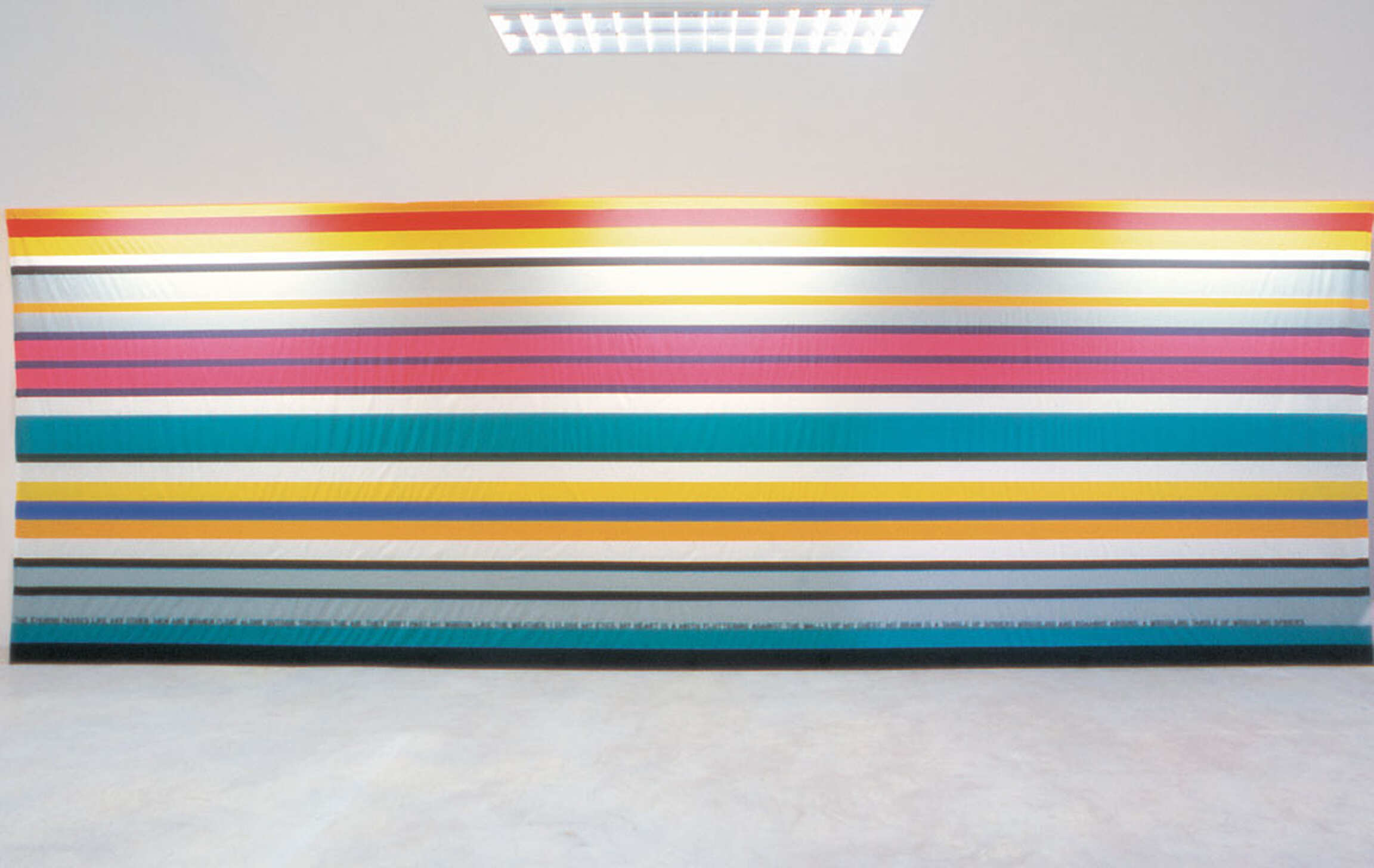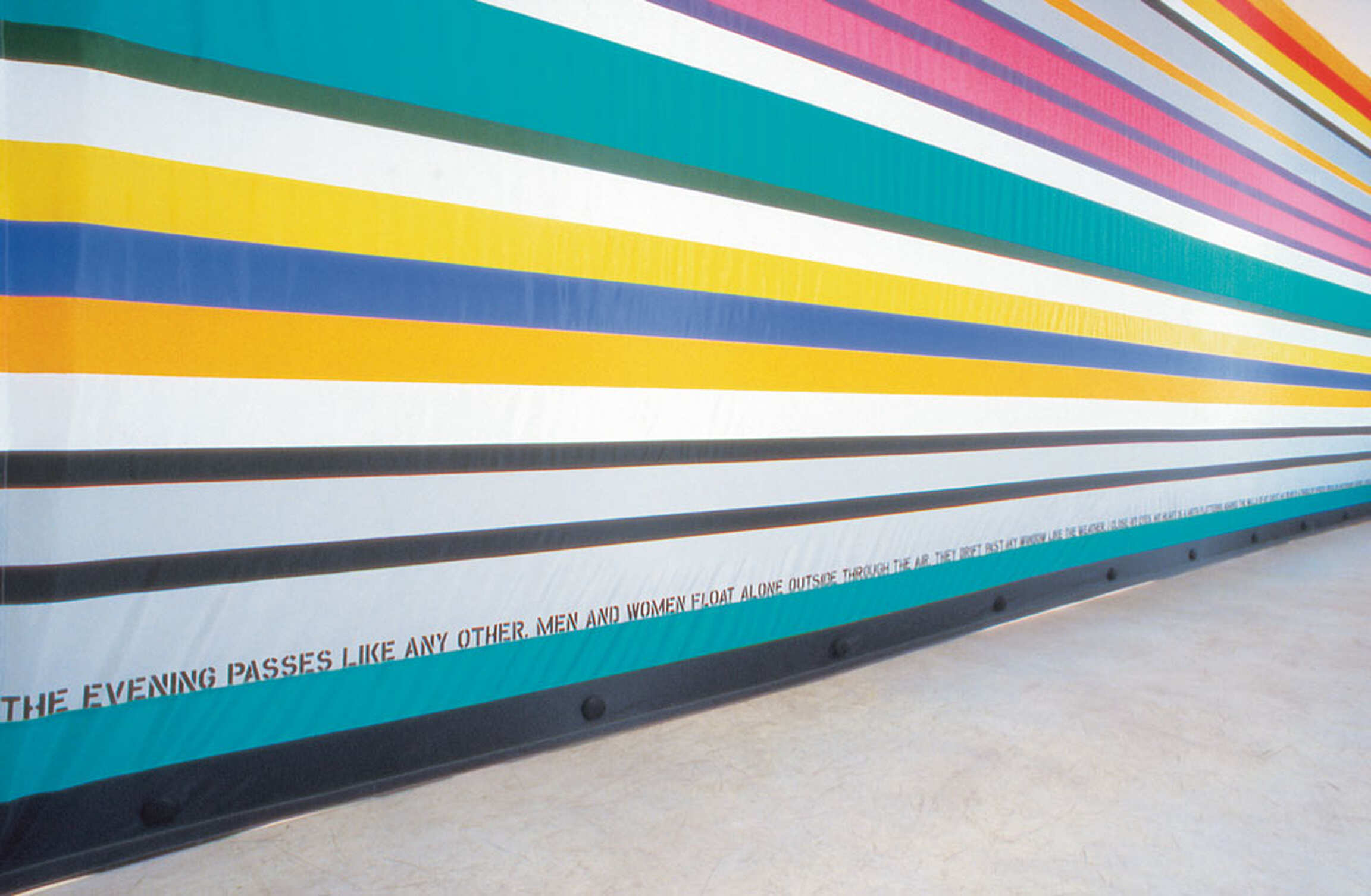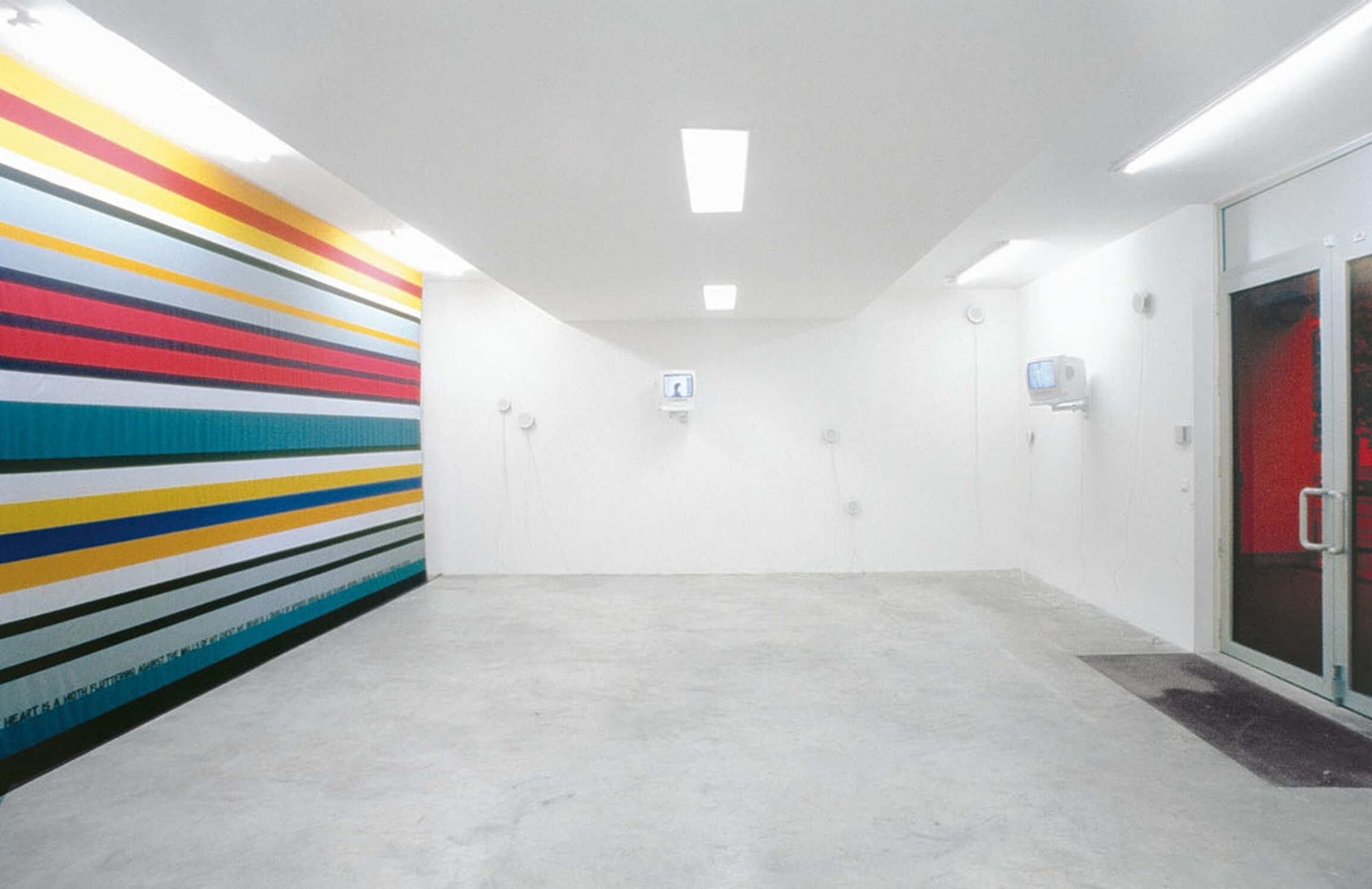 The Evening Passes Like Any Other was Ugo Rondinone's first solo exhibition with the gallery. In front of the colored and striped artwork covering the main wall of the gallery, the installation by the Swiss artist immersed the viewer into a meditative atmosphere. Since 1998, Ugo Rondinone has had seven solo exhibitions with the gallery.