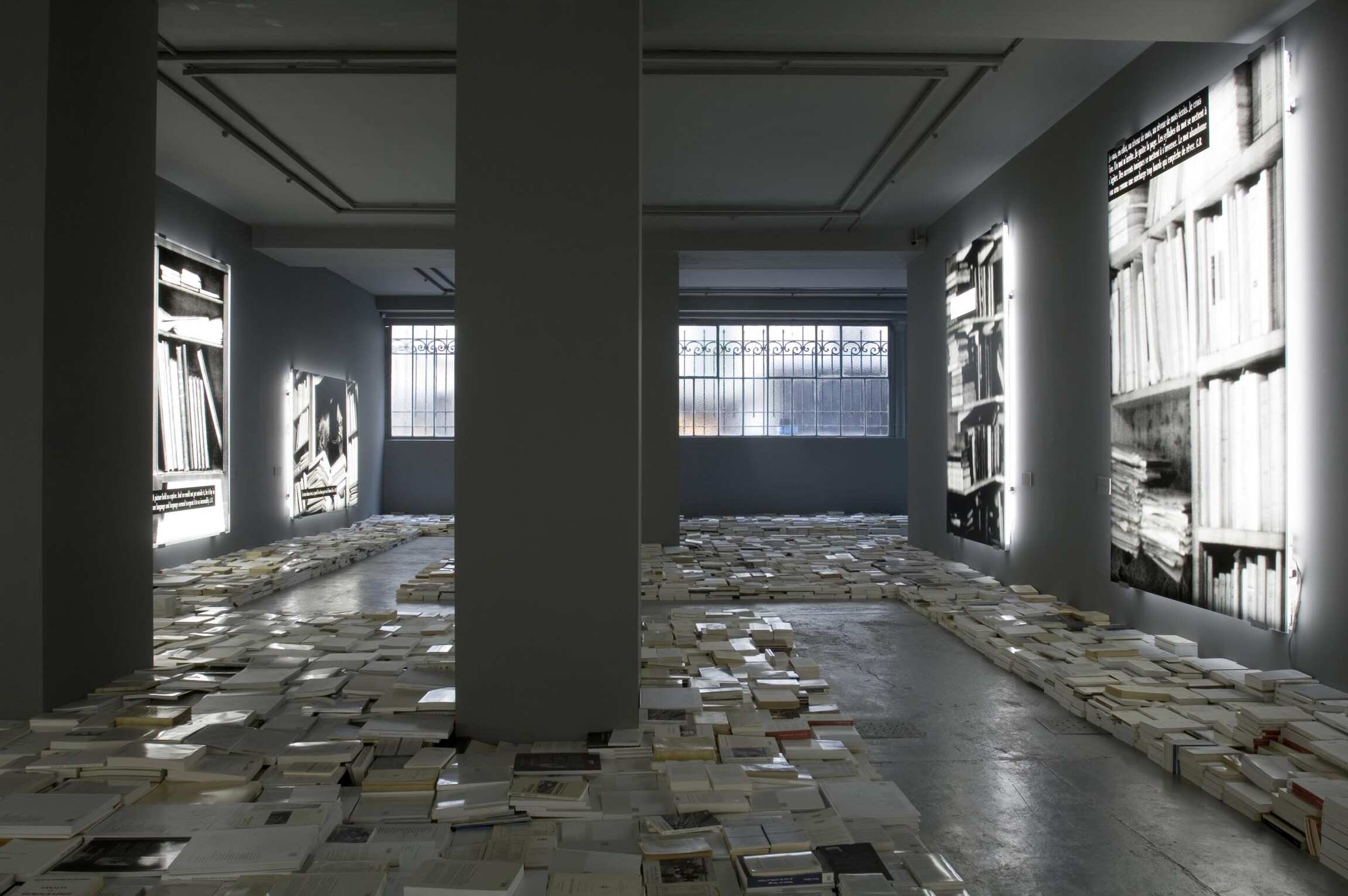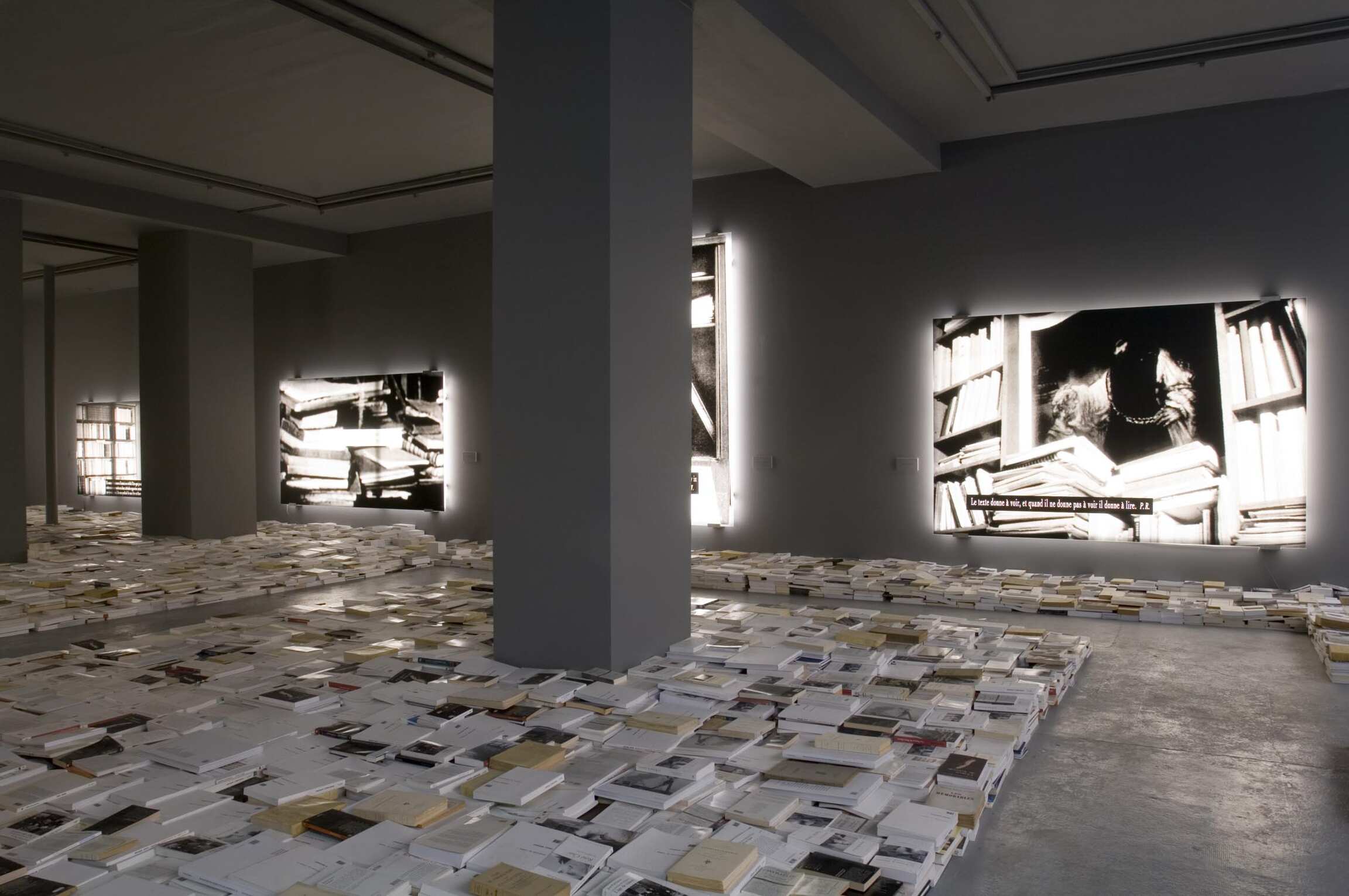 Pour l’installation qu’il expose à Paris, Joseph Kosuth se lance dans un travail tout à fait inédit, inscrit dans un environnement constitué exclusivement de textes, amorçant aussi un tout nouveau départ par rapport à ses activités récentes. On retrouve dans son installation des références à d’importantes œuvres de jeunesse telles que « The Information Room » (1969), que l’on a pu voir cette année à Art Unlimited à Bâle. Dans l’œuvre qu’il présente aujourd’hui, il fait se répondre un flot de texte, des photographies de bibliothèques de philosophes majeurs du XXème siècle, et des citations de ces derniers, lesquelles fournissent à Kosuth les signifiants caractéristiques de ses préoccupations en tant qu’artiste. Une des deux composantes de cette installation sont des œuvres sur verre illuminées par des néons blancs ; l’autre est un sol de livres qui donne son contexte à l’installation murale. Joseph Kosuth, l’artiste qui il y a plus de quarante ans fut à l’origine de l’exploitation du texte comme un matériau prêt à l’emploi, nous offre comme clé permettant de comprendre son œuvre cette citation de Michel Foucault, tirée d’un texte écrit peu après que Kosuth eut donné la première impulsion au courant qu’on nommerait ensuite Art Conceptuel : ‘Pour rêver, il ne faut pas fermer les yeux, il faut lire. La vraie image est connaissance. Ce sont des mots déjà dits, des recensions exactes, des masses d’informations minuscules, d’infimes parcelles de monuments et des reproductions de reproductions qui portent dans l’expérience moderne les pouvoirs de l’impossible. Il n’y a plus que la rumeur assidue de la répétition qui puisse nous transmettre ce qui n’a lieu qu’une fois. L’imaginaire ne se constitue pas contre le réel pour le nier ou le compenser ; il s’étend entre les signes, de livre à livre, dans l’interstice des redites et des commentaires ; il naît et se forme dans l’entre-deux des textes. C’est un phénomène de bibliothèque.’