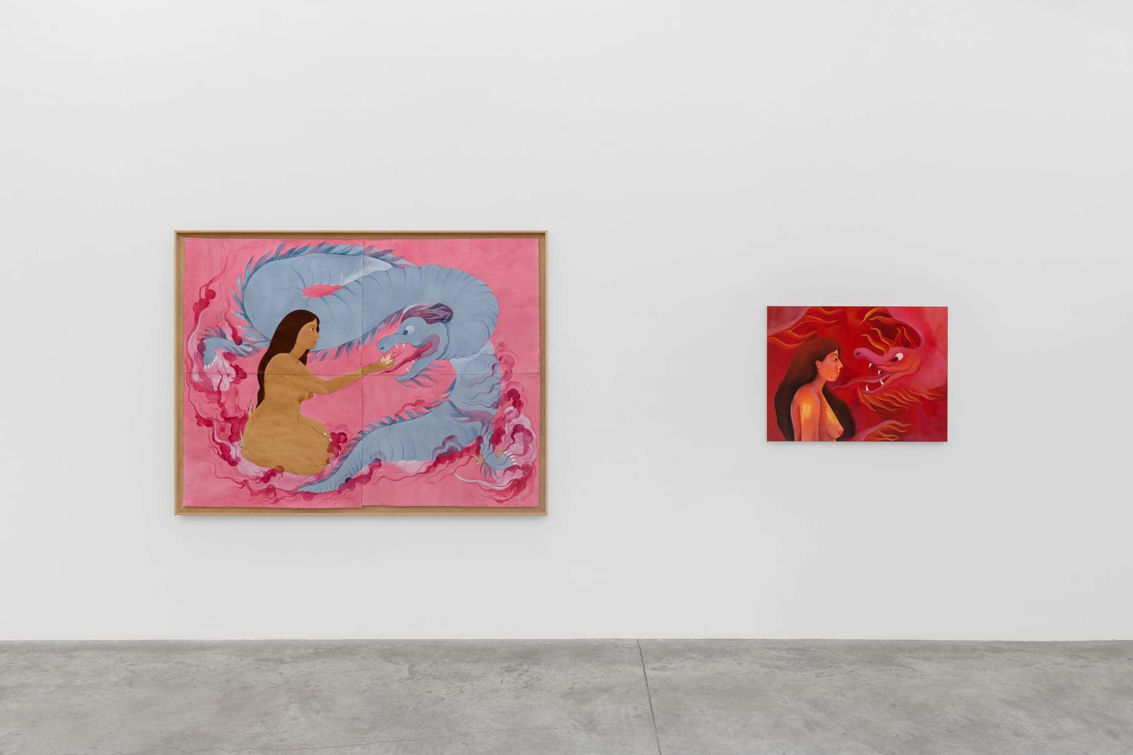La simple confrontation du personnage de Hiba Schahbaz avec le flamboyant dragon suffit à insuffler une suggestion sourde de figure hybride, femme-dragon/dragon-femme, entre incarnation terrestre et fabulation mythologique, une infinité de nuances qui trouveront à s’exprimer entre ces deux pôles – et qui semblent se jouer dans le face-à-face de In Your Eyes (2022), comme dans Love Song (2022) ou encore Magical Creatures (2022). Au fur et à mesure que l’on se plonge, dans leur relation, on comprend que Hiba et le Dragon ne sont pas seulement dans un rapport métamorphique fusionnel mais aussi dans un rapport d’hospitalité, d’alimentation et naturellement dans un rapport libidinal. Or la dimension subjective et féminine, voire autobiographique, instillée par Schahbaz, dans ses compositions, est totalement absente de la miniature traditionnelle ; elle en constitue même un vaste impensé ou territoire vierge sur lequel prend place l’art de Hiba Schhabaz.