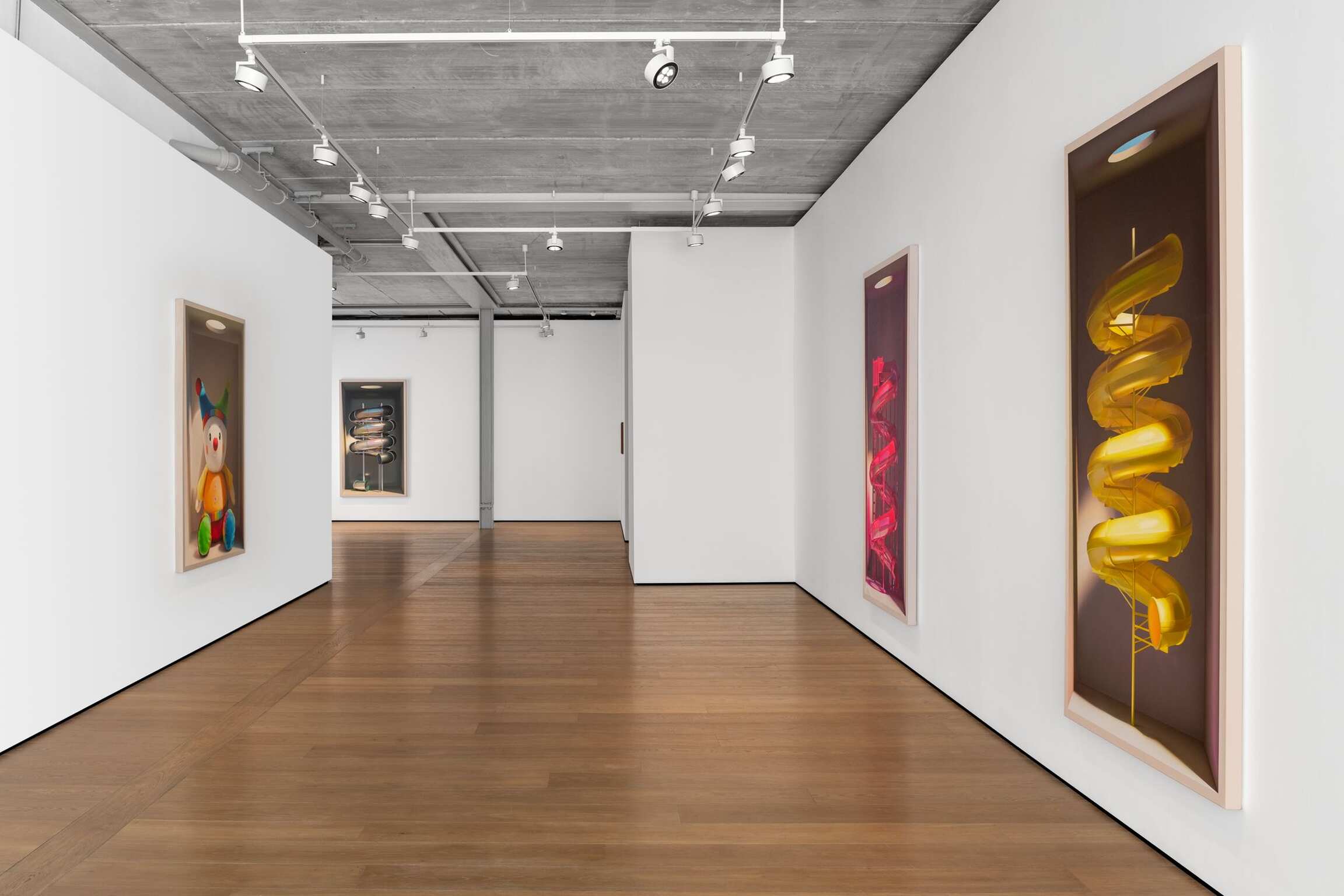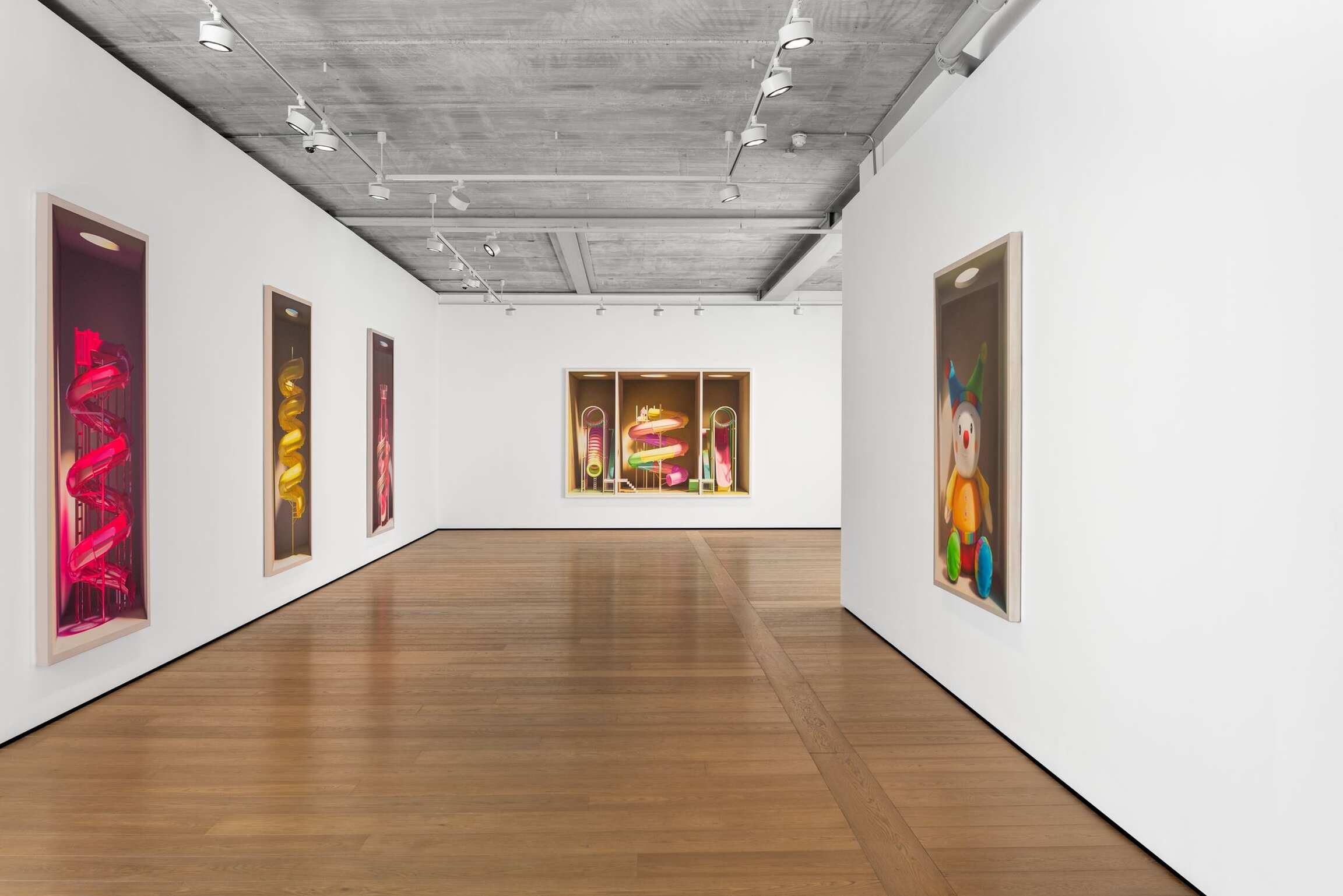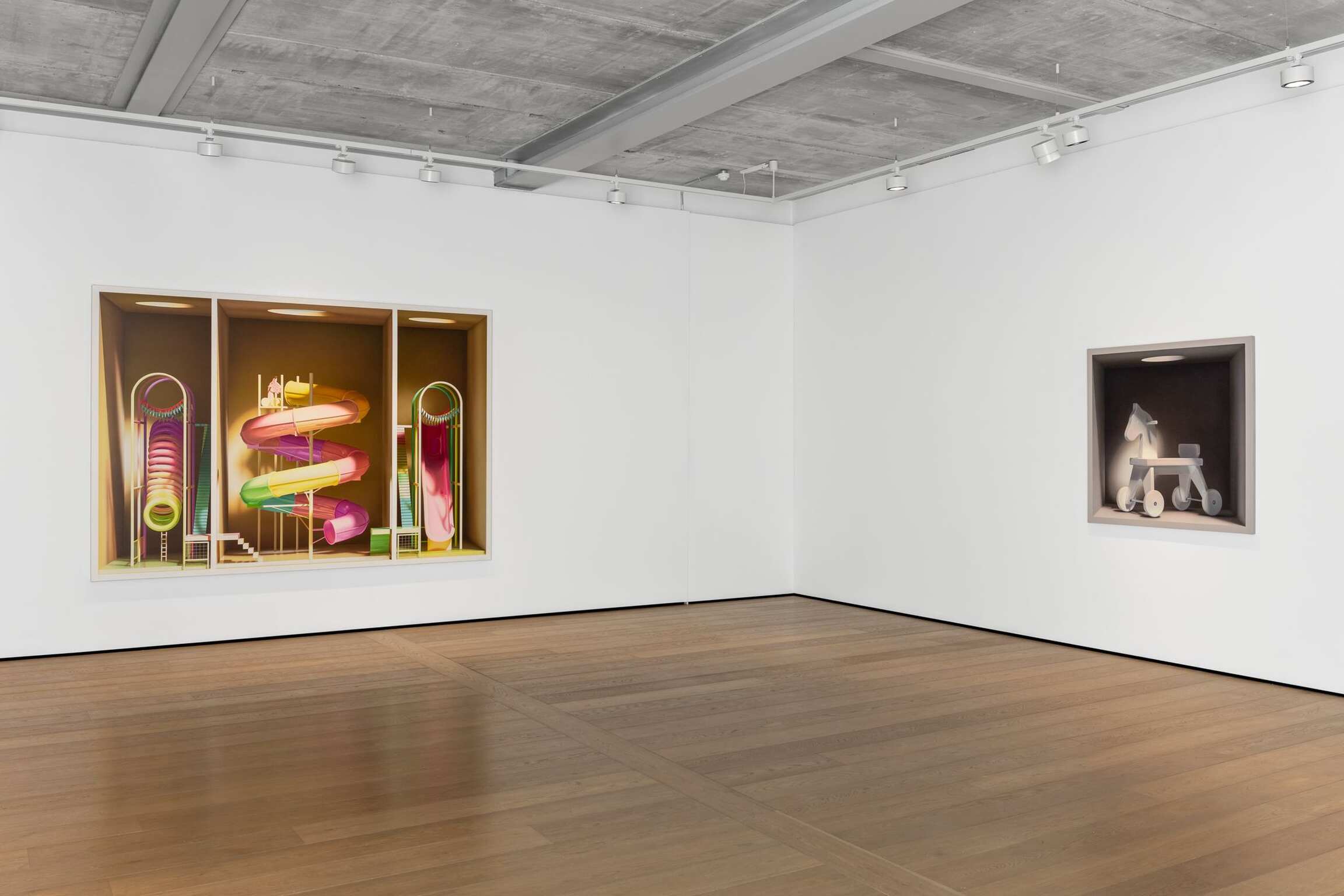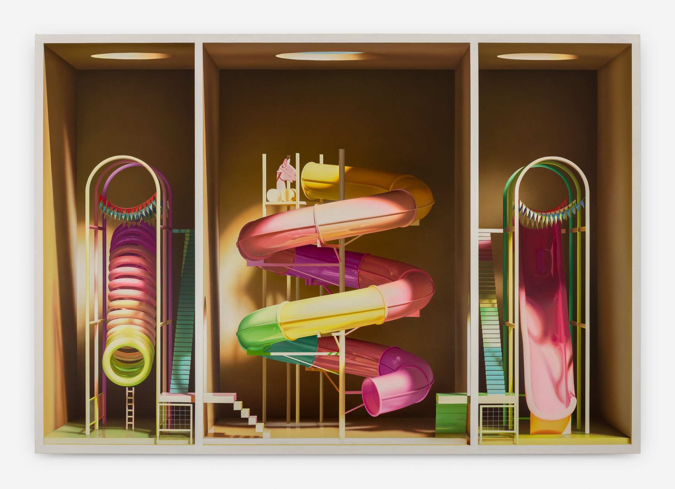 On the face of it, Mehdi Ghadyanloo’s current series of paintings is made up of a set of simple components: light and colour. The traditional components of painting. Plus boxes. Painted ones. Open to the front. Acting as a kind of frame. Traditional too you might say. And then, of course, there’s the deployment of all of these – light, colour, boxes – to create the illusion of an enclosed, three-dimensional space. Often toplit via a circular opening in the box. A spotlight of sorts. And in the boxes, beneath the light are a series of brightly coloured children’s toys, and playground slides and rides (configured in ways that are invented by the artist), all depicted as if, well, thanks to the artist’s skill at creating trompe l’œil, fresh out of the box.