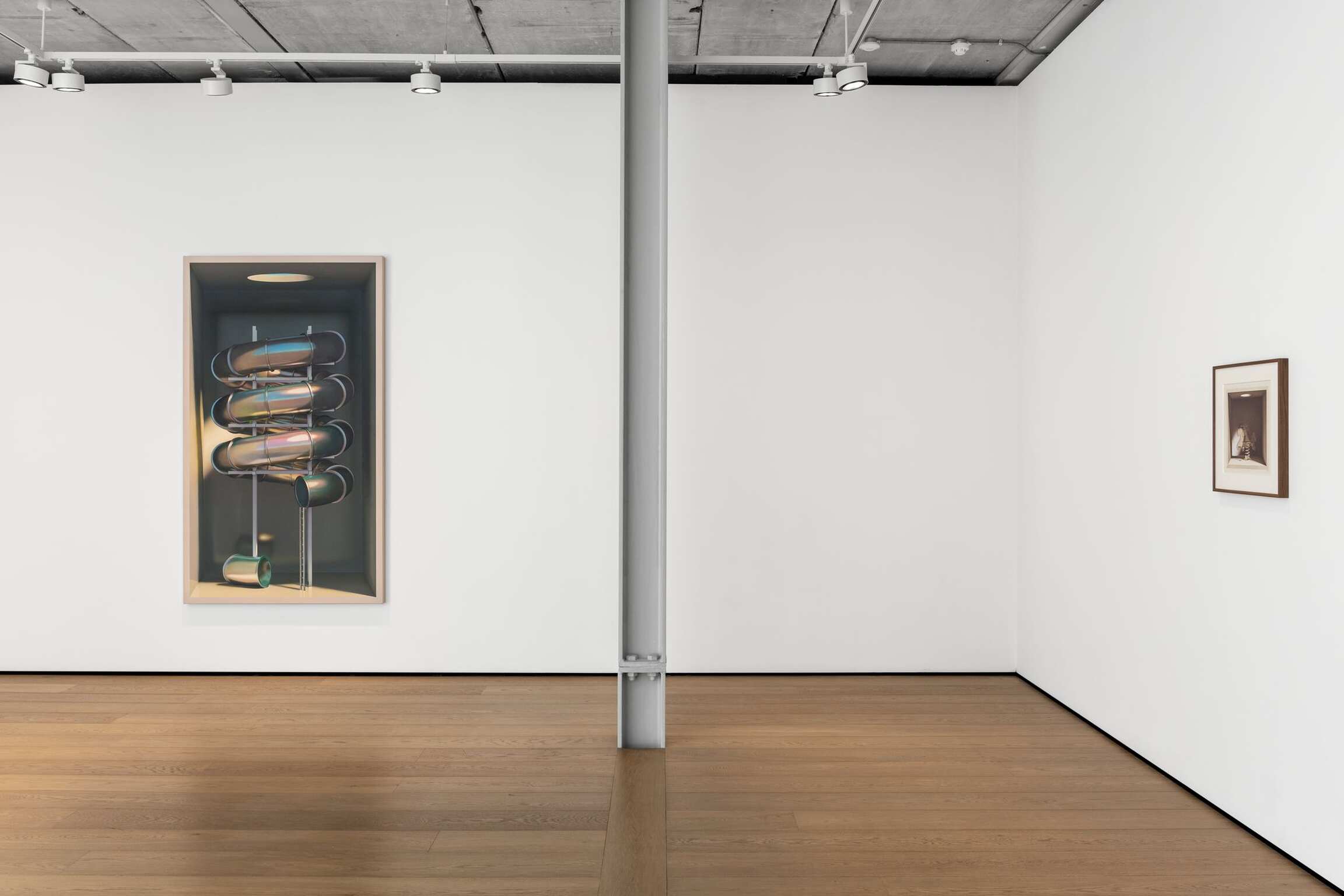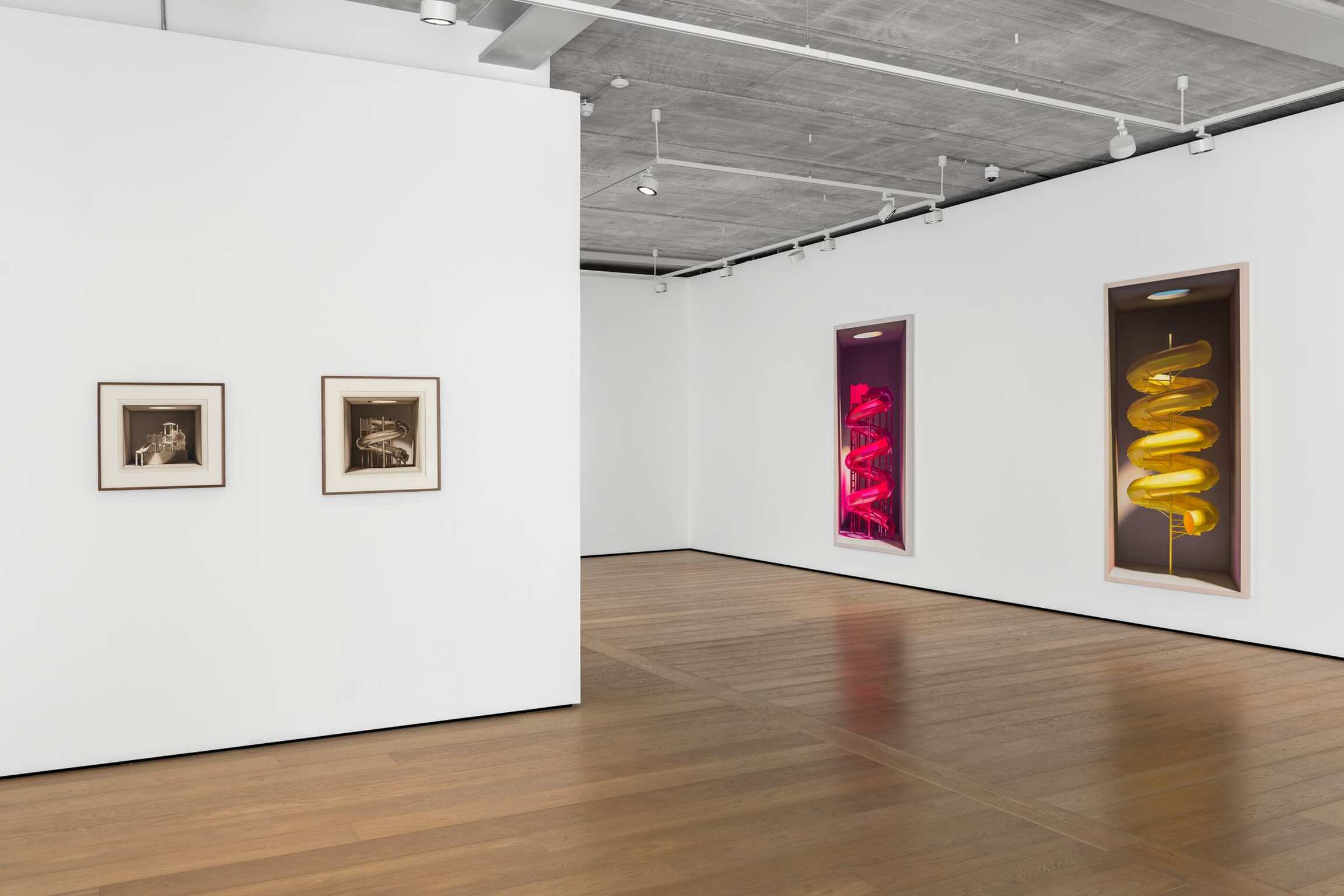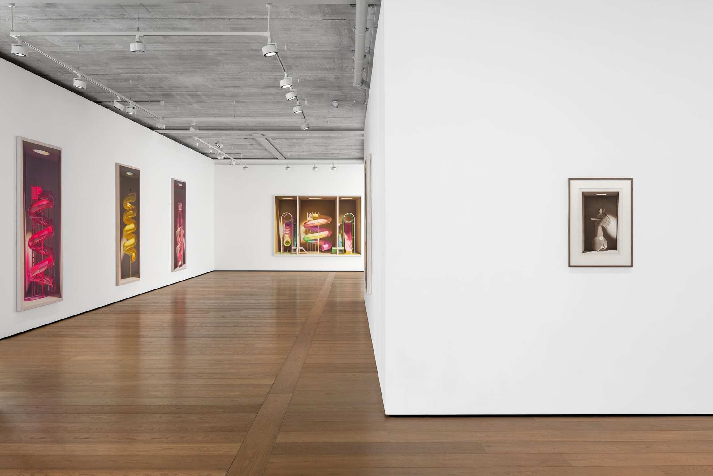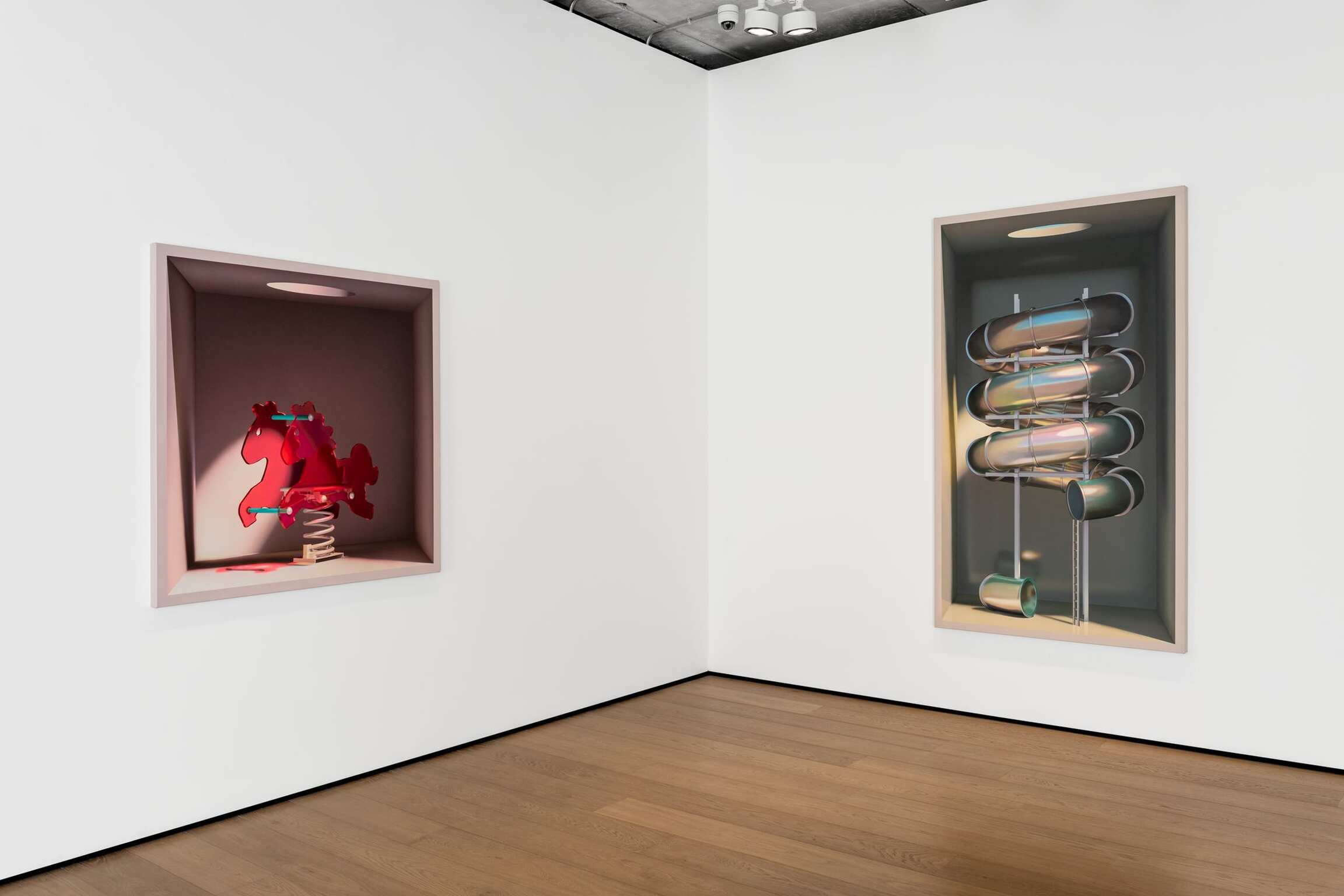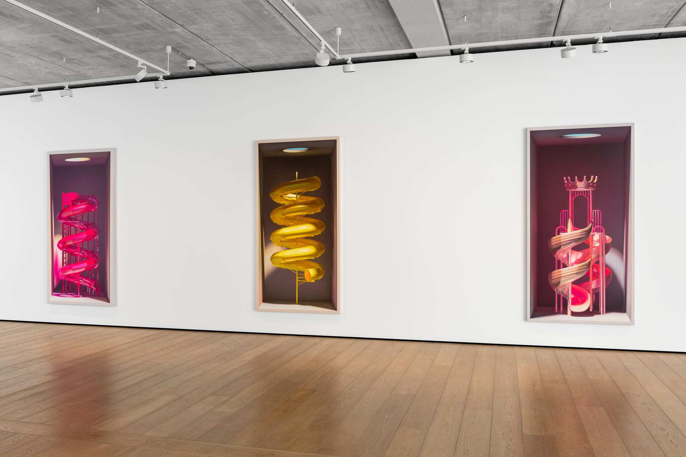 On the face of it, Mehdi Ghadyanloo’s current series of paintings is made up of a set of simple components: light and colour. The traditional components of painting. Plus boxes. Painted ones. Open to the front. Acting as a kind of frame. Traditional too you might say. And then, of course, there’s the deployment of all of these – light, colour, boxes – to create the illusion of an enclosed, three-dimensional space. Often toplit via a circular opening in the box. A spotlight of sorts. And in the boxes, beneath the light are a series of brightly coloured children’s toys, and playground slides and rides (configured in ways that are invented by the artist), all depicted as if, well, thanks to the artist’s skill at creating trompe l’œil, fresh out of the box.