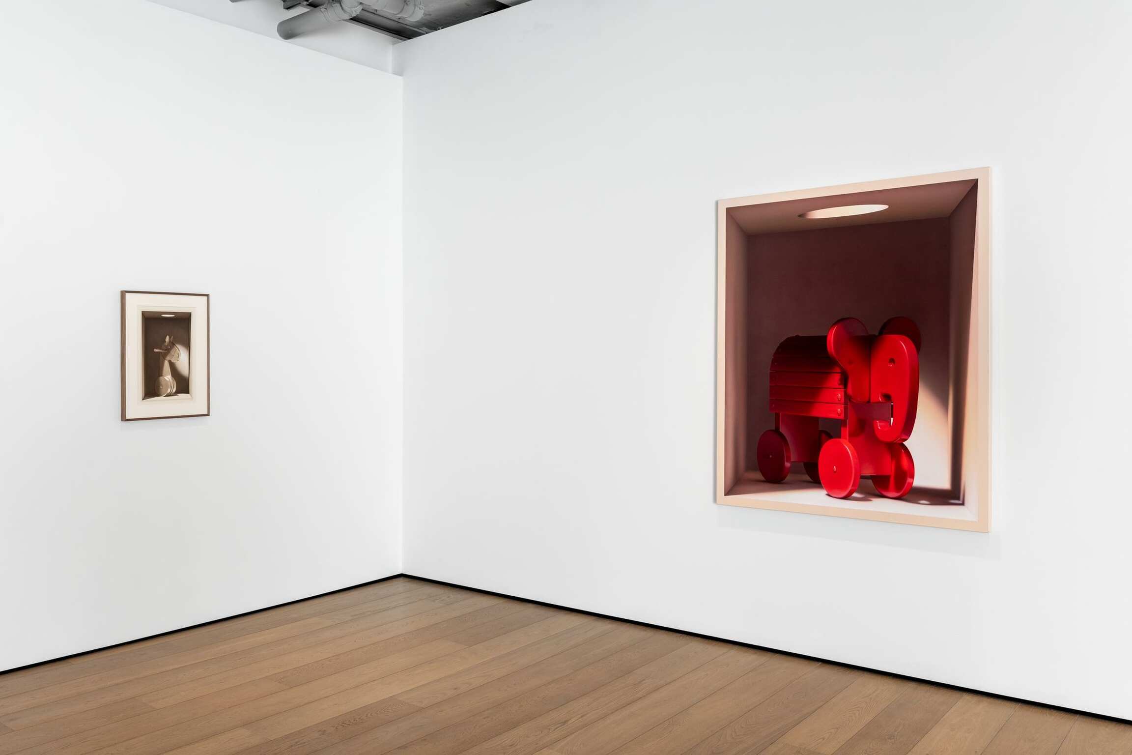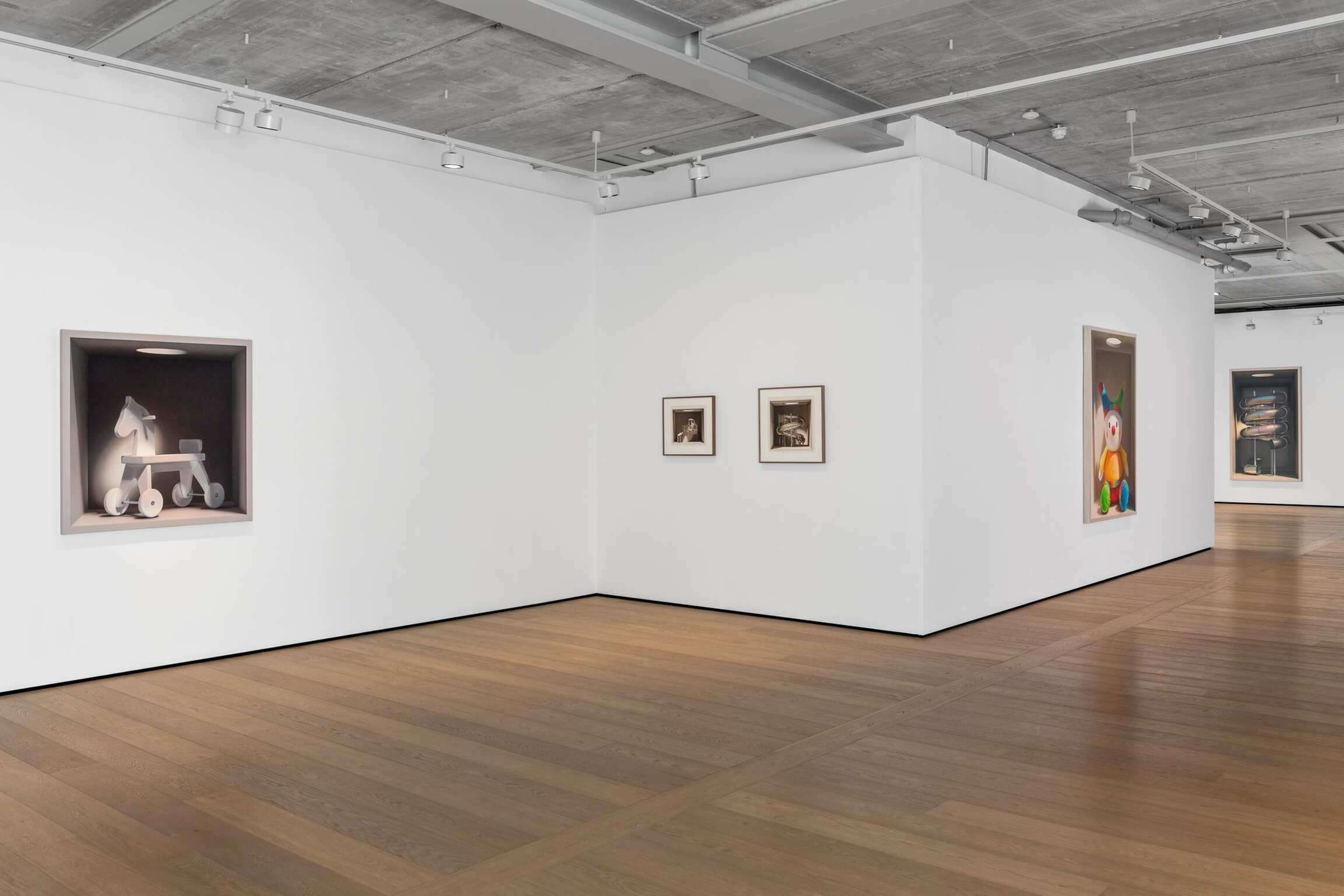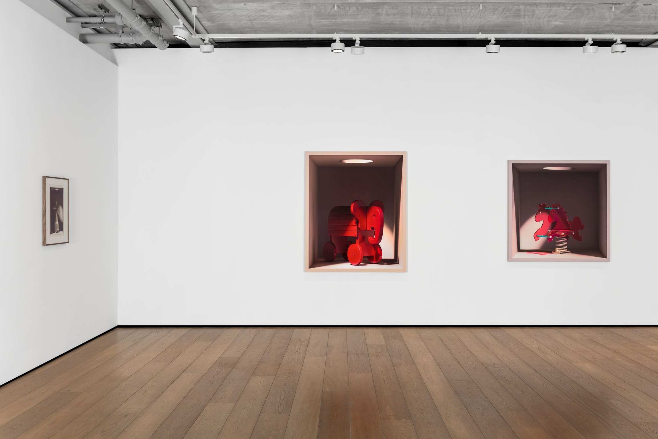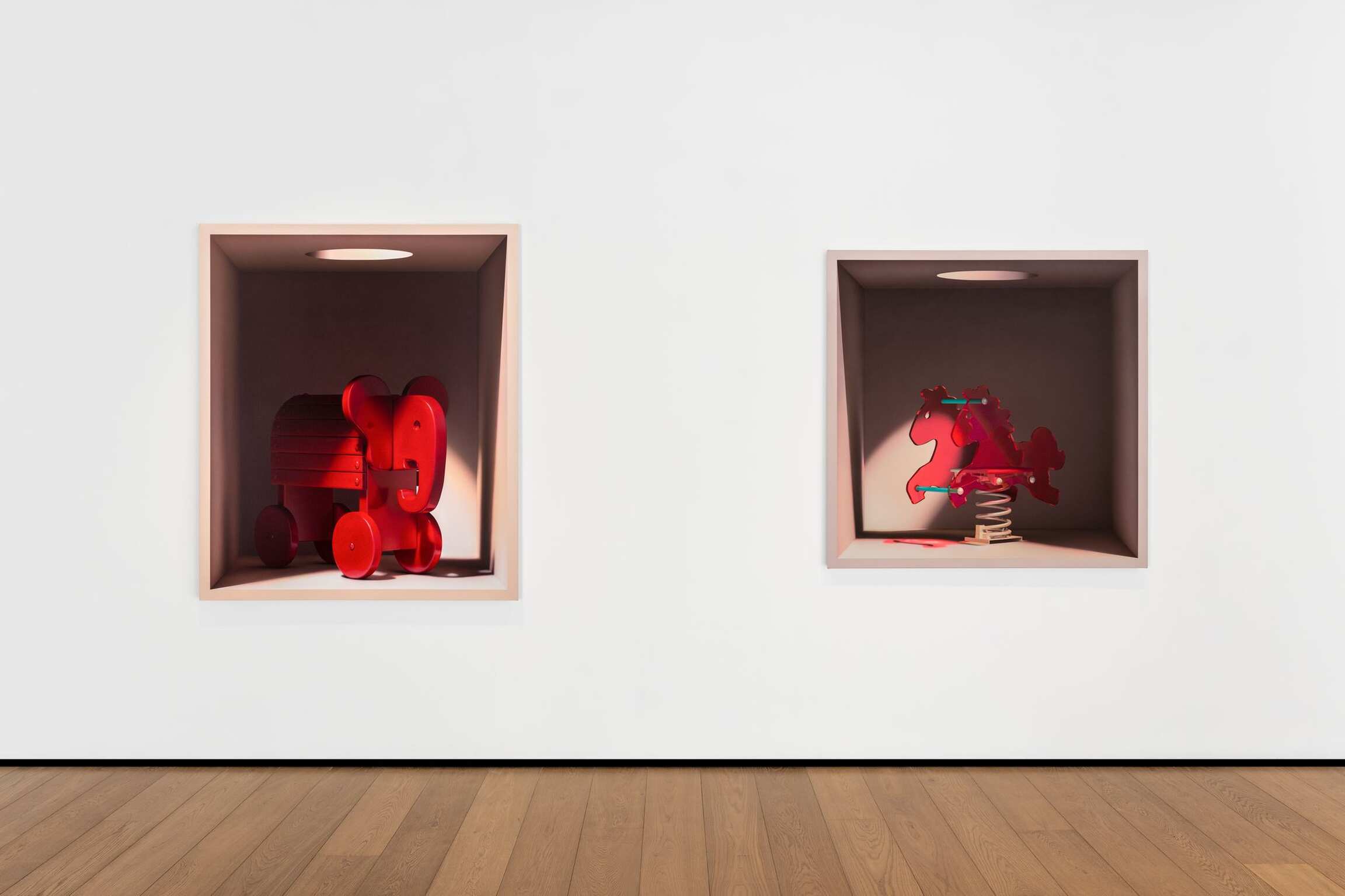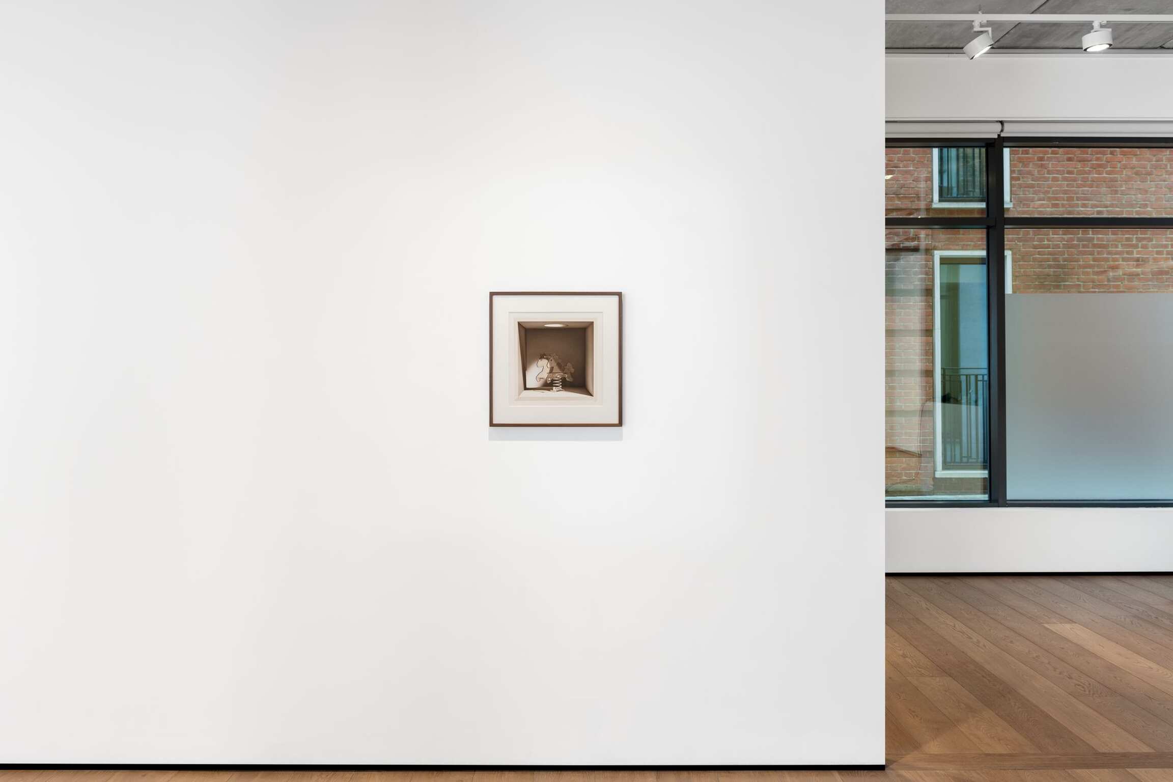 There’s a grinning, plush, child’s clown, its colourful outfit allaying any fears of any It-like manifestation. A song of innocence if you like. Other boxes contain a toy elephant on wheels painted in a slickly glossy red, or a white, wooden horse of similar design. Or a more modern playground horse made up of translucent plastic-looking silhouettes mounted on a coiled spring. Another variant offers a kind of aluminium-looking unicycle from which rears a horse’s head. And the handles that make it ridable. For all that they are enclosed, at times even claustrophobic, the boxes also offer a space of fantasy. A space of play. A memorial to the joys of childhood. A form of nostalgia for those of us who are adults. Or hope for those of us who think the time for play is at an end.
