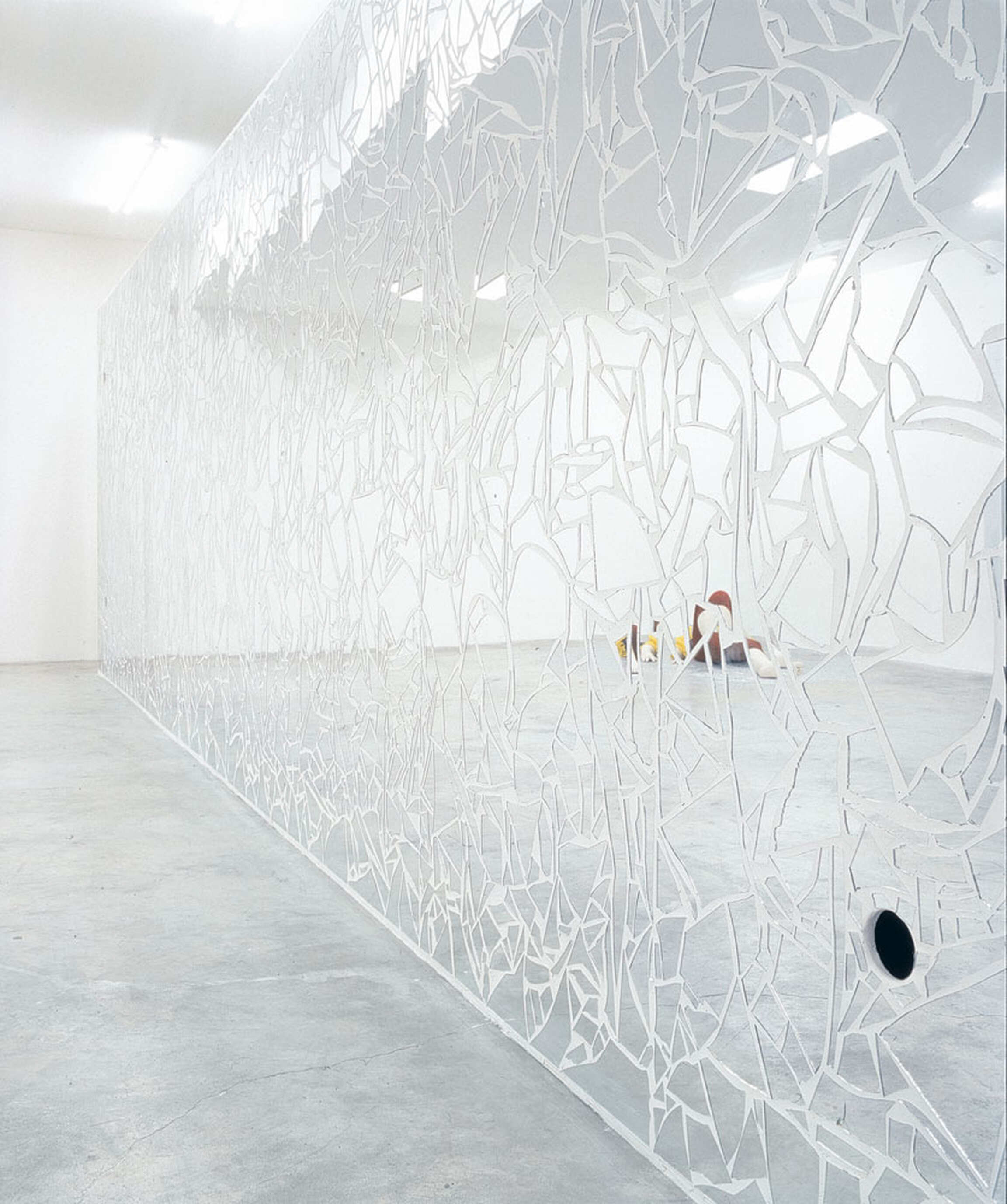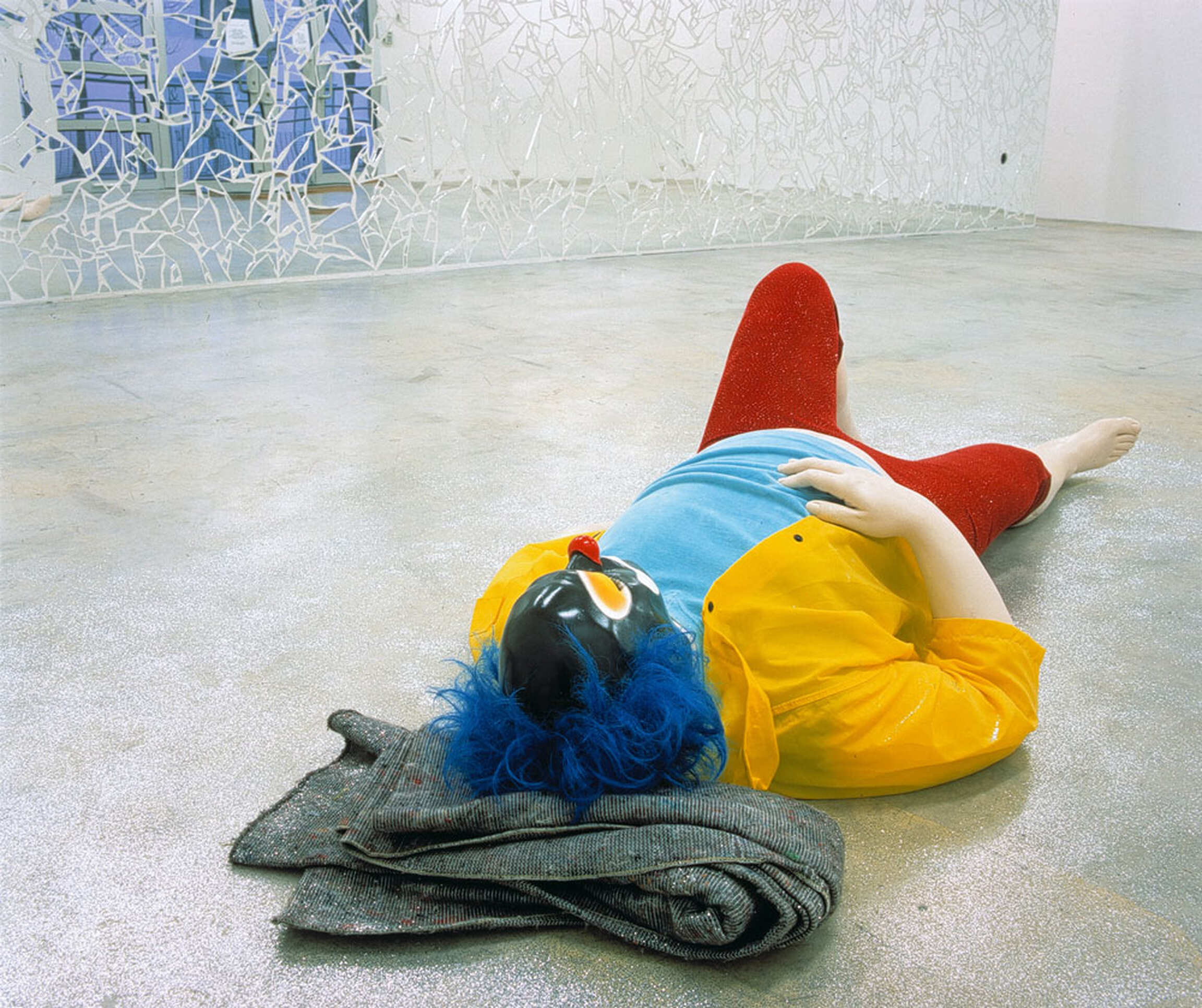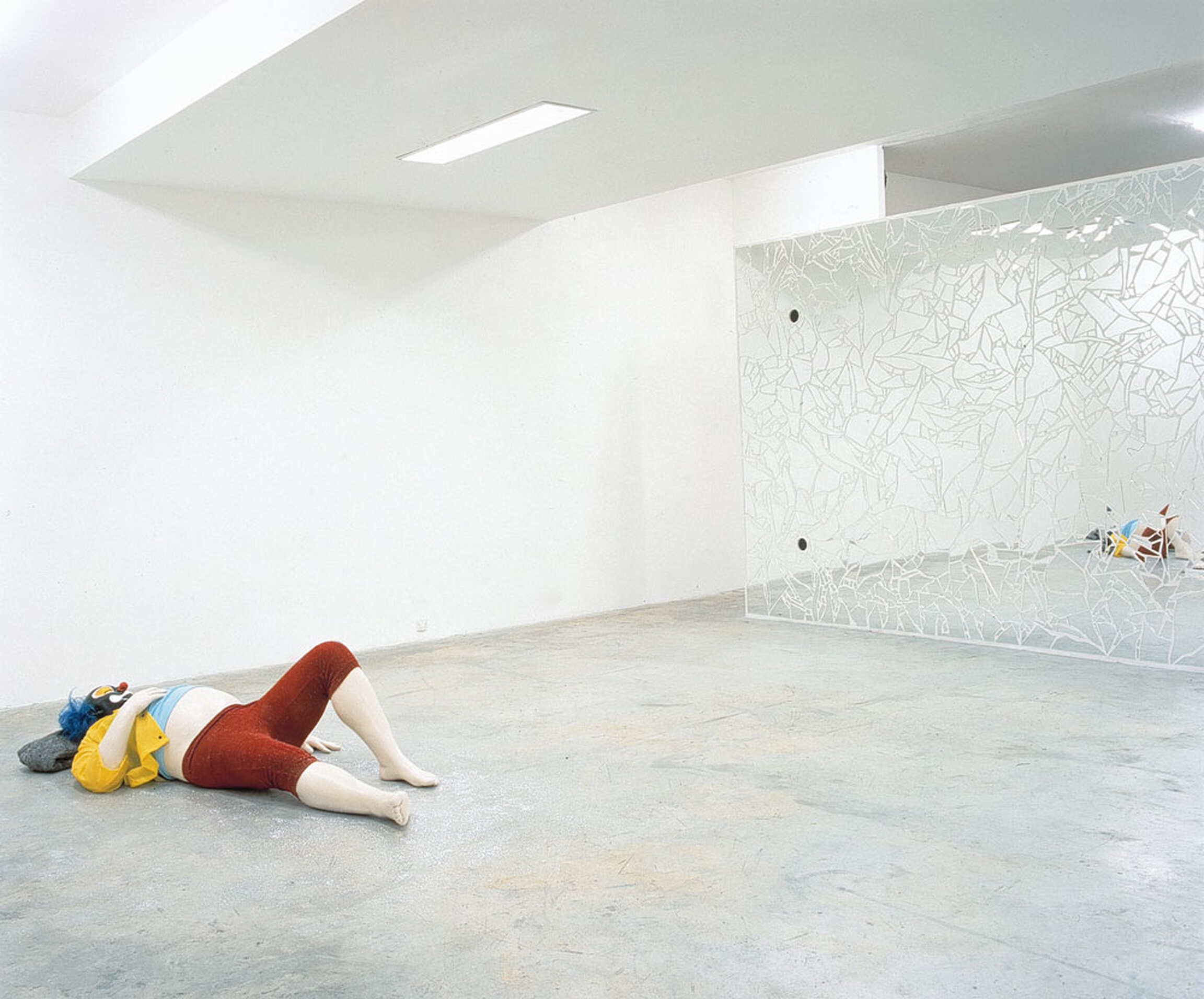 The clown is a leitmotif in Ugo Rondione's diverse oeuvre. Since 1992, this circus mainstay has regularly made its appearance in his performances, video recordings, installations, paintings, photographs, and sculpture. "This artist's recent clown sculptures, entitled If There Were Anywhere But Desert, are laidback to the point of inertia-seemingly asleep or drugged. But they are not entirely lifeless. Part effigy, part golem, these creatures generate such a powerful sense of alienation that they leave us who venture into Rondinone's installations feeling cut off from iur susual terms of reference, our usual selves. (...) As I looked at the reflections of myself and the somnolent clown in the reflective network of Rondinone's mirrored wall and listened to his endlessly repeated diary entries, I felt greateful to him for following in the step of Lord Patchogue. I would never have had the nerve." - John Richardson in Rencontres 5, published by Editions Images Modernes/Almine Rech Gallery Editions.