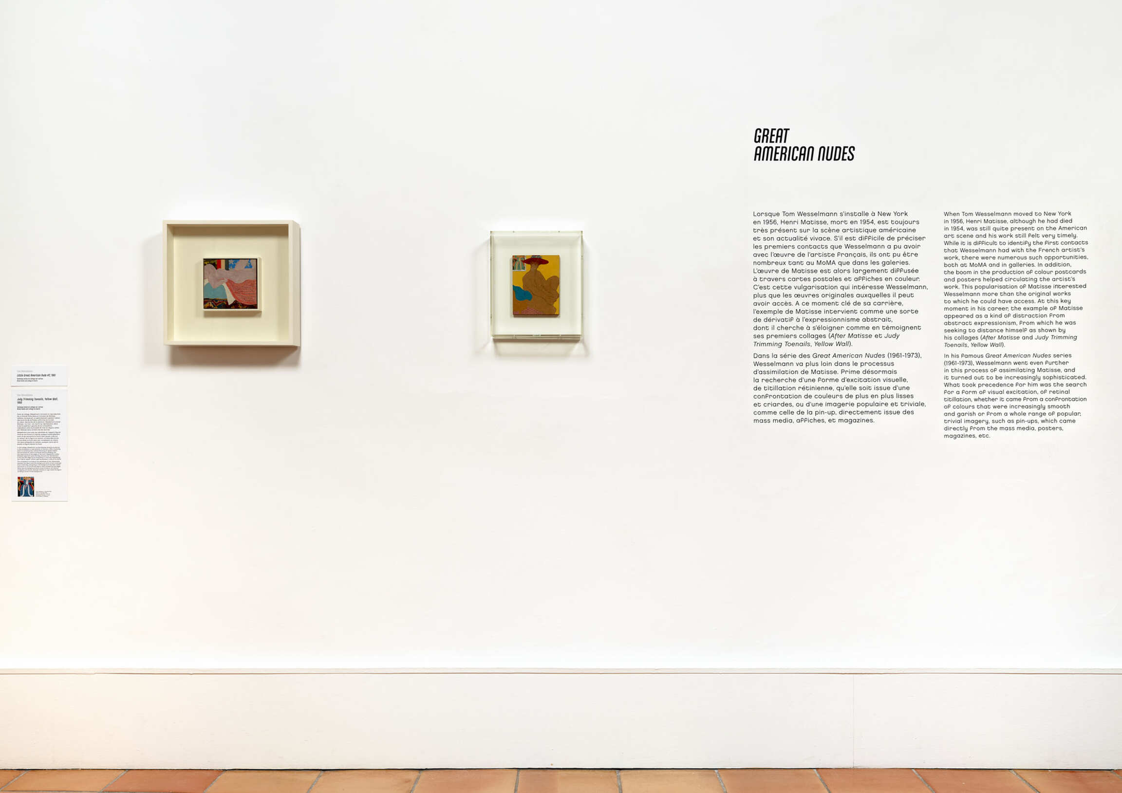 Dans sa présentation l’exposition s’attache à montrer Wesselmann à l’atelier, à comprendre sa technique élaborée du collage ou du dessin en volume qui attache toujours une grande importance à la question de l’échelle, des plus petits formats à de vastes réalisations. Elle réunit quatre grands ensembles significatifs qui témoignent de ce dialogue entre ce grand artiste pop américain et Henri Matisse : les collages, les Great American Nudes, les Steel Drawings et les Sunset Nudes.