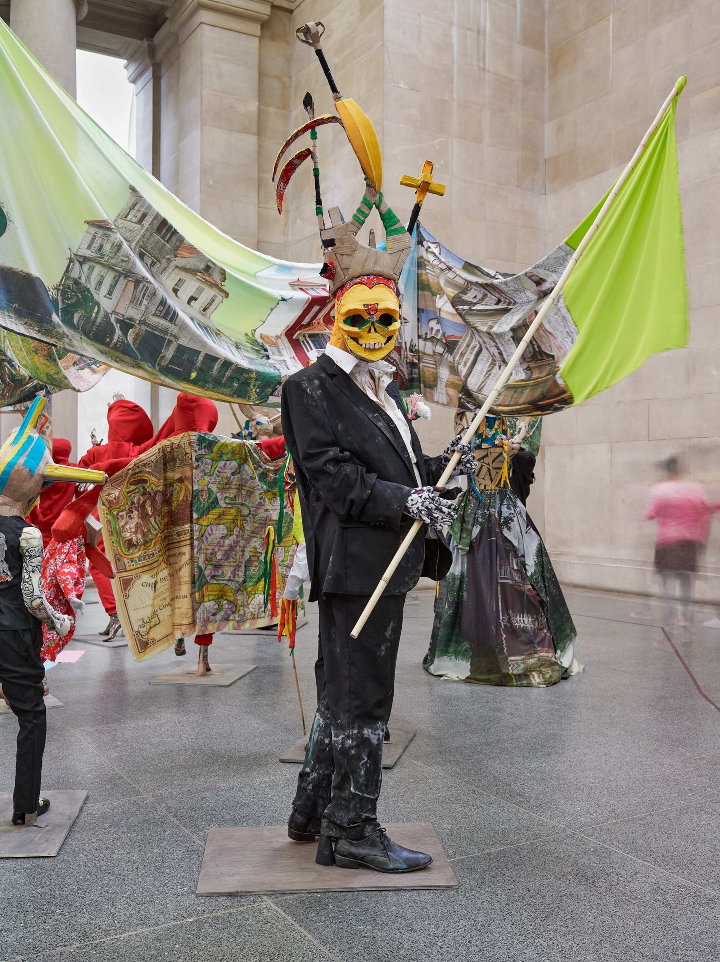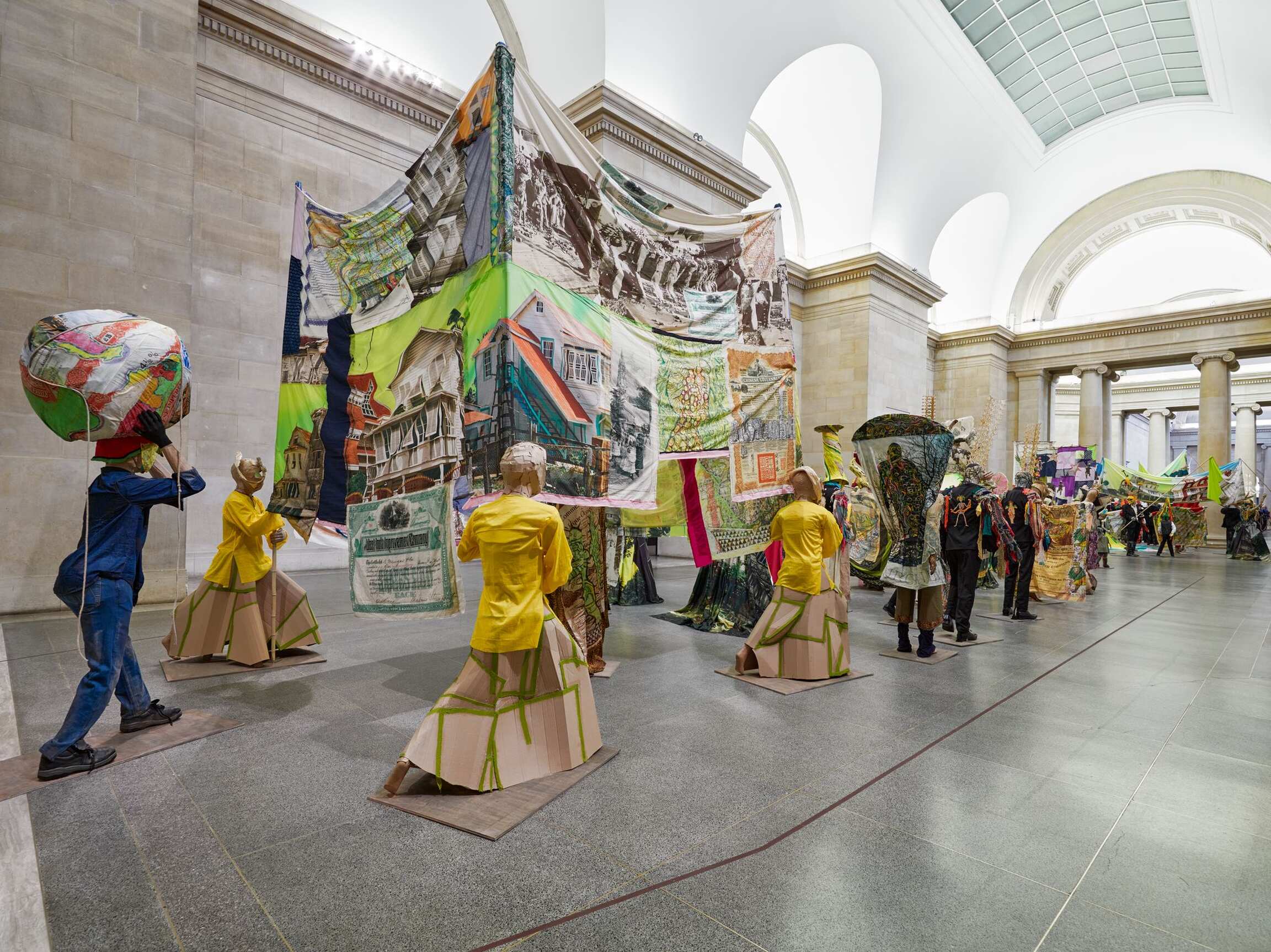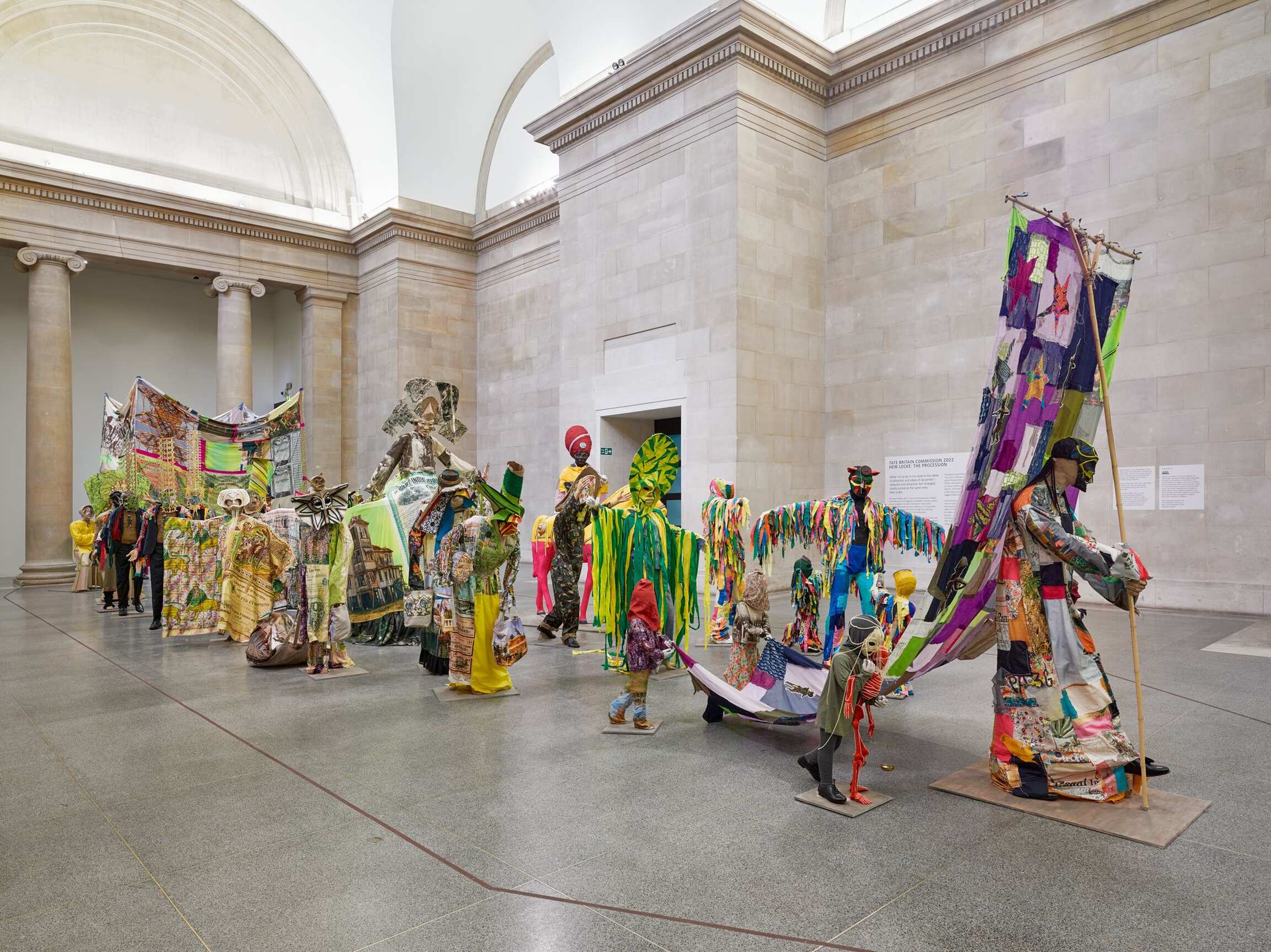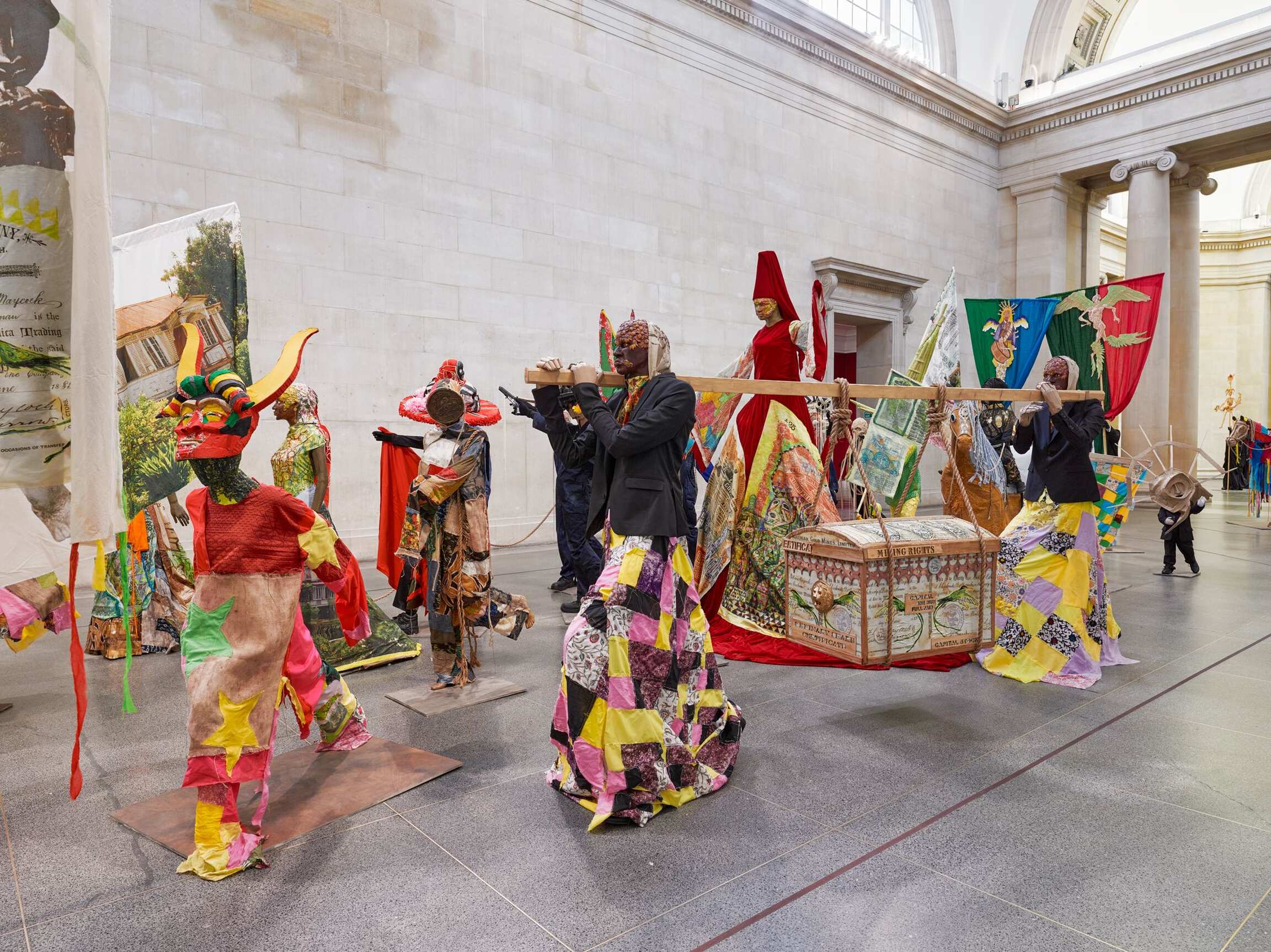 The Procession invites visitors to ‘reflect on the cycles of history, and the ebb and flow of cultures, people and finance and power.’ Tate Britain’s founder was art lover and sugar refining magnate Henry Tate. In the installation Locke says he ‘makes links with the historical after-effects of the sugar business, almost drawing out of the walls of the building,’ also revisiting his artistic journey so far, including for example work with statues, share certificates, cardboard, rising sea levels, Carnival and the military.