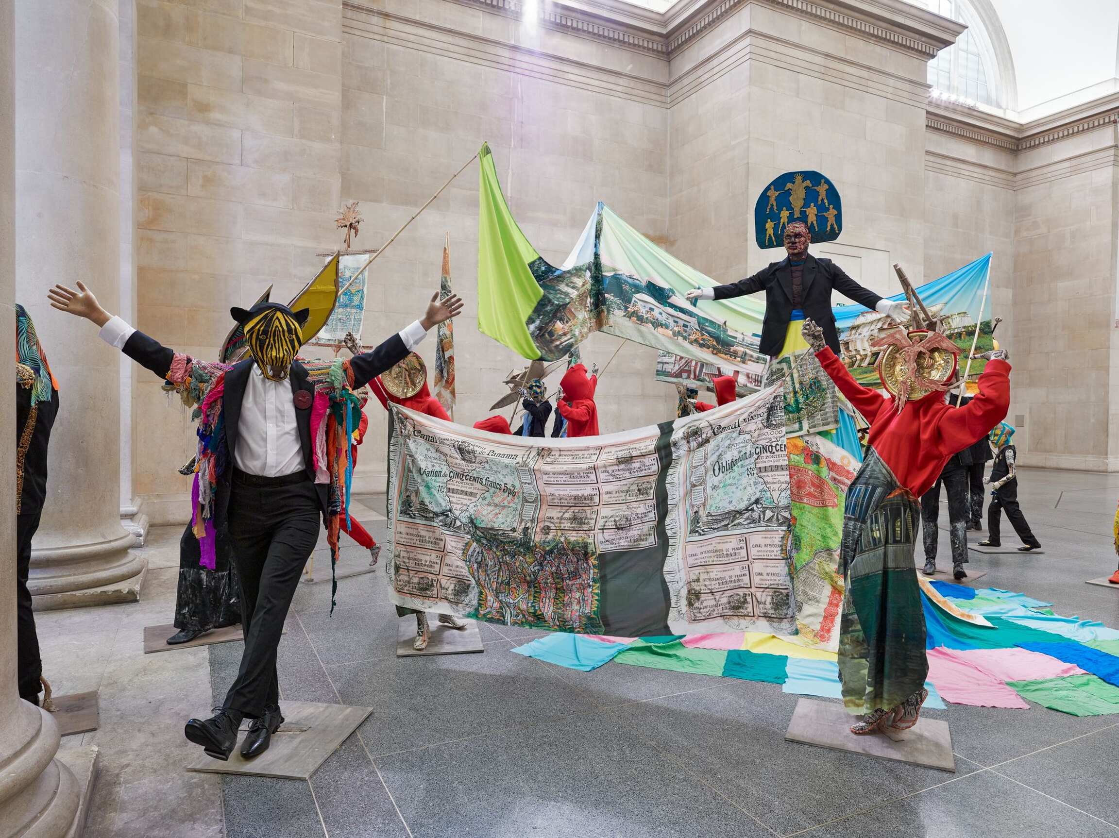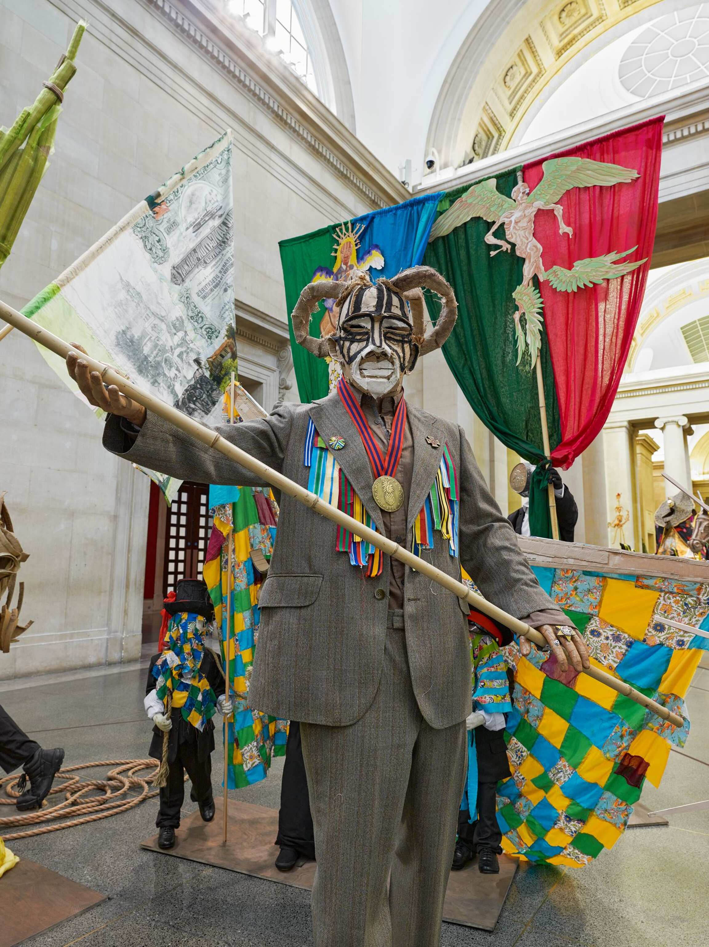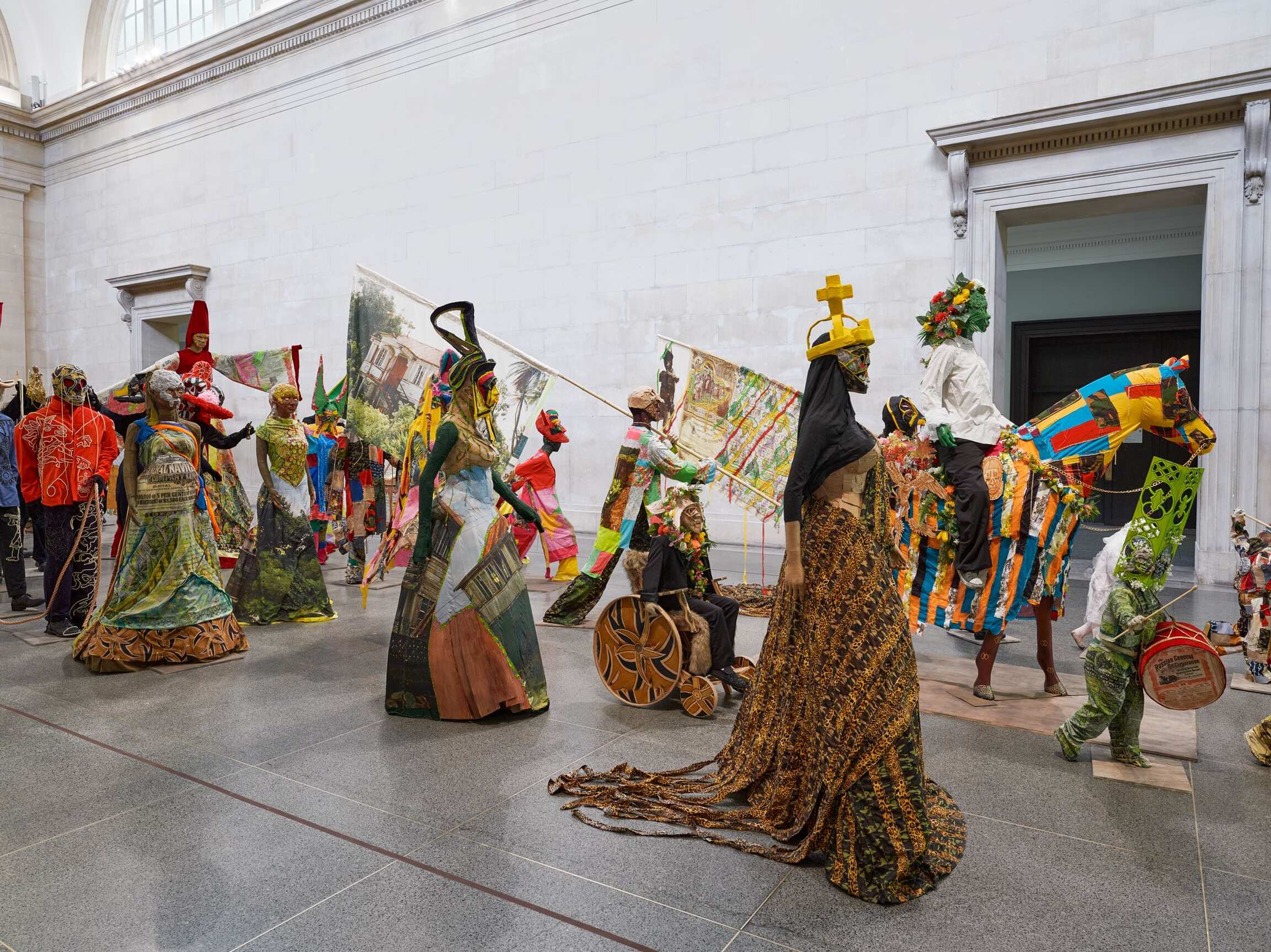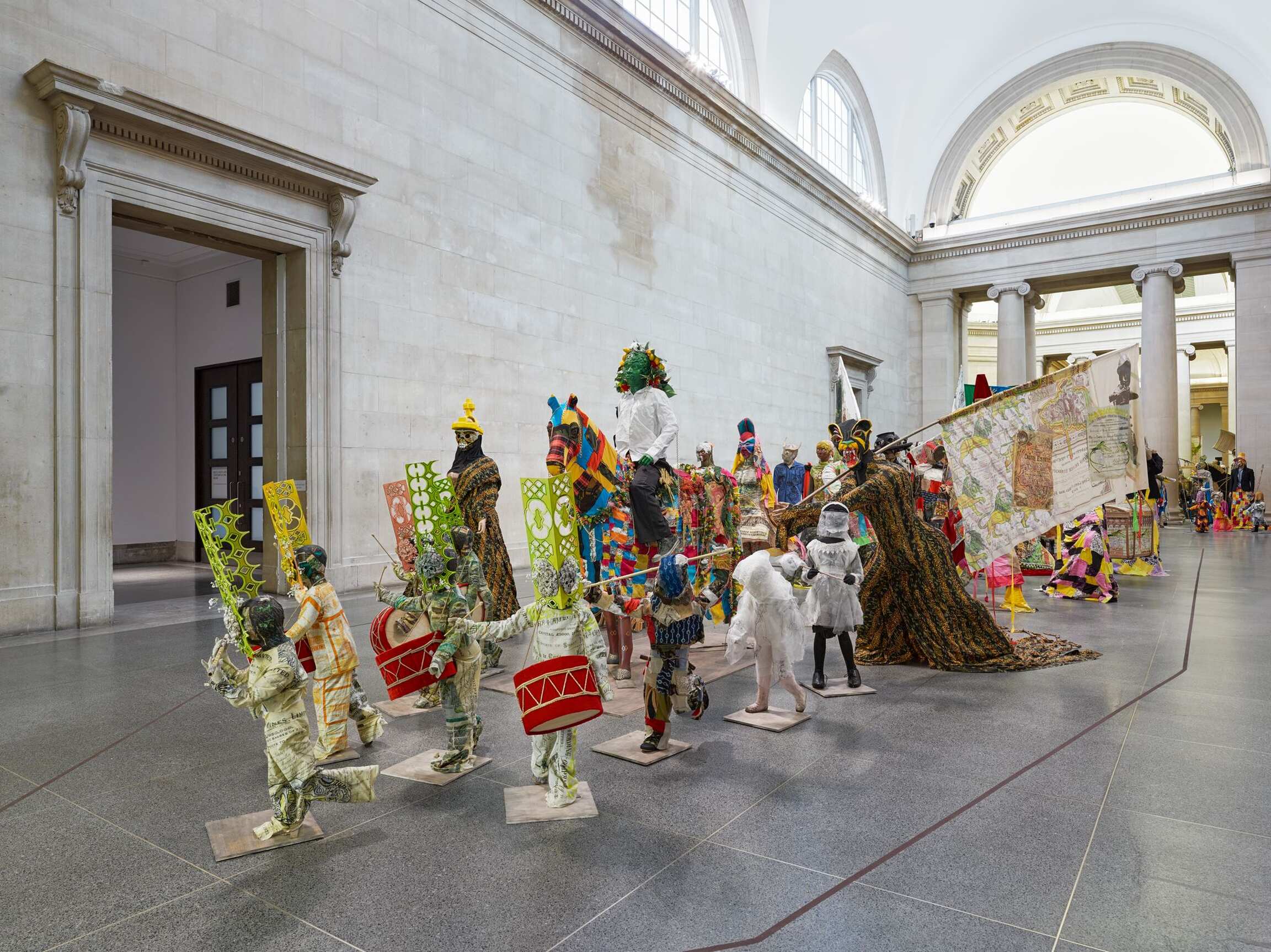 The Procession invites visitors to ‘reflect on the cycles of history, and the ebb and flow of cultures, people and finance and power.’ Tate Britain’s founder was art lover and sugar refining magnate Henry Tate. In the installation Locke says he ‘makes links with the historical after-effects of the sugar business, almost drawing out of the walls of the building,’ also revisiting his artistic journey so far, including for example work with statues, share certificates, cardboard, rising sea levels, Carnival and the military.