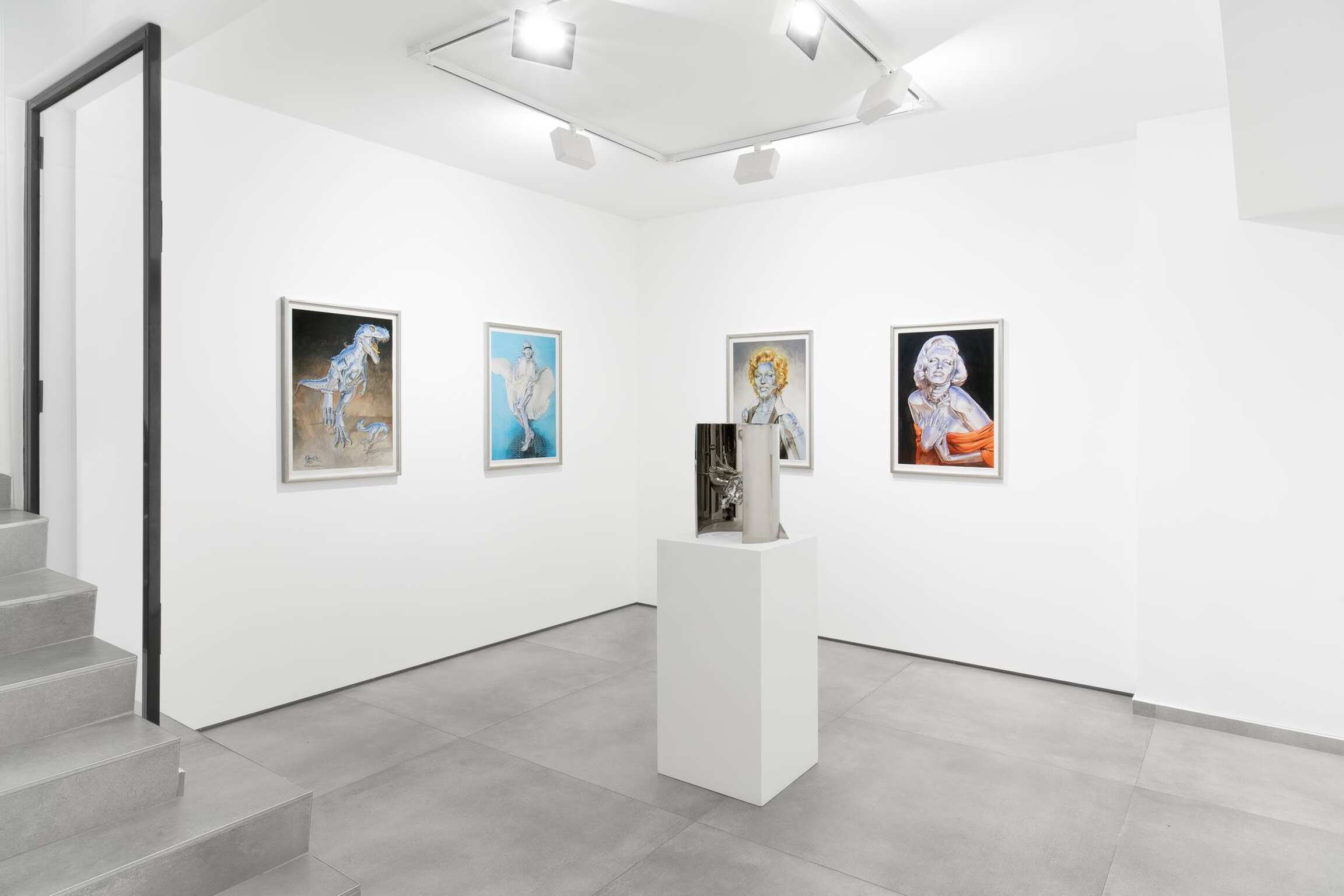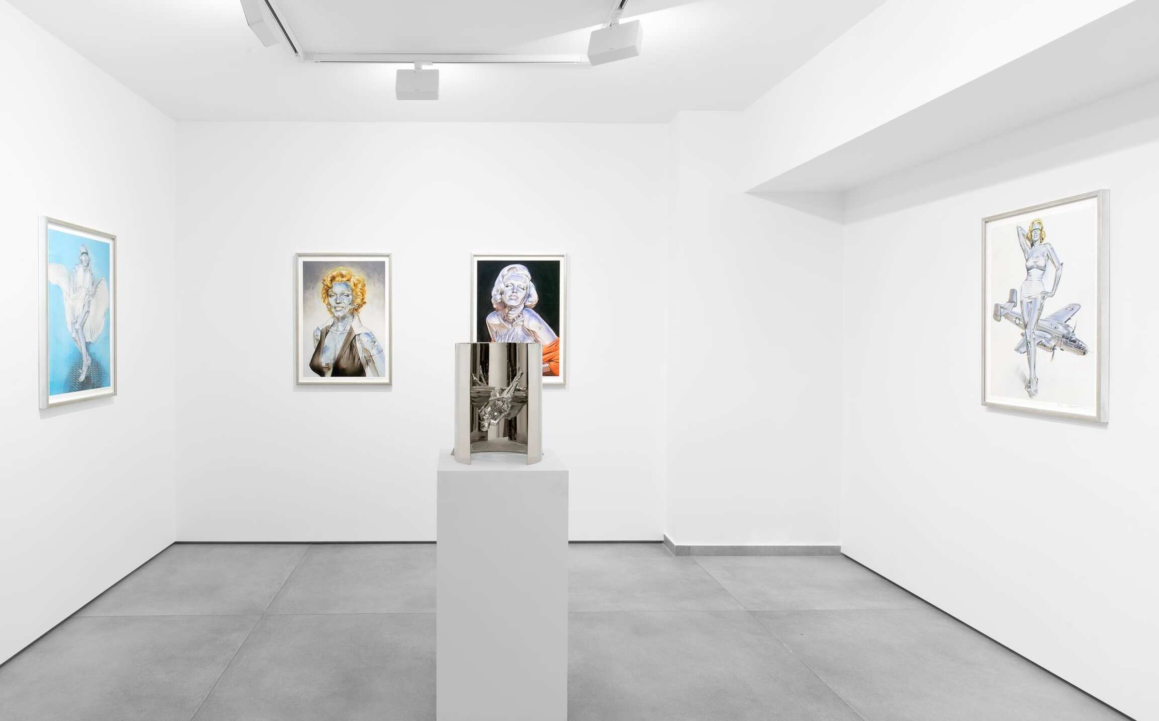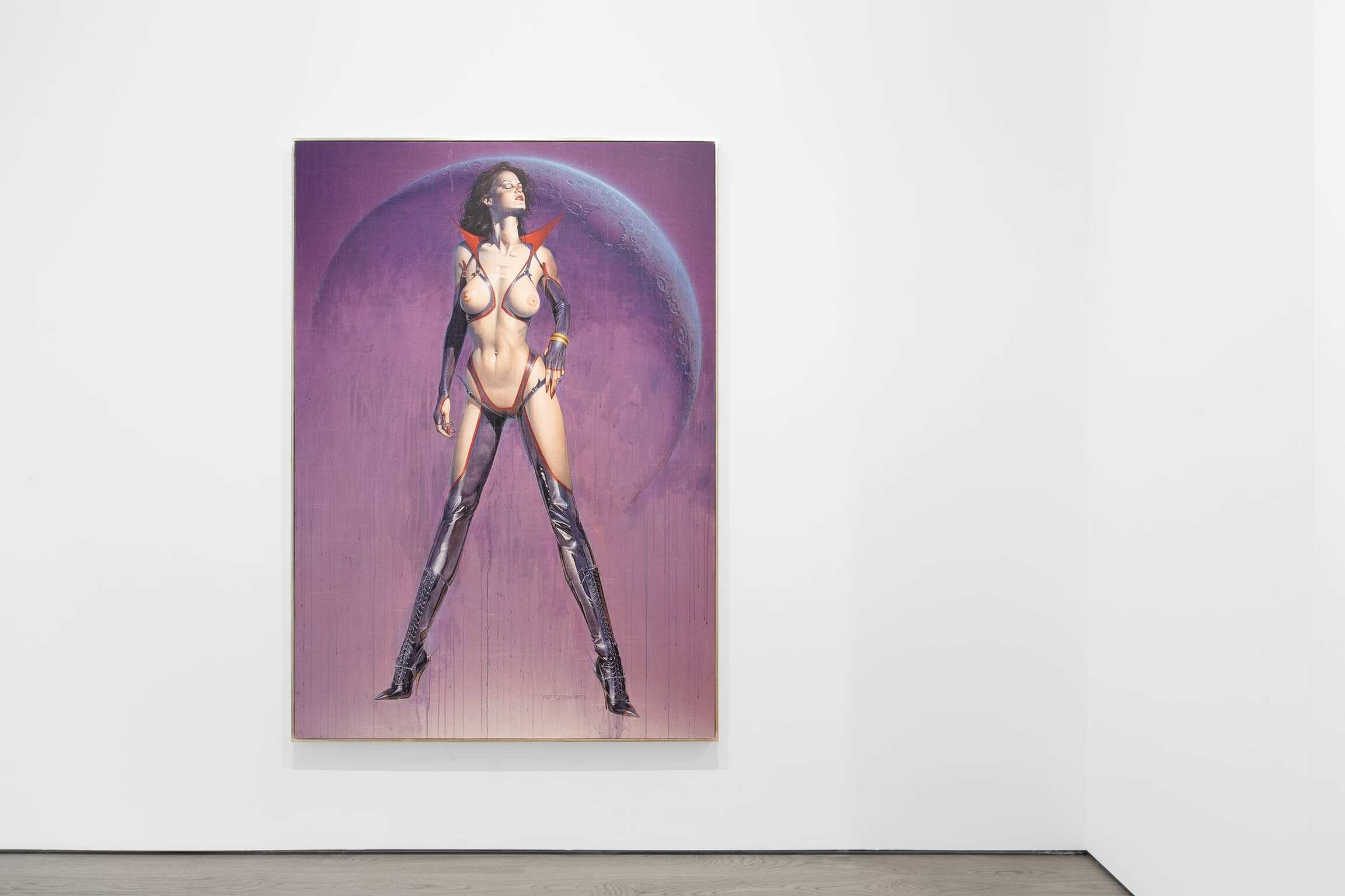 Born in 1947 in Japan, an independent illustrator from 1972, the artist soon elaborated a singular style, with cyber-erotic tones, which brought him worldwide fame in the 1980s. "I draw metals to depict a woman's softness [1]." This is what his painting voluptuously manipulates, this discordance between steel and skin, the sharp and the smooth, tekhne and erotica, calling on the viewer's culture and memory to bear witness as if against the grain. Hence, Marilyn with her flying skirt is a hackneyed image, but here, this retro-futuristic glamor, outside of post-humanist aesthetics, invites us to a parasensory gentleness, from an unknown time and place.