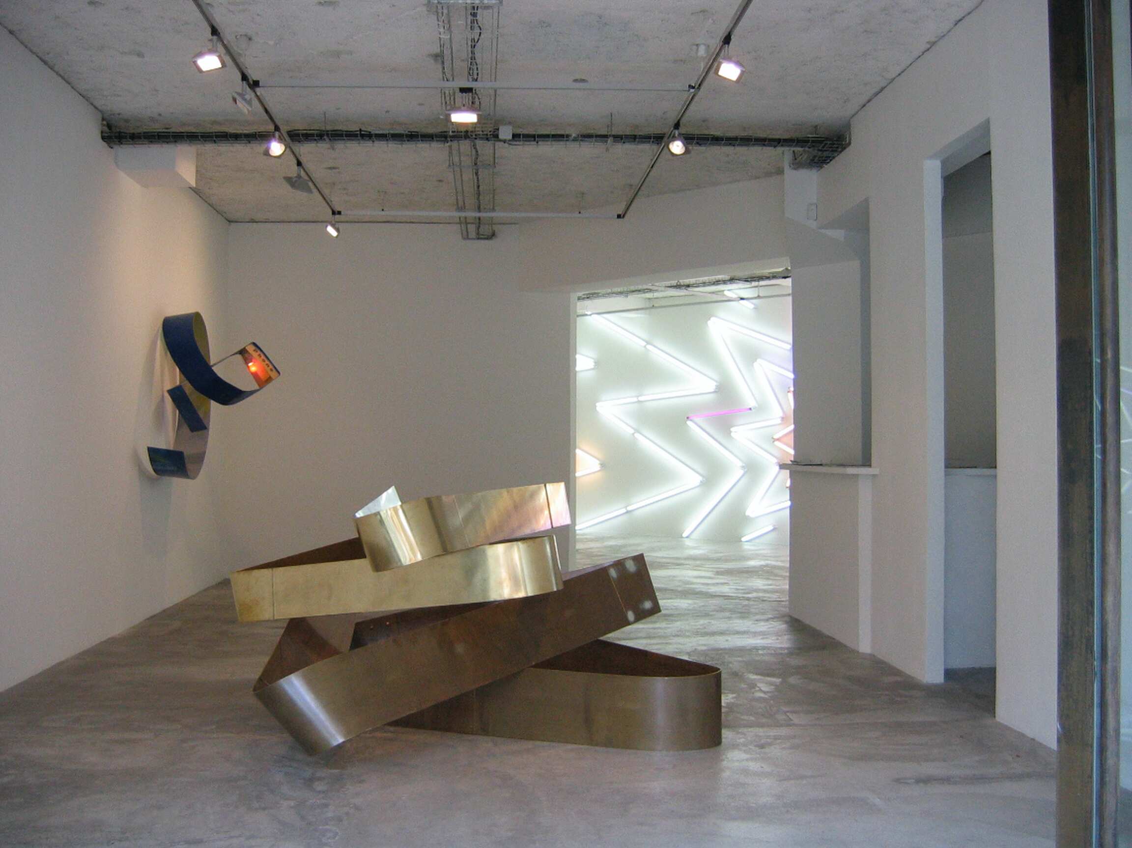 La première salle montre deux sculptures, l'une au centre, l'autre fixée au mur. Celle du centre propose un amoncellement de tiges de métal patiné courbées comme rompues par l'exercice d'une tension majeure. Elle semble fatiguée mais laisse pourtant apparaître la force du matériau, le muscle dirait-on, irréductible prêt à reprendre vigueur. C'est là toute l'ingéniosité de l'artiste : laisser croire que la destruction est irrémédiable pour mieux imaginer ensuite un revirement qui prendrait naissance dans les qualités intrinsèques des éléments. Rien ne se crée, tout se transforme. La sculpture au mur produit la même nervosité depuis la même source de vie. Et ce malgré la réalité de l'objet : une cabine téléphonique gondolante et découpée consciencieusement en tranches très fines.