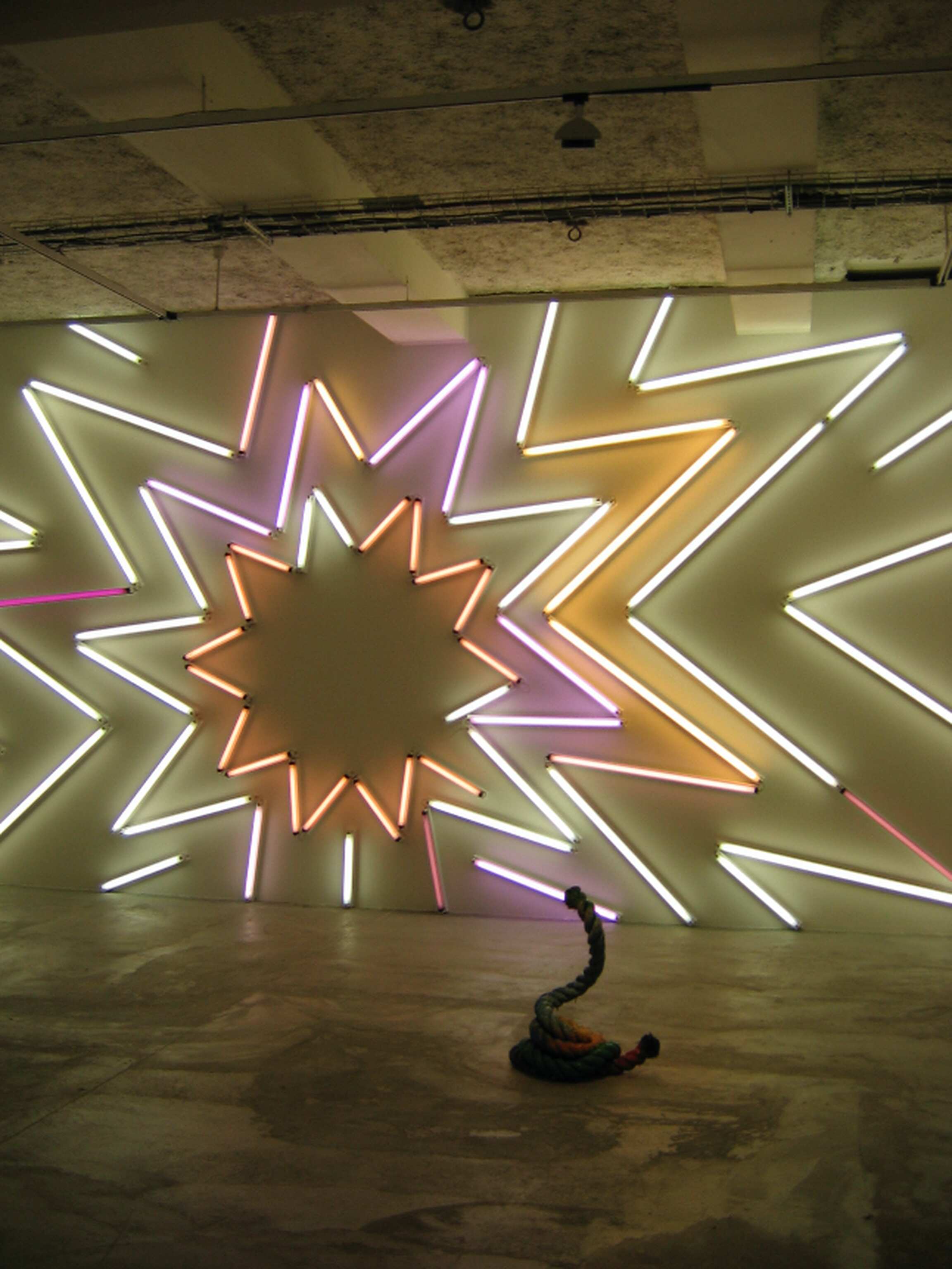 Mais le souffle de la pièce, la véritable inspiration de l'exposition, c'est le mural en néons qui par sa disposition évoque la dynamique de l'explosion. Là aussi, les citations sont évidentes : on pense à Flavin pour l'utilisation du néon comme objet et source lumineuse ; on pense à Lichtenstein ou plus prosaïquement aux comics américains pour leur utilisation de la ligne ciselée. On voit au résultat un mix réjouissant de références au plaisir communicatif qui instruit un nouveau rapport avec l'esthétique de la destruction.