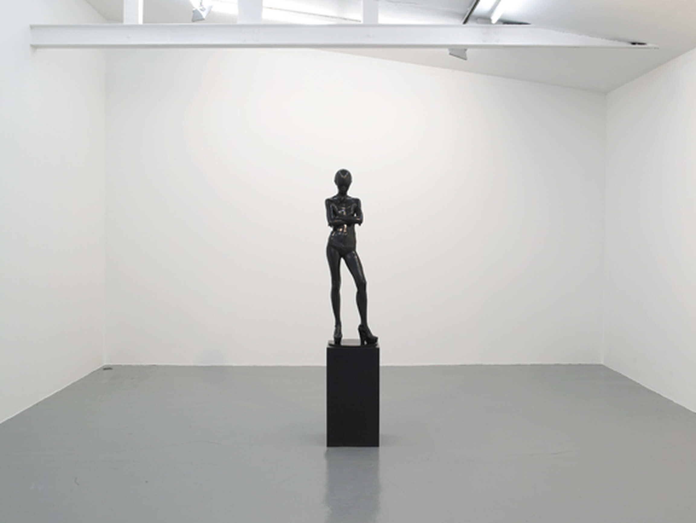 Just as Egyptian statues can be dated by the length of a robe, the form of a hairstyle, or the way in which the eyes are represented, Yoko is placed in a potential temporality through a mere handful of accessories: the form of a bikini, a pair of platform-heel shoes, a hairstyle, a dress. Yoko IV (2004) is hieratic and frontal in a long, figure-hugging dress, one arm bent upwards, and looks like a generic image of these Egyptian statues, while Yoko II, perched on stiletto heels, arms resting along the side of the body and the break of the waist marked by a hip swung slightly to one side evokes Helmut Newton’s Big Nudes. Reduced to one figure, one colour and few accessories, each decision, each shift in pose and each detail takes on a dramatic meaning: Yoko evolves before us in absolute slow-motion. Don Brown seems to want to produce these pieces at a determined rhythm, a few sculptures a year at most, in a laborious process recording the passing of time.