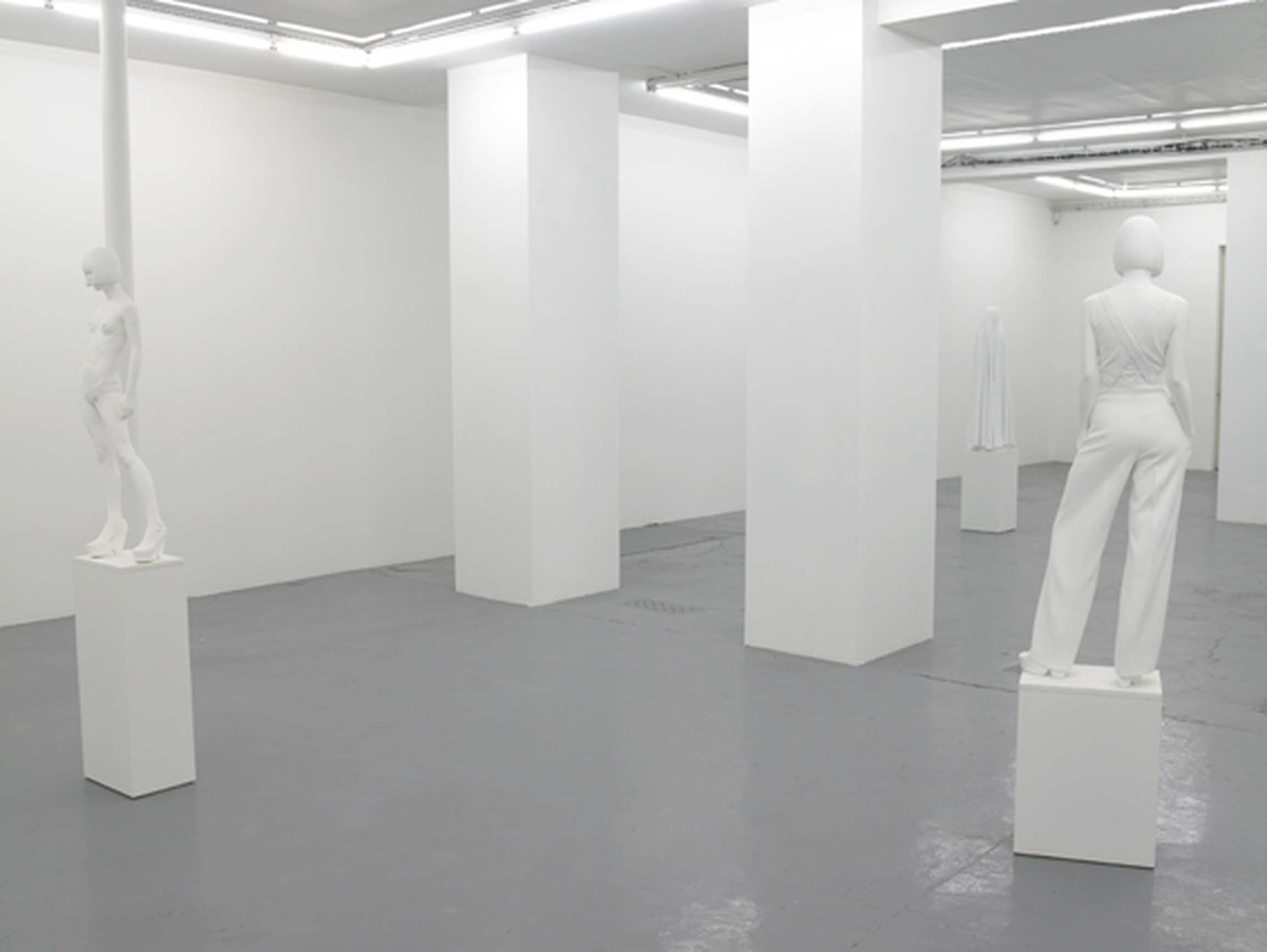 Much as they represent the human figure, Don Brown’s sculptures have no equivalent in the history of contemporary art. Georges Segal’s white sculptures were on a human scale and executed in a basic plaster far short of the quality of the details that Don Brown’s recreate. Duane Hanson’s were minutely detailed but also on a human scale and their accoutrements referred to a multi-coloured vision of the Pop art world in which they were born at the turn of the 1970s. Freed of clothes and presenting totally nude bodies on a human scale, American artist John de Andrea’s hyperrealist sculptures also appeared in the 70s and fascinated people through their power to imitate the visual qualities of skin. Frozen in the fragile, immaculate lightness of their production in white resin,** Don Brown’s sculptures have only the extravagance of their precision and their reduced size with which to confront the gaze. Parsimonious distribution of the codes of classical sculpture—a plinth on which the model stands, in Yoko X (2004); little pedestals on which Yoko is sometimes raised by platform heels, heightening the process of distancing her from the ground—reminds us just what an exercise this is. As a counterpoint to these codes, the attitude is surprisingly natural: a contemporary woman, hands on hips, sitting, standing, in a form of simplicity and obviousness no longer touched upon by fashion photography—indeed, the photographic dimension of these sculptures is instantly striking.