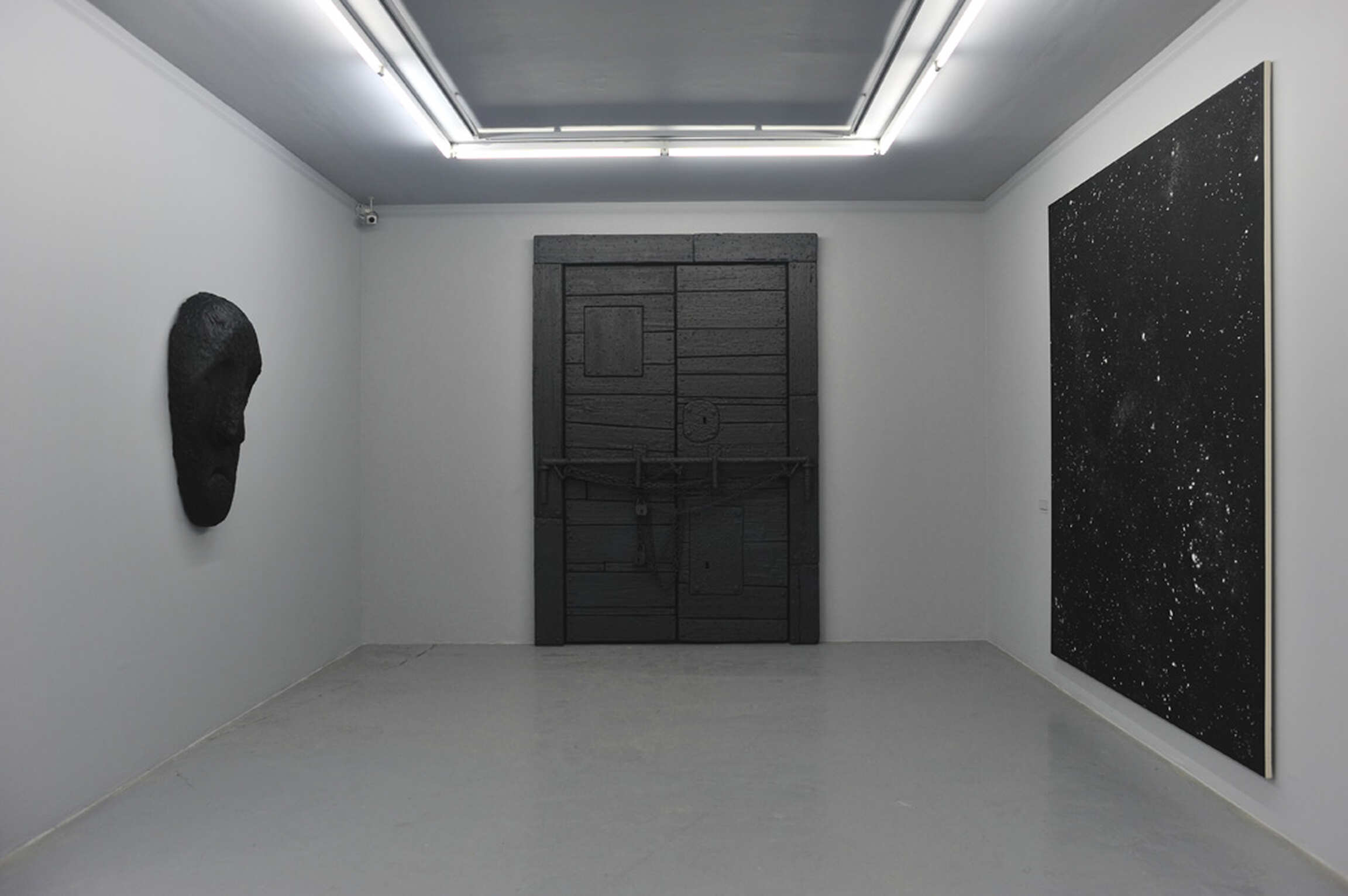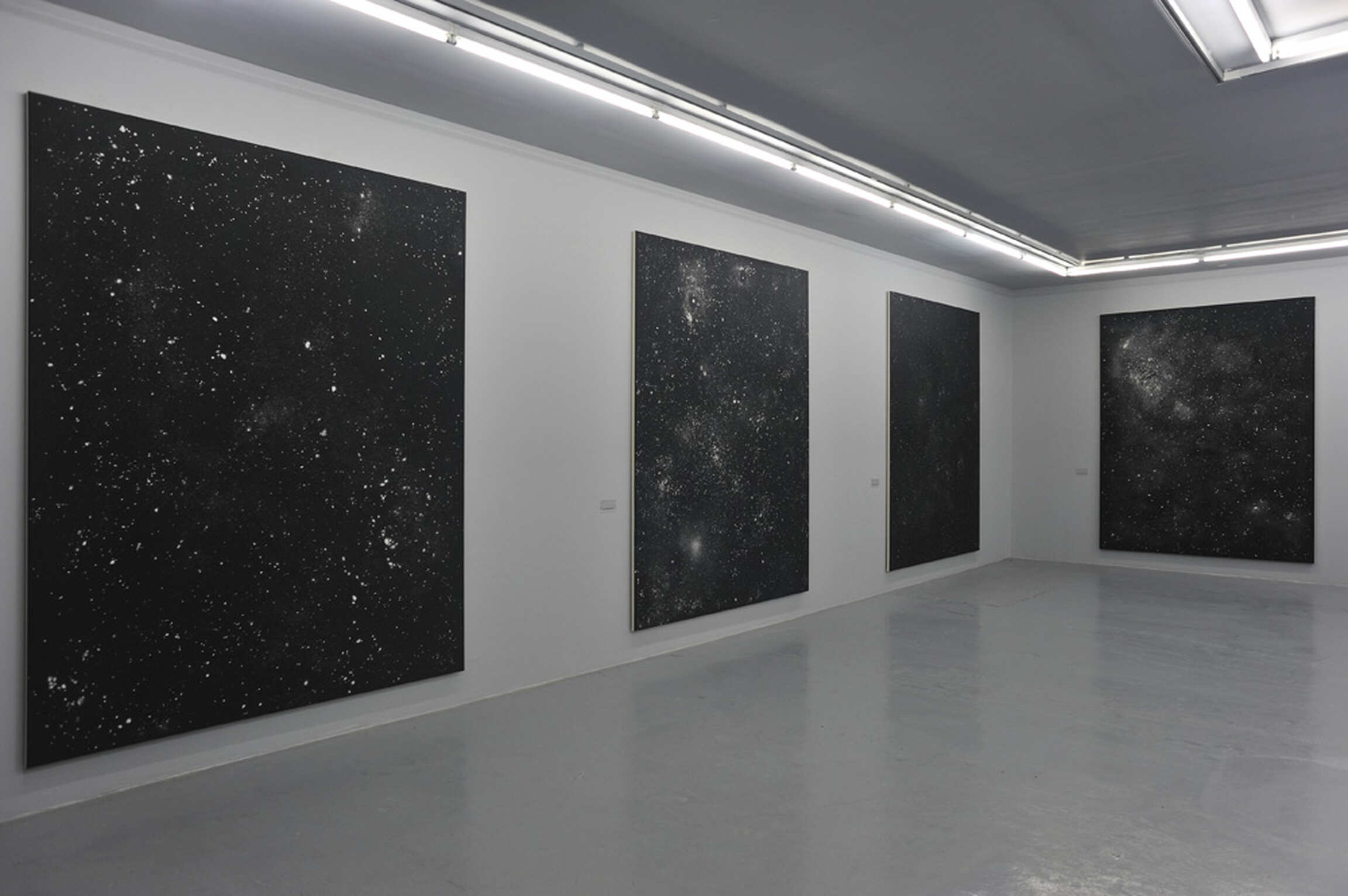 Car aux côtés de quelques imposantes portes en bois peint, l’artiste a déployé dans l’espace onze toiles de grand format de sa récente série dite des « star paintings », pour la première fois présentées lors de son exposition The Night of Lead au Museo de Arte Contemporáneo de Castilla y León, en juillet dernier. Accrochés très bas sur le mur, afin de permettre au spectateur de s’y projeter plus intensément, elles figurent toutes des étoiles et constellations dans lesquels le regard et l’esprit se perdent et divaguent d’autant plus aisément qu’ils font face à l’inconnu ; un inconnu inexistant, ces tableaux ne faisant nullement office de représentation.