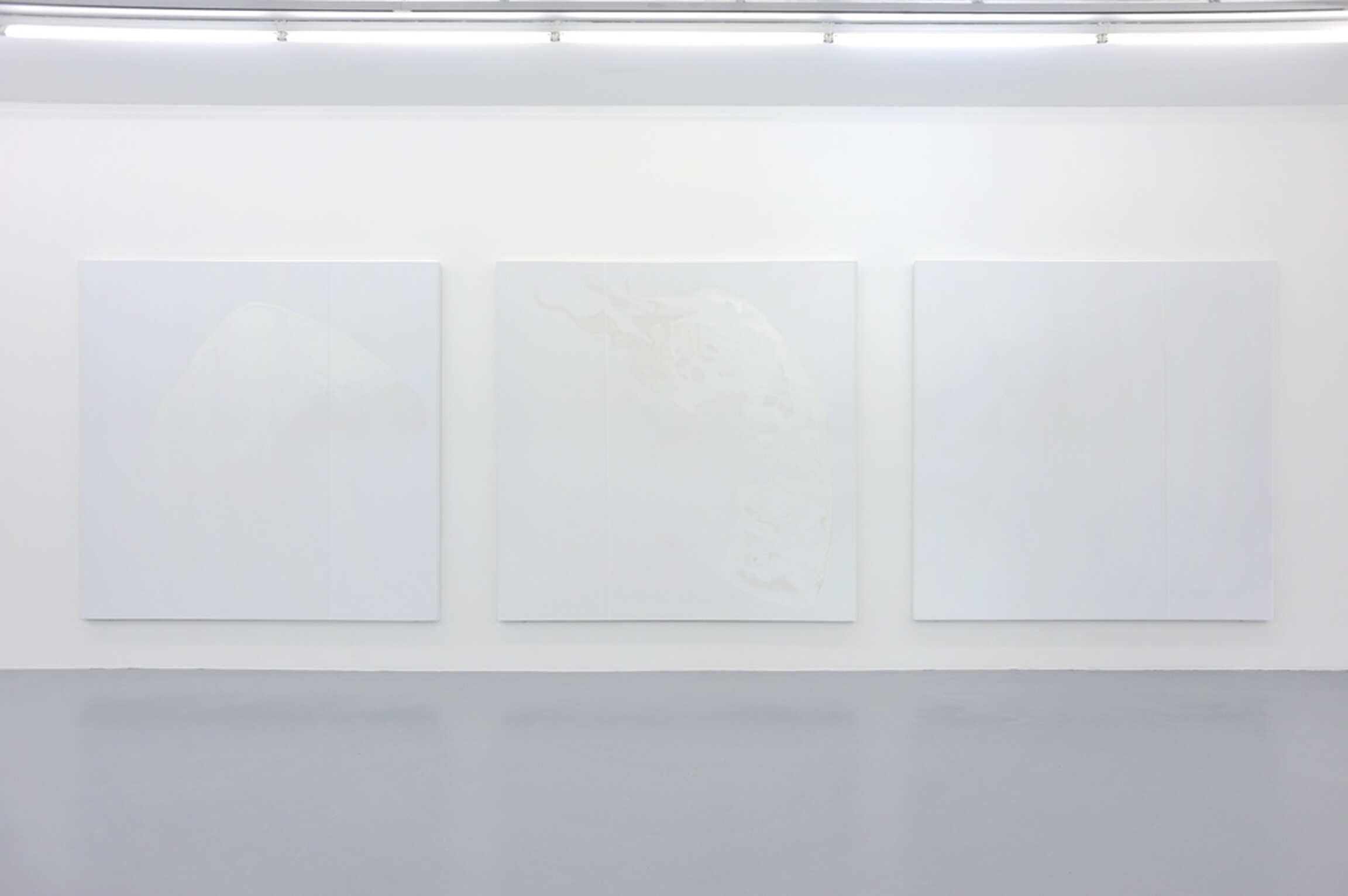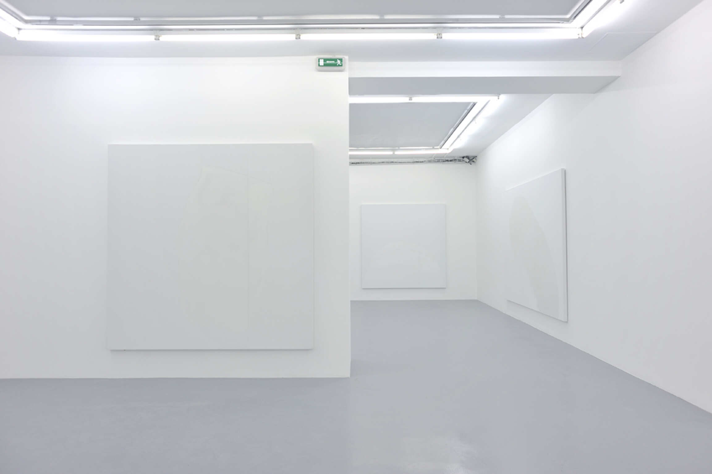Les œuvres de Daniel Lergon présentées dans cette exposition sont faites de laque transparente étendue sur un tissu blanc rétro-réfléchissant. Ce procédé contraste avec la conception traditionnelle de la peinture comme application de pigments sur une surface, et laisse au contraire la surface elle-même produire la couleur, modulée par un médium transparent. Les œuvres blanches produisent une diffusion de la lumière dans toutes les directions, un épaississement de l’atmosphère de l’environnement immédiat du tableau. La blancheur est dense et moelleuse, s’aplatissant et se renflant, apparaissant et disparaissant selon les mouvements du spectateur. Des figures subtiles et éphémères sont mises en évidence par les surfaces presque vides qui les entourent.
