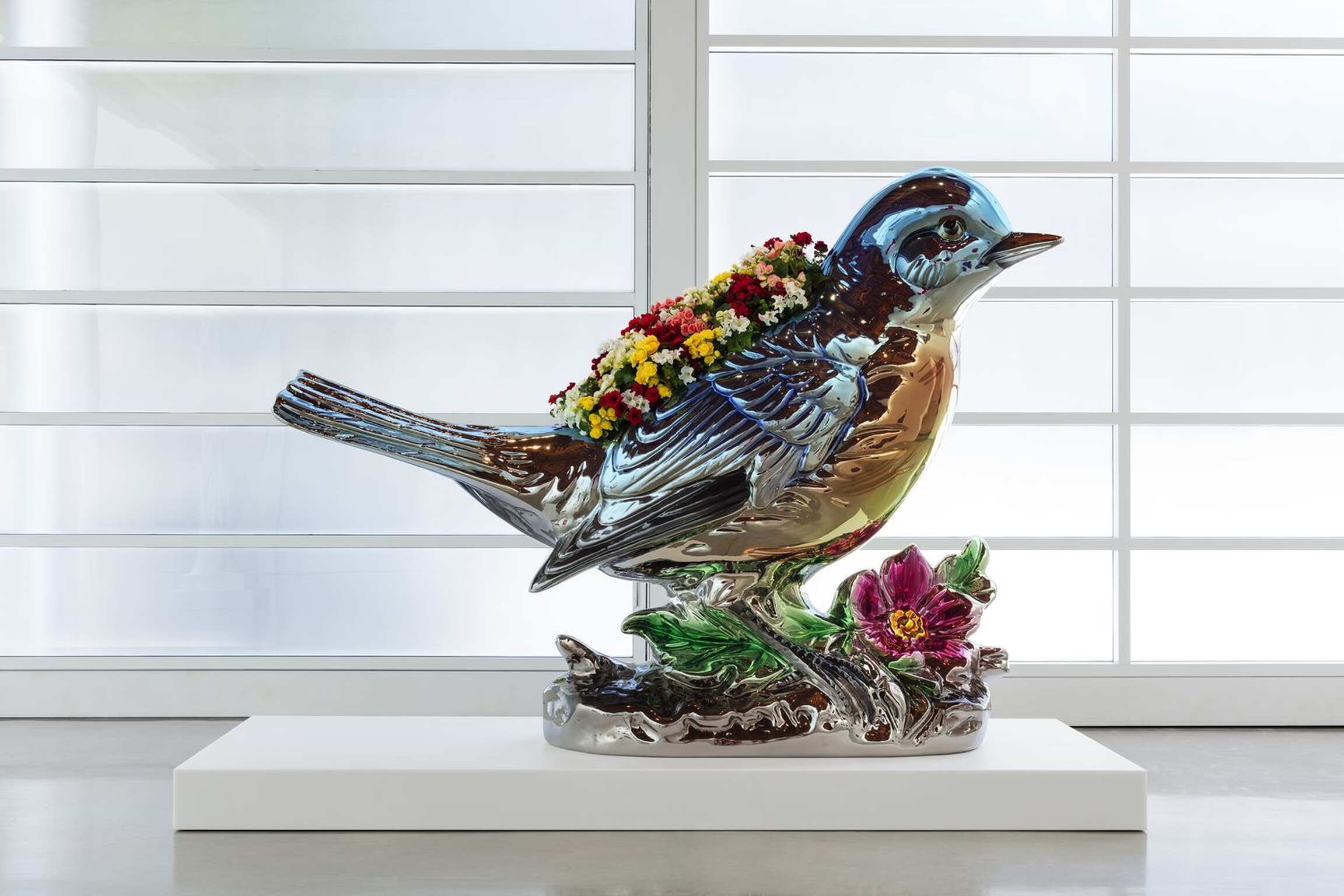 The exhibition path then leads to the conclusion, featuring the monumental artwork "Bluebird Planter" (2010-2016) from the Antiquity series. This mirror-polished stainless steel piece, coated with transparent colors, appears as if it has been magnified from a small porcelain original. It engages with a wide selection of bird-shaped works, including bird calls, roof ornaments, and other decorative objects. This concluding artwork further reinforces the connections between Koons's creations and various objects found within the Mucem collections.