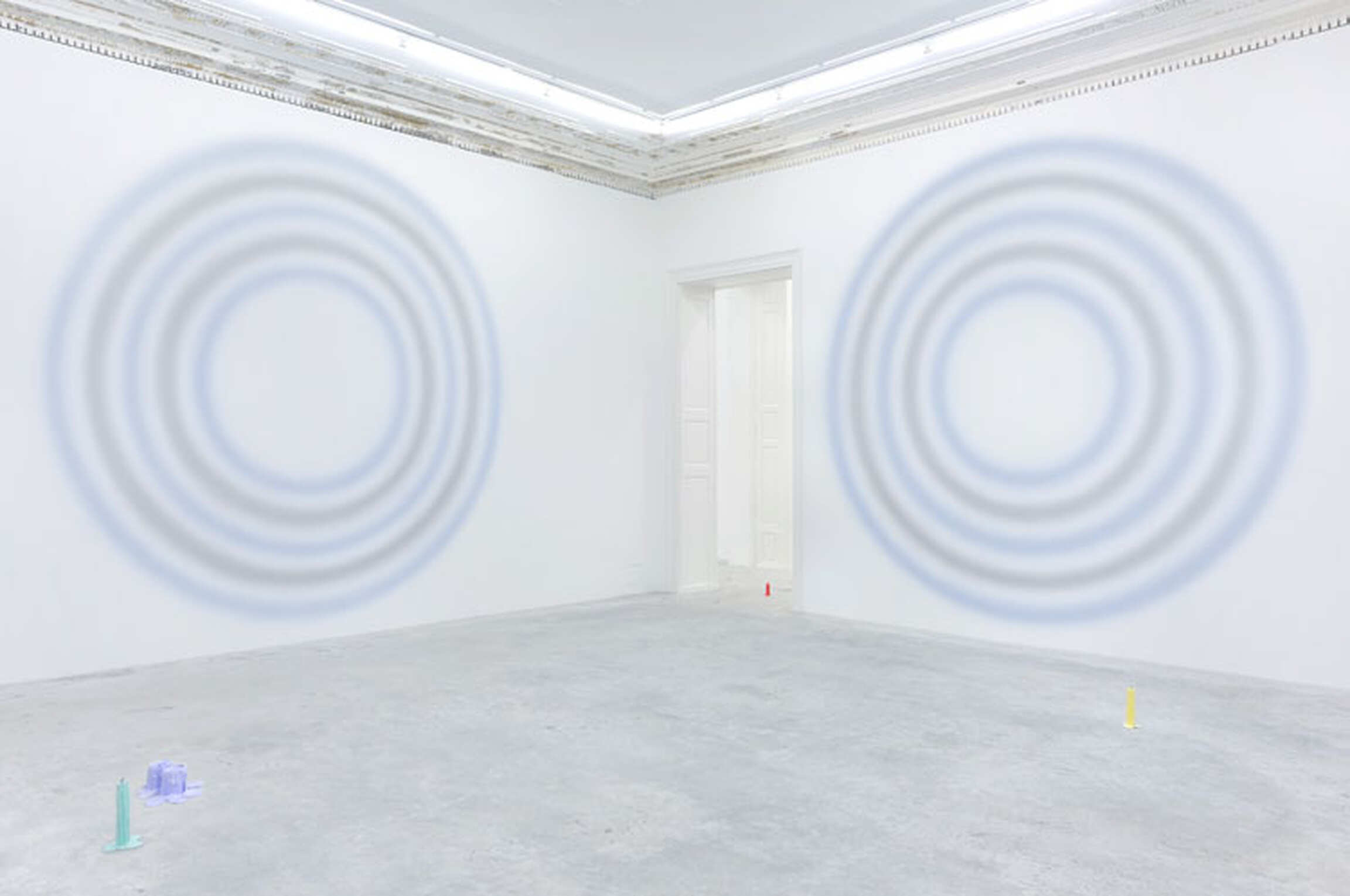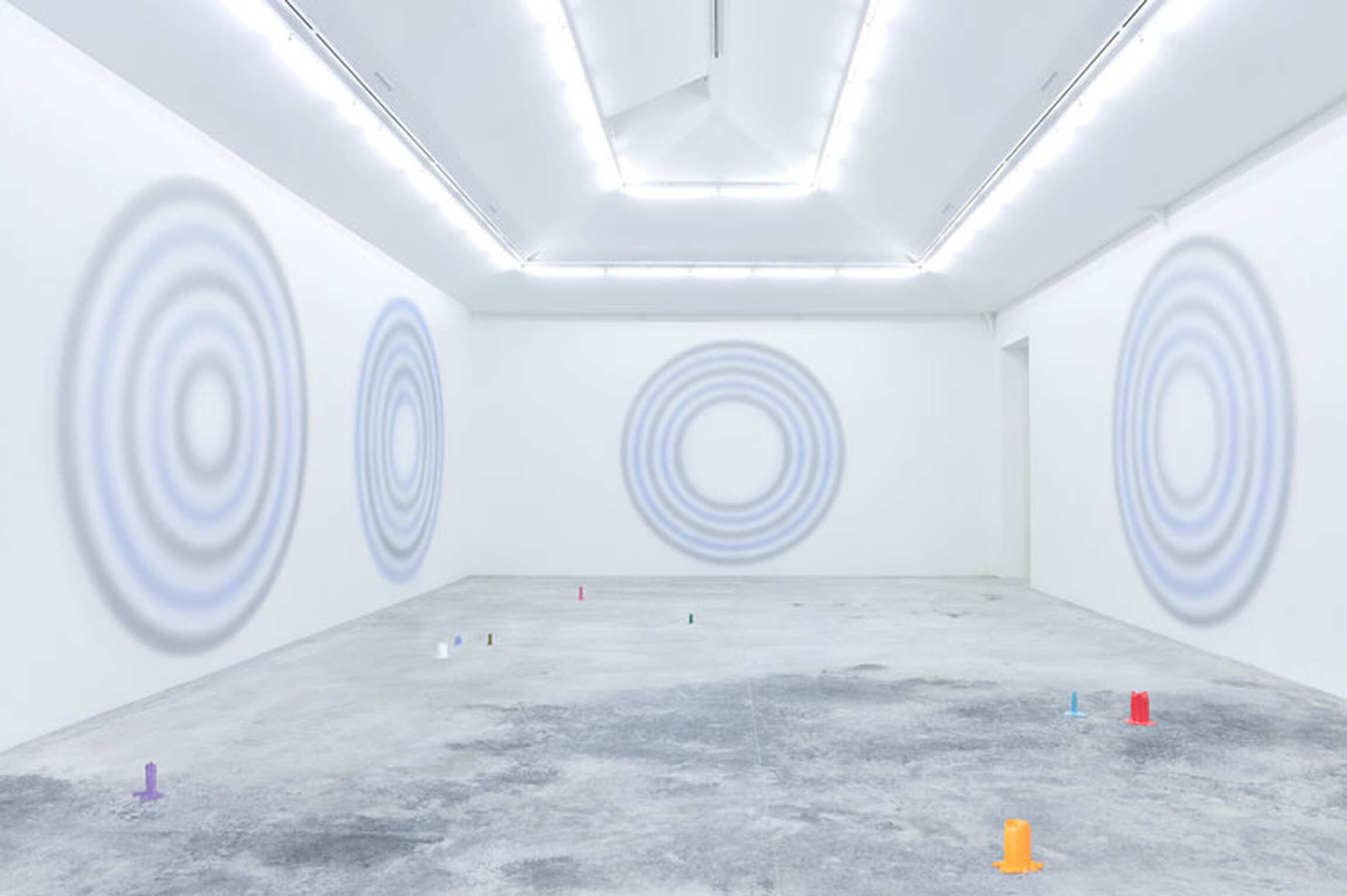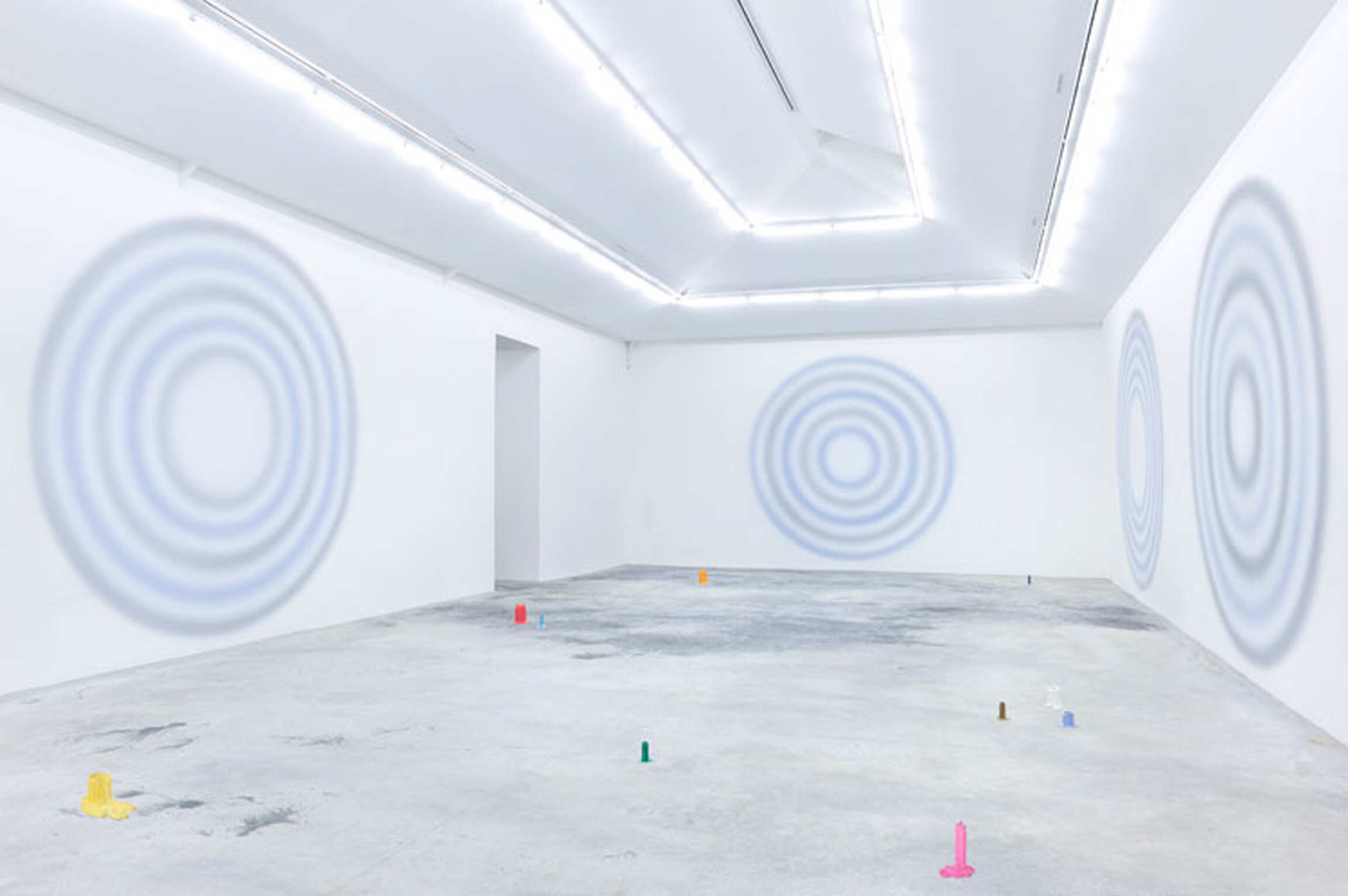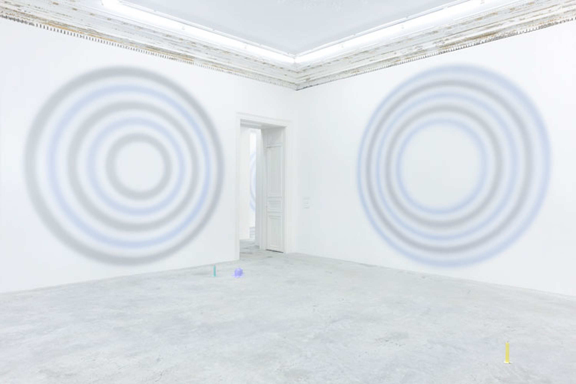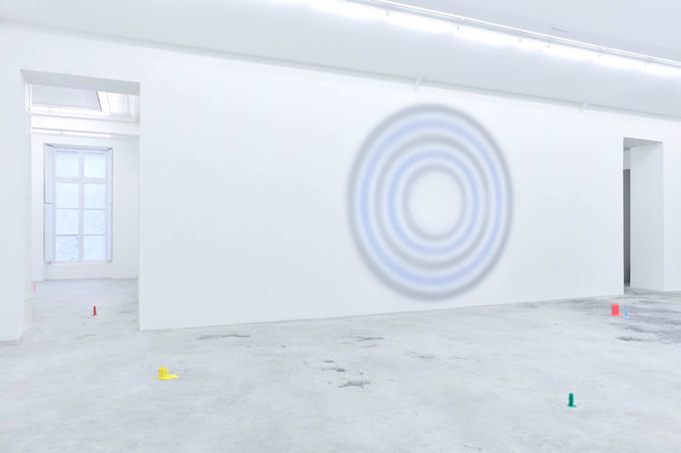 “Je suis l’homme qui fait attention à sa vie nocturne”, pour citer Victor Hugo. L’artiste Ugo Rondinone révèle dans cette exposition des lunes à différents stades, aux reflets bleutés et argentés, peintures murales devant lesquelles le regard doit se concentrer tant leurs contours demeurent incertains. Ces pure moonlight font partie de la série des mandala paintings ; elles représentent des cercles concentriques plus ou moins larges selon la composition de la peinture qui créent des effets d’optique faisant varier la perception de l’œuvre. Ces mandalas s’inscrivent au coeur des date paintings, corpus d’oeuvres que l’artiste a commencé il y a plus de vingt ans. Ces peintures murales ont été présentées pour la première fois à Zurich en 1996, puis au Centre Georges Pompidou en 2002. Chaque pièce étant datée, elles représentent un jour dans la vie de l’artiste, une ode à son existence, voire à la peinture abstraite dans sa plus pure tradition. L’artiste a occulté les fenêtres de la galerie afin de poser les limites entre espace d’exposition et monde extérieur.
