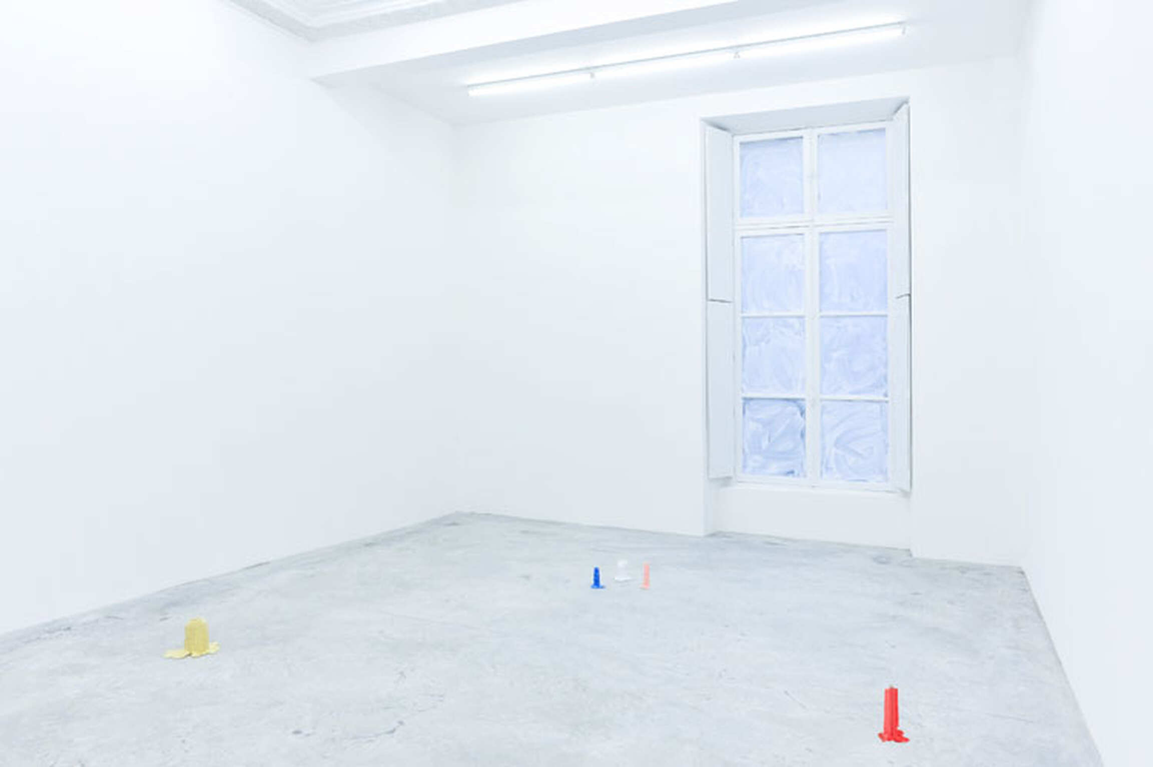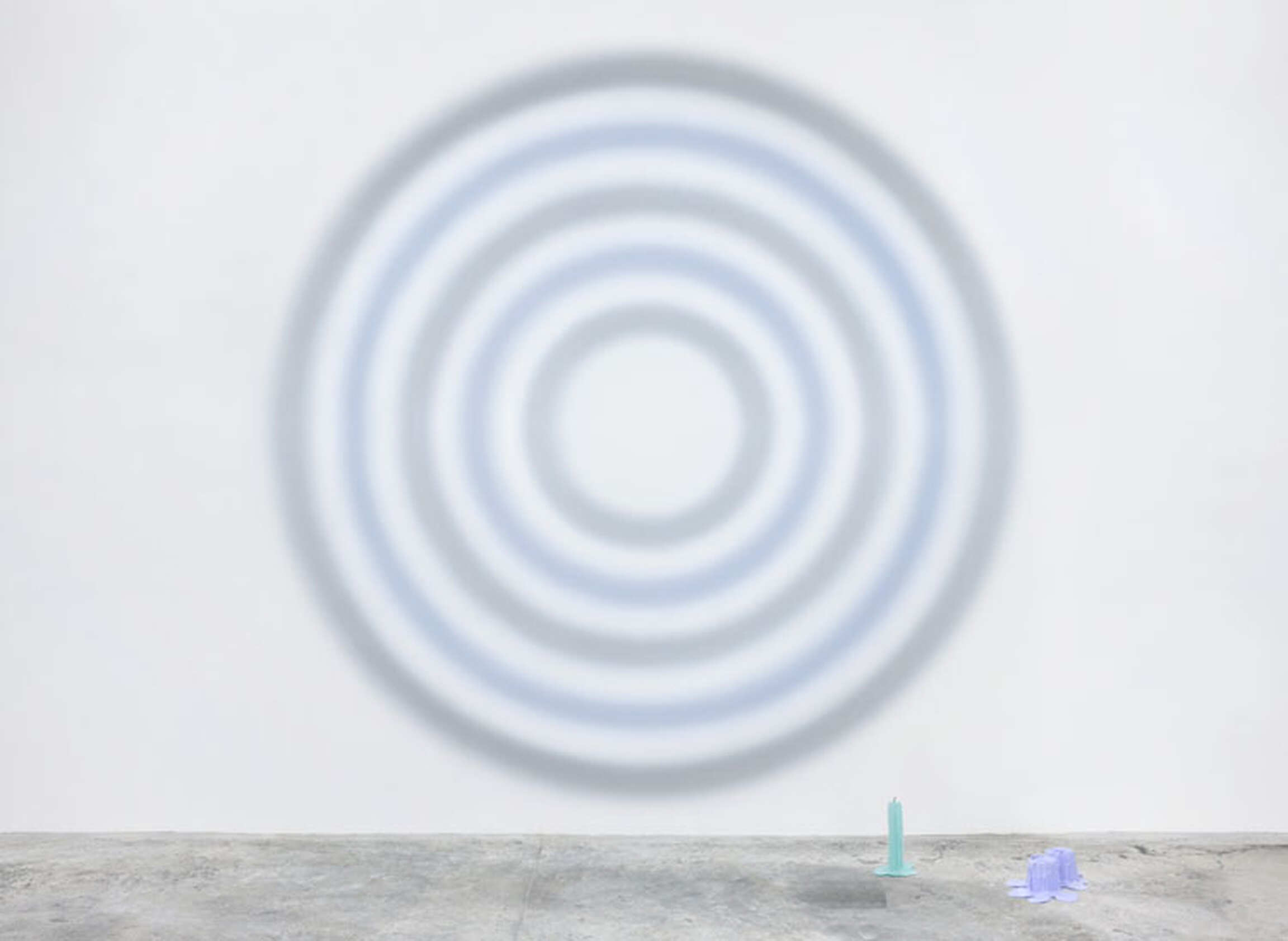 Cette exposition présente également au sol trente bougies en bronze et plomb, plus ou moins consumées et de couleurs différentes, qui renforcent cette idée de temps suspendu, cette tension entre lumière naturelle et artificielle, entre contours précis et vagues, entre ces peintures gigantesques et ces simples petits objets du quotidien.