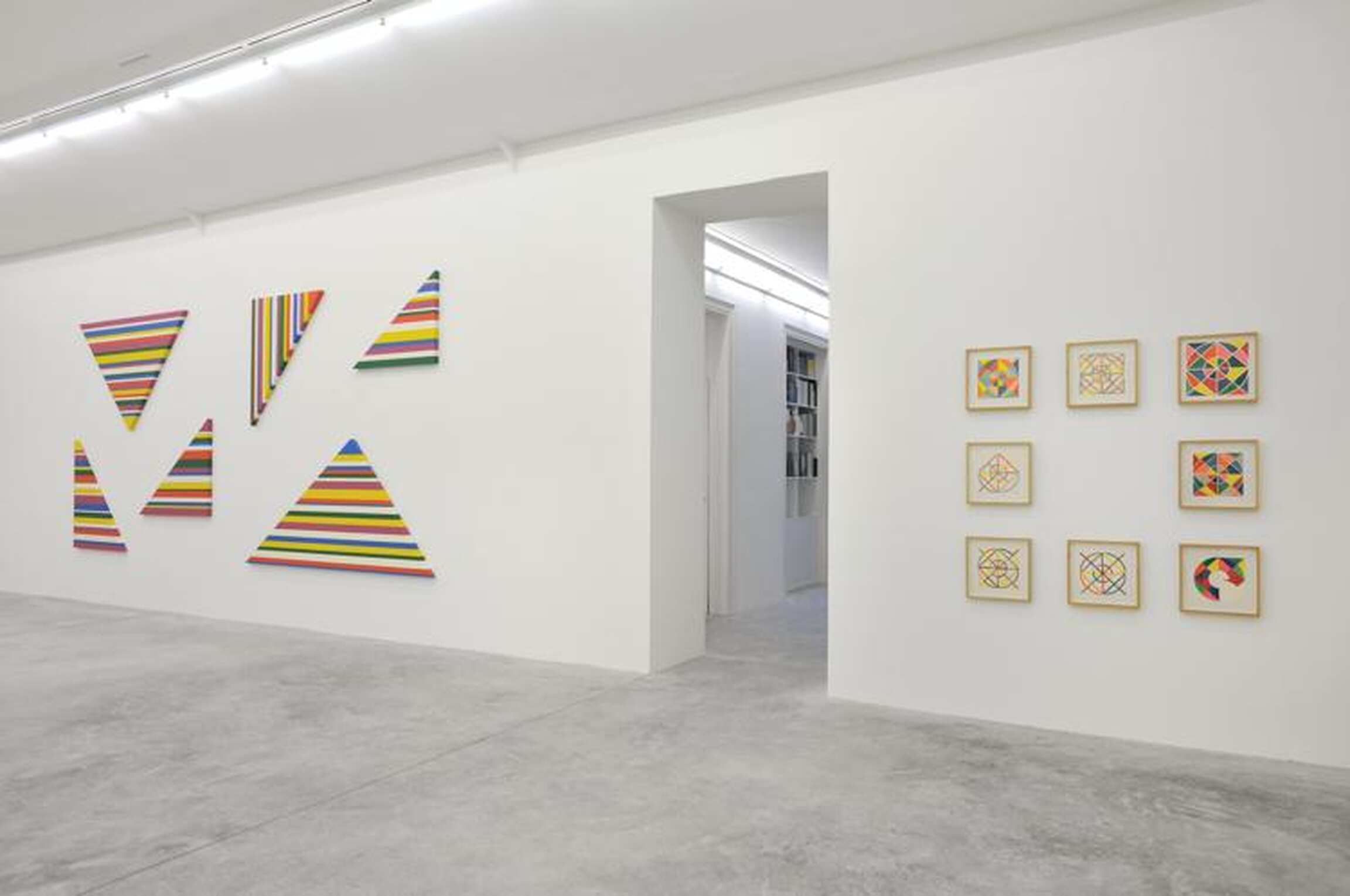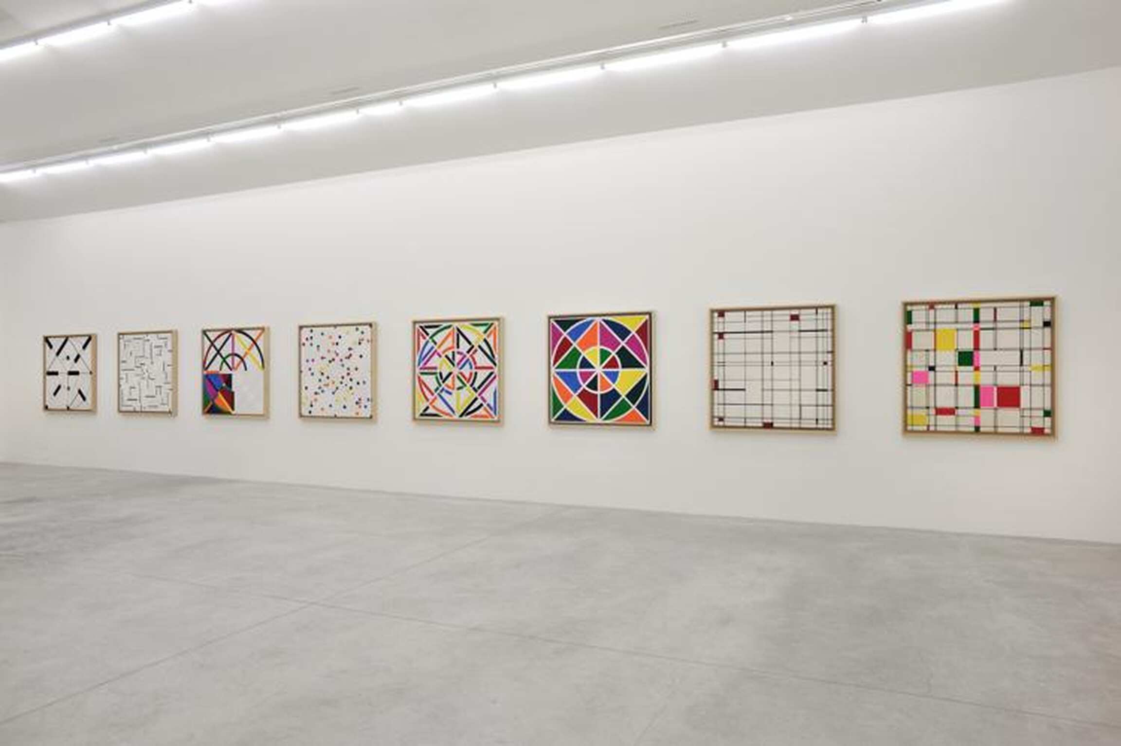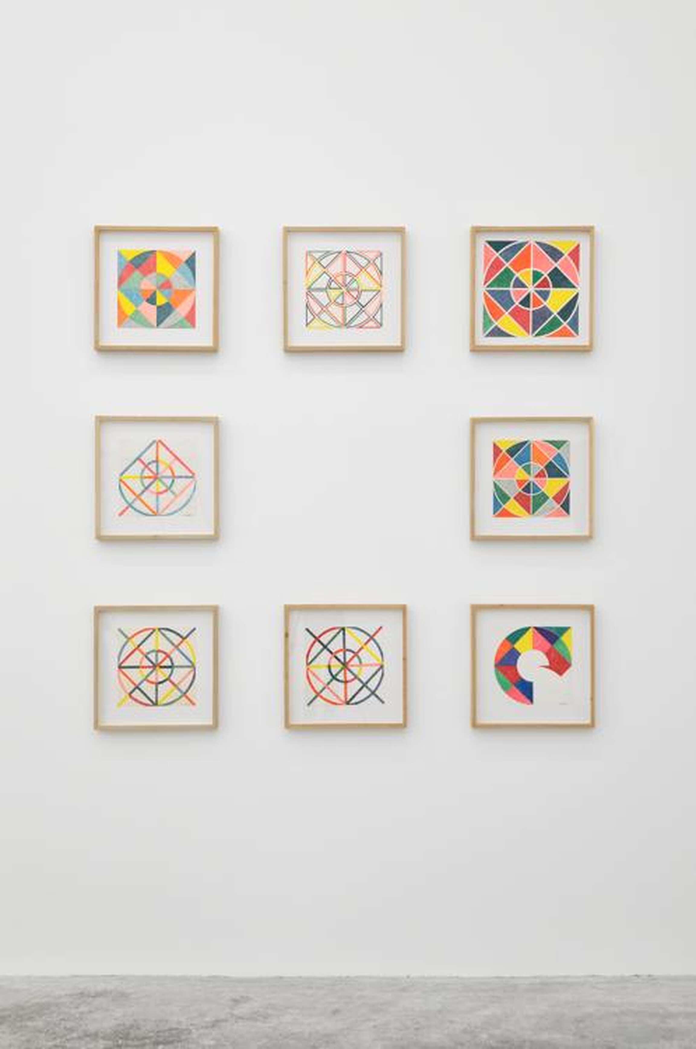 During the 1970´s, Terrazas experimented with geometry, playing with formal relationships between geometric elements in countless drawings. He designed works that he then produced in the Huichol technique, which is made using colored yarn on wax-covered wood boards. The series Possibilities of a Structure is an endeavor to systematize these formal geometric games; the structure Terrazas had chosen, which he named Cosmos, would prove, over the following ten years, to be an unending source of visual exploration. Other structures like Nine Circles, Diagonals, Grid and Bar Code, would later enhance the concept of the Possibilities of a Structure series.