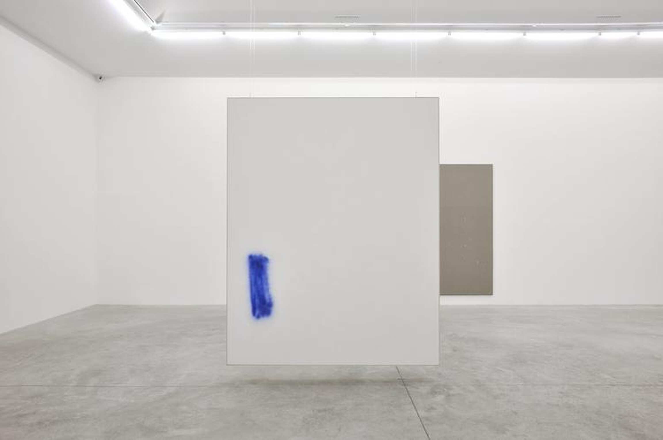 The series F (Between two Ferns) is probably one of the artist’s most emblematic so far. It consists of an endlessly repeated motif that has been spray-painted in blue on a white background. The process of choosing titles is part of the paintings but often stays unintelligible for the viewer.