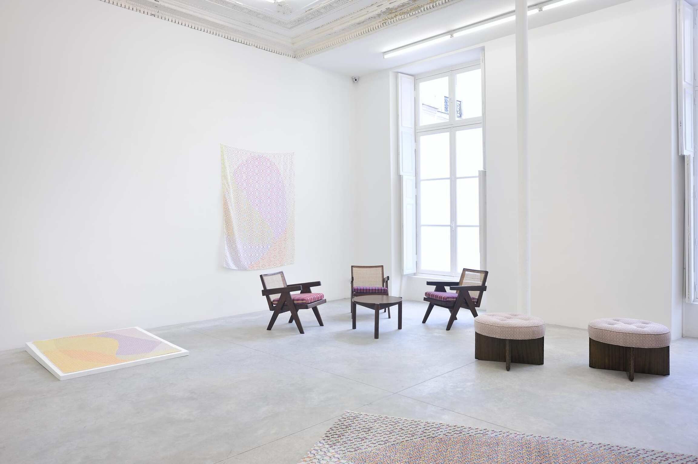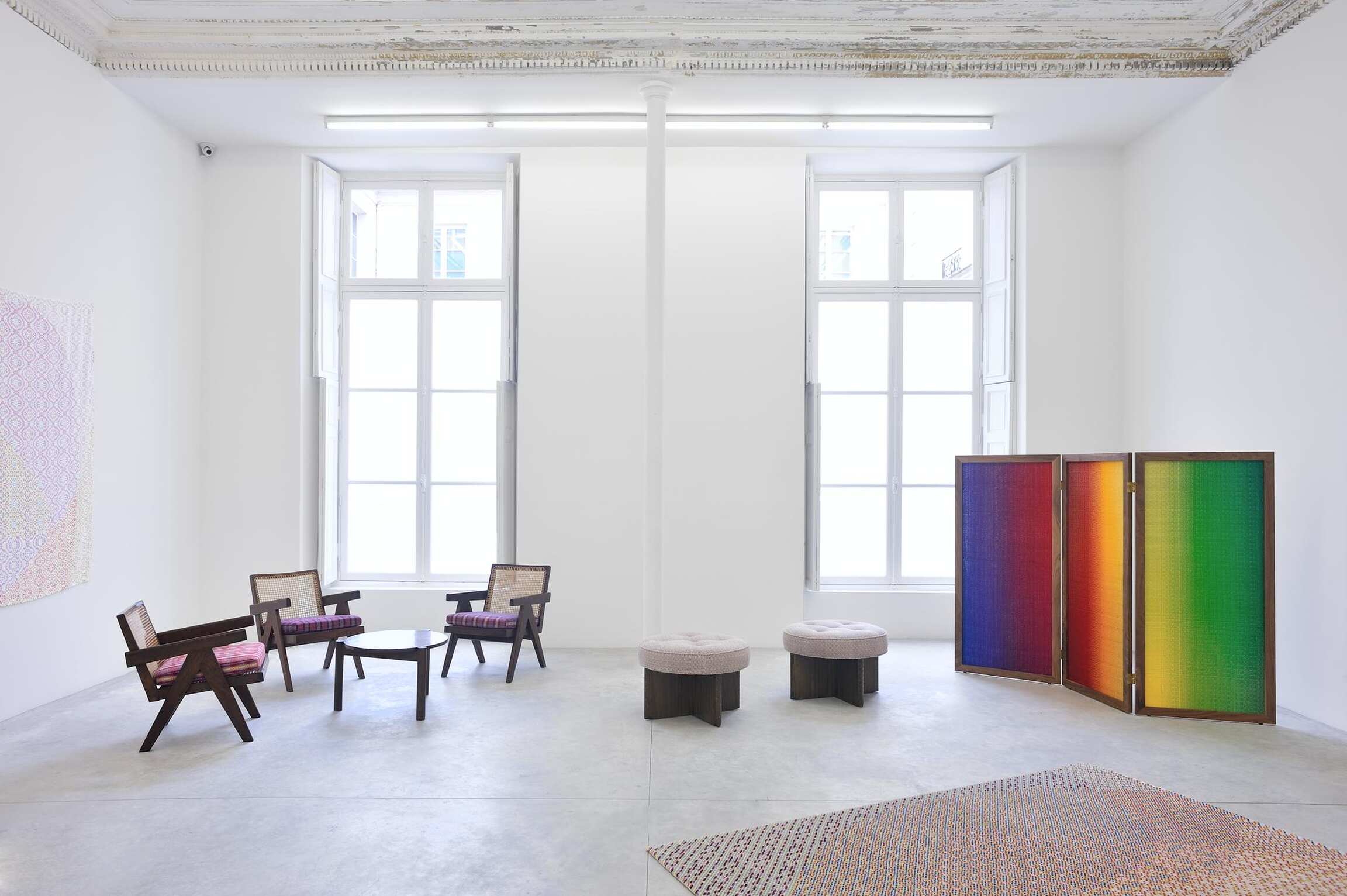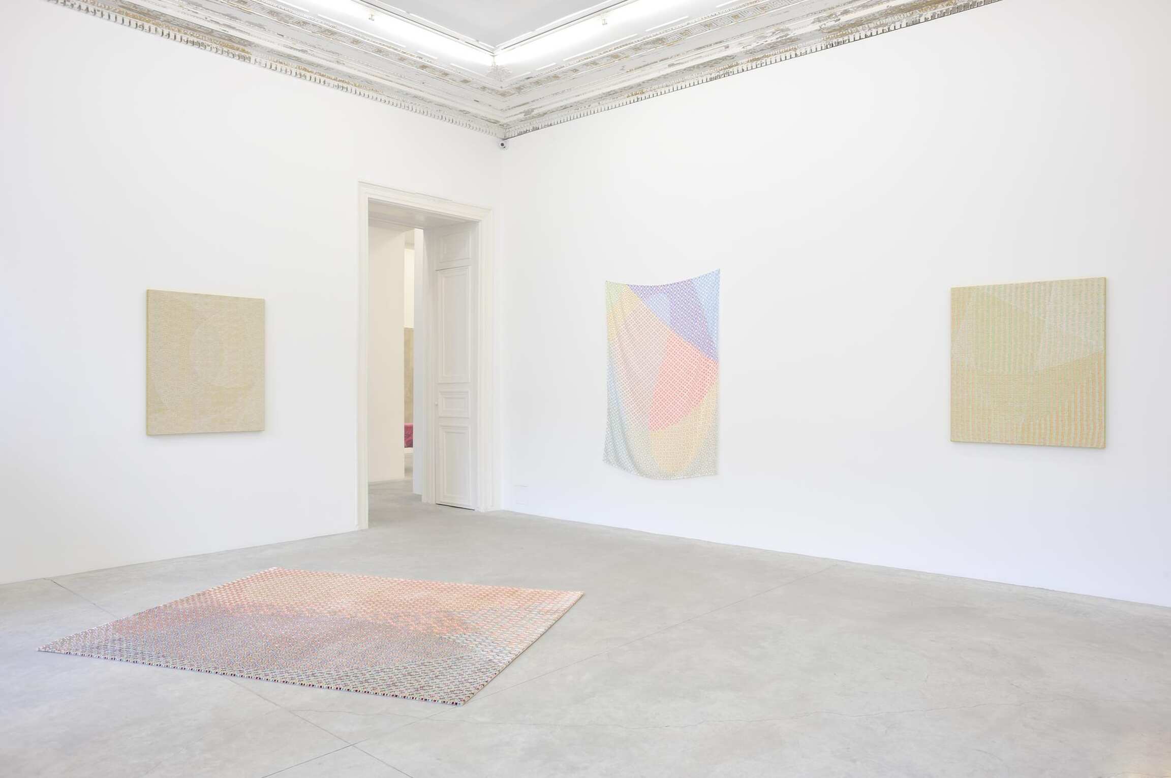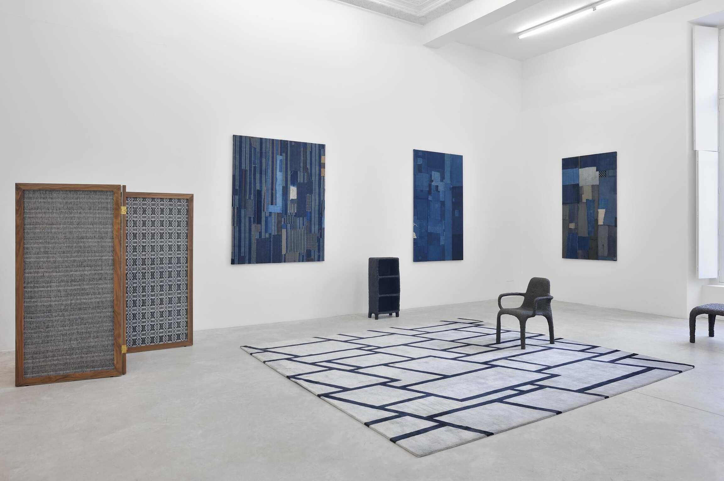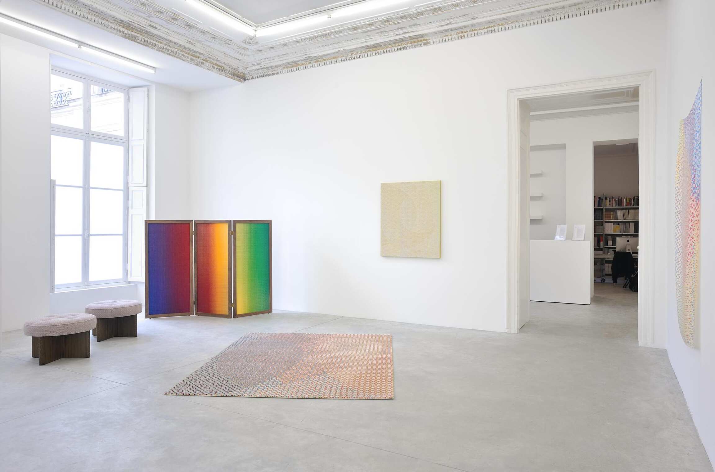 Parfois, le dispositif produit par l’artiste crée un flottement né du brouillage des codes, notamment lorsqu’il confronte un objet utilitaire préexistant à son propre travail. Ce même trouble opère lorsque le geste du peintre investit d’autres supports comme le tapis ou la tapisserie. Ces pratiques évoquent autant les formes hybrides que peut emprunter la peinture que le regard que nous portons sur des oeuvres qui échappent aux catégories.