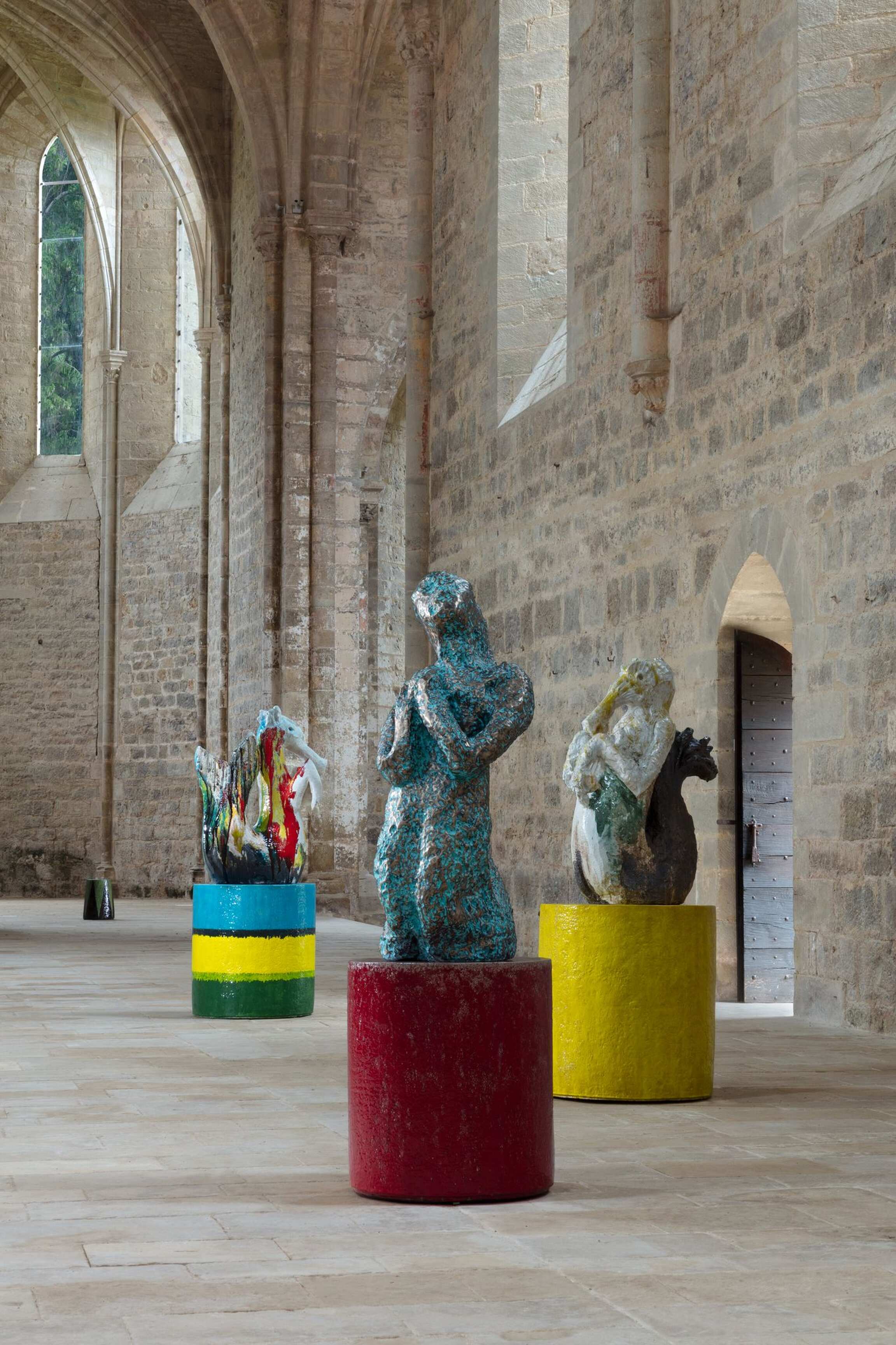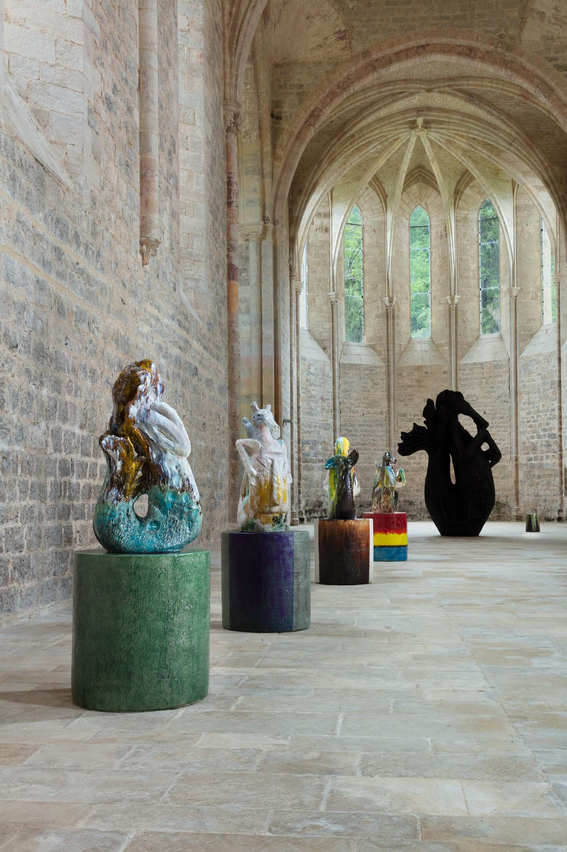 Johan Creten propose une histoire à tiroirs, écrite avec de nombreuses références à l’art roman et gothique, aux mythologies religieuses et païennes, à la peinture et à l’abstraction. Dix Points d’observation (série Cirque) invitent les visiteurs à s’asseoir pour observer les œuvres et l’architecture de plusieurs points de vue. La nef accueille la série des hippocampes et des œuvres questionnant les enjeux du monde contemporain.