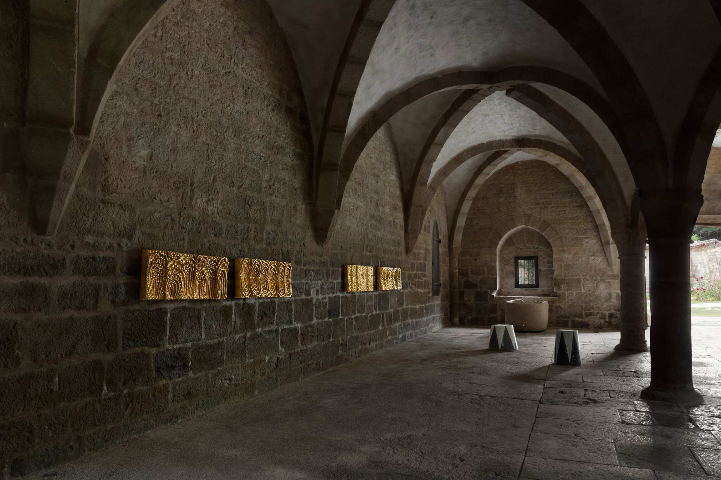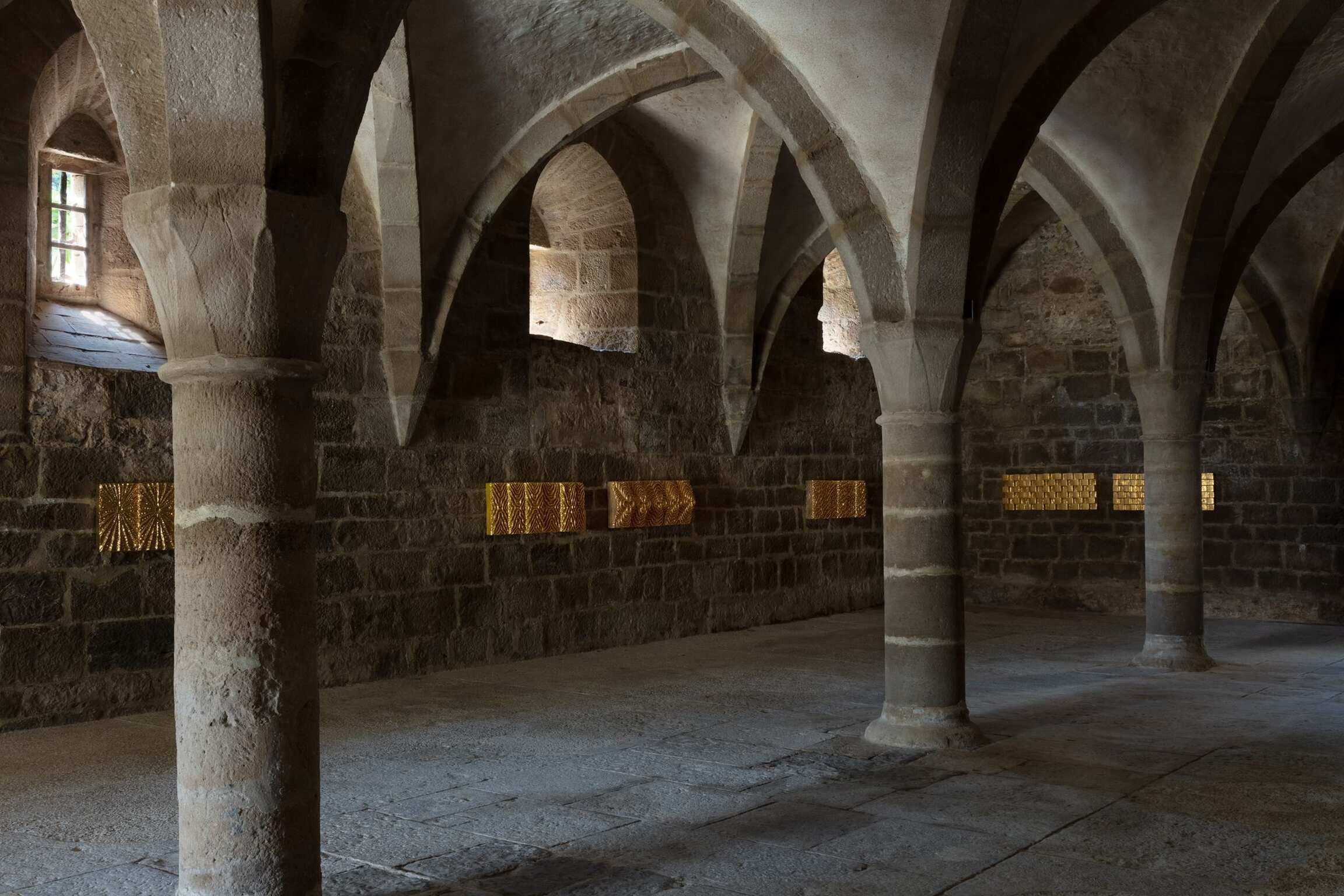 Dans le cellier, Johan Creten expose des reliefs inspirés par l’histoire de l’ornement roman et la symbolique des gloires, terrestre et céleste. The Herring, œuvre énigmatique en bronze doré à l’or blanc, évoque le poisson, symbole de la fertilité et de la vie, chargé d’une connotation spirituelle.