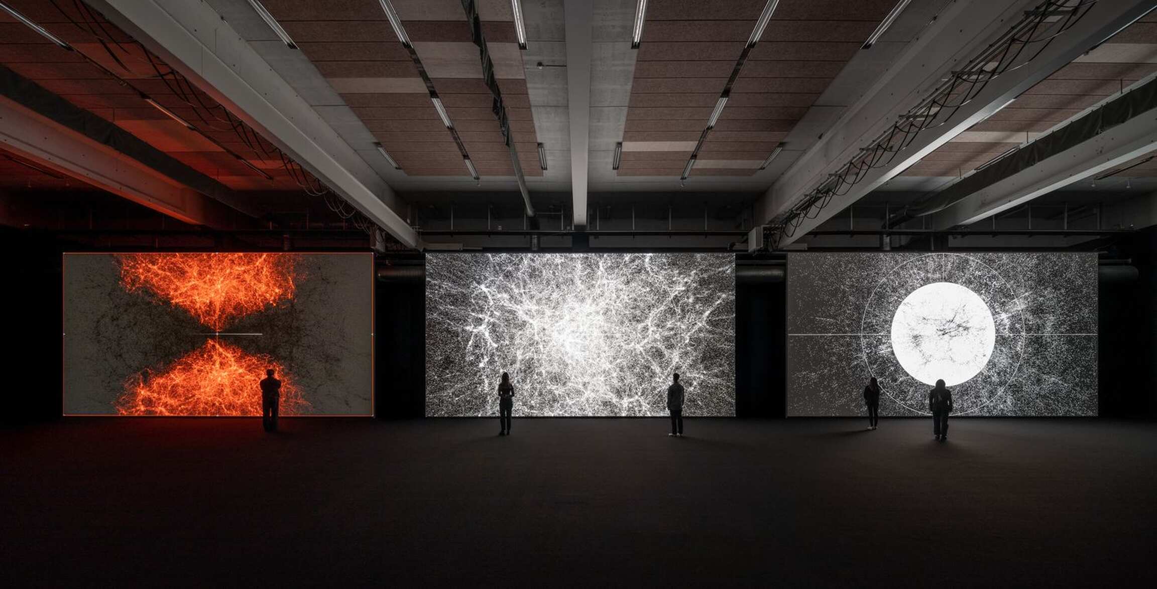 In CC's largest hall, world-renowned Japanese artist and composer Ryoji Ikeda will present his monumental trilogy, "dataverse 1/2/3," for the first time in Scandinavia. Through three monumental video projections, Ikeda orchestrates a sensory explosion of images and sounds, utilizing open-source data on motion obtained from scientific institutions such as CERN, NASA, and the Human Genome Project. This immense audiovisual installation represents three realms: the microscopic natural world of atoms, molecules, DNA, and cells that eludes human sight; the human world we inhabit on Earth, with our brains, bodies, organisms, cities, climates, internet, air traffic, and satellites; and finally, the macroscopic world—from our planet to the solar system, galaxies, the observable universe, and potential multiverses.
