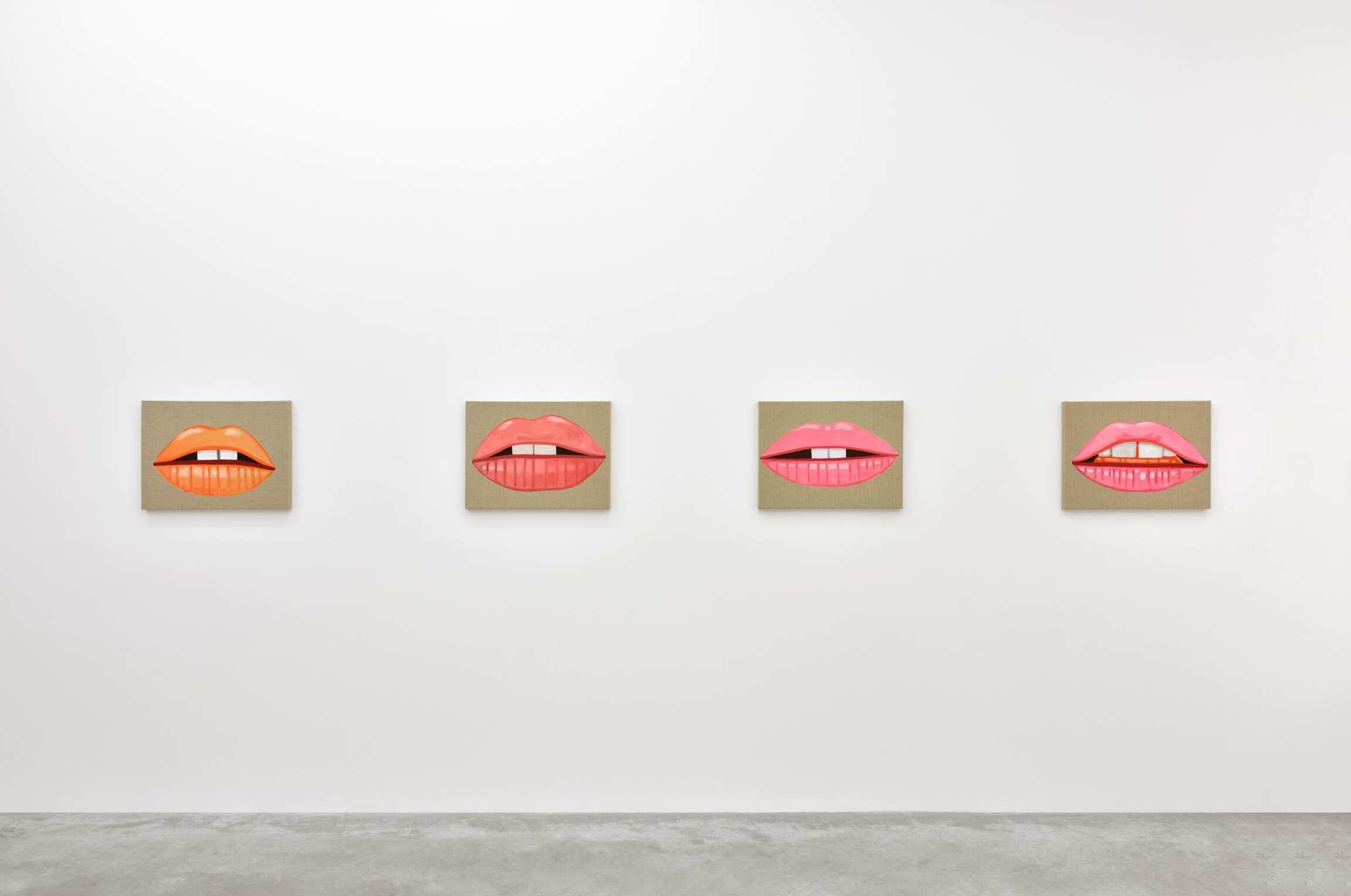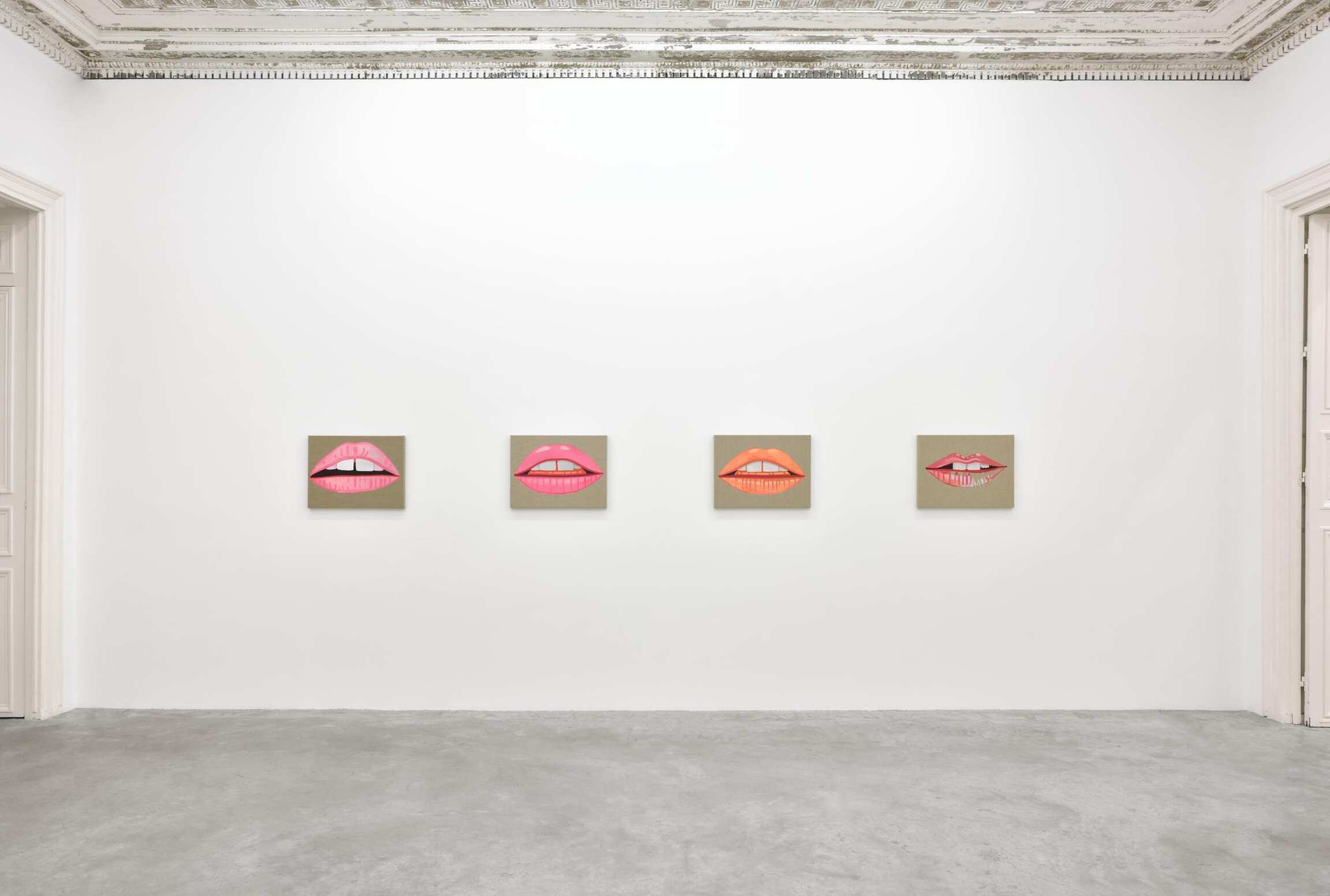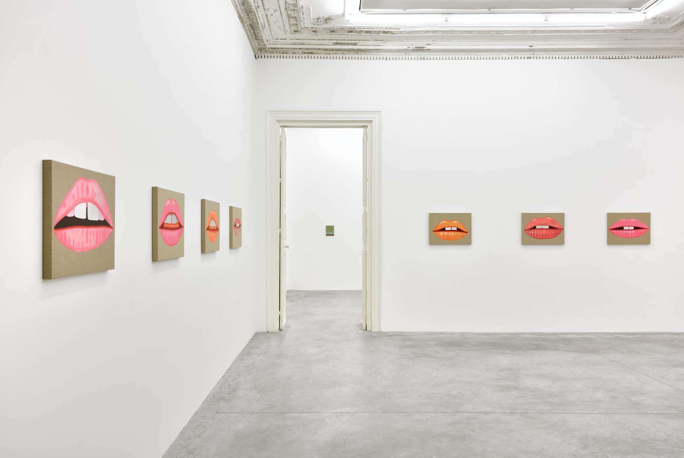 Imaginez, lors du vernissage de Brian Calvin à Paris, surprendre des bribes de conversations entre les invités venus pour l’occasion d’univers différents. Philip Guston par exemple expliquerait à Louis Aragon comment « à l’époque du futur » nous avons hérité du mythe de l’art abstrait : « il y a quelque chose de ridicule et de misérable dans le fait que la peinture soit autonome, pure et réalisée pour elle-même. Au contraire, elle est "impure". C’est l’ajustement de ces "impuretés“ qui en force la continuité. Nous fabriquons des images et les images nous remplissent ». Sur quoi Aragon acquiescerait d’un sourire avant de poursuivre son chemin. Les lèvres représentées sur l’ensemble des petites toiles intitulé Mouthfeel capteraient son attention.