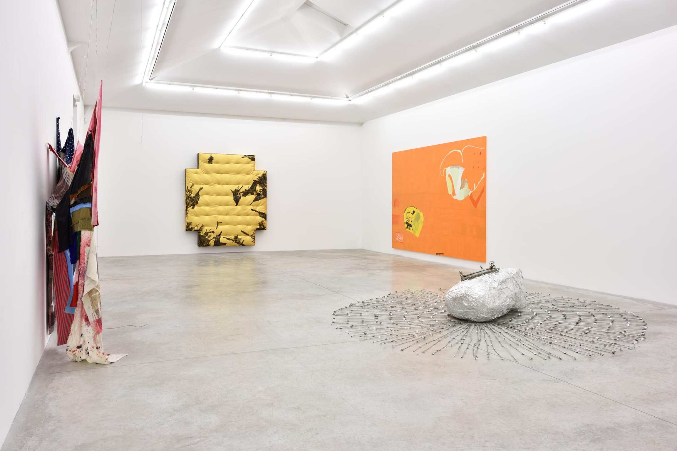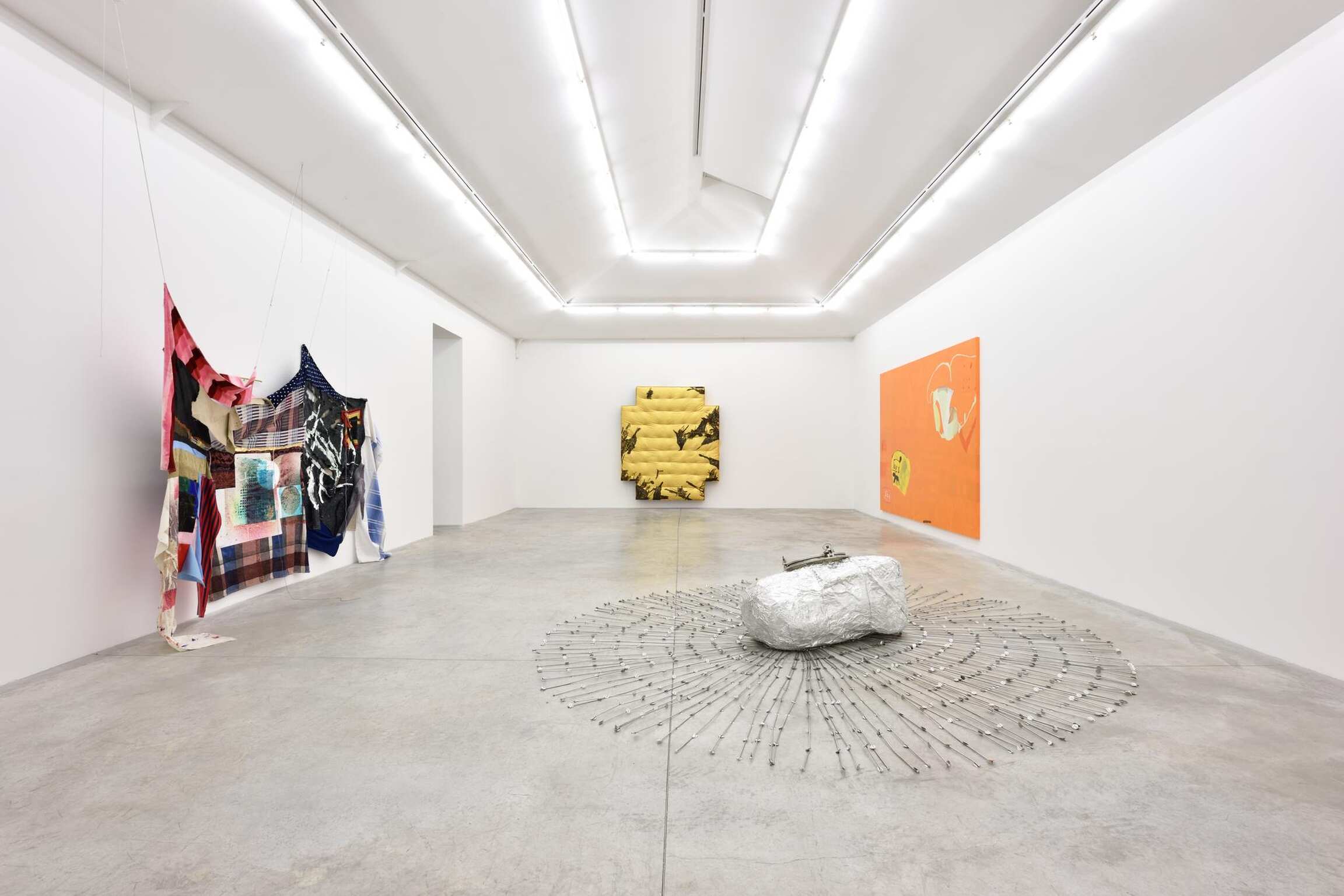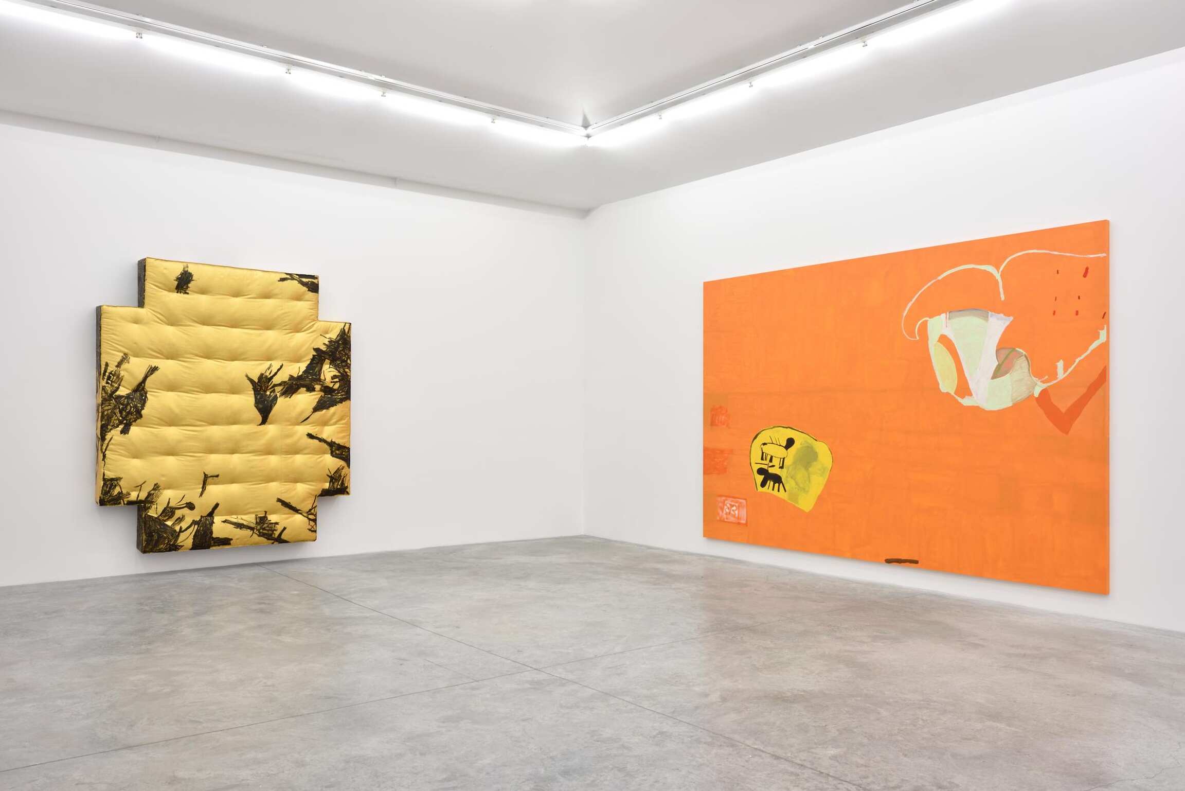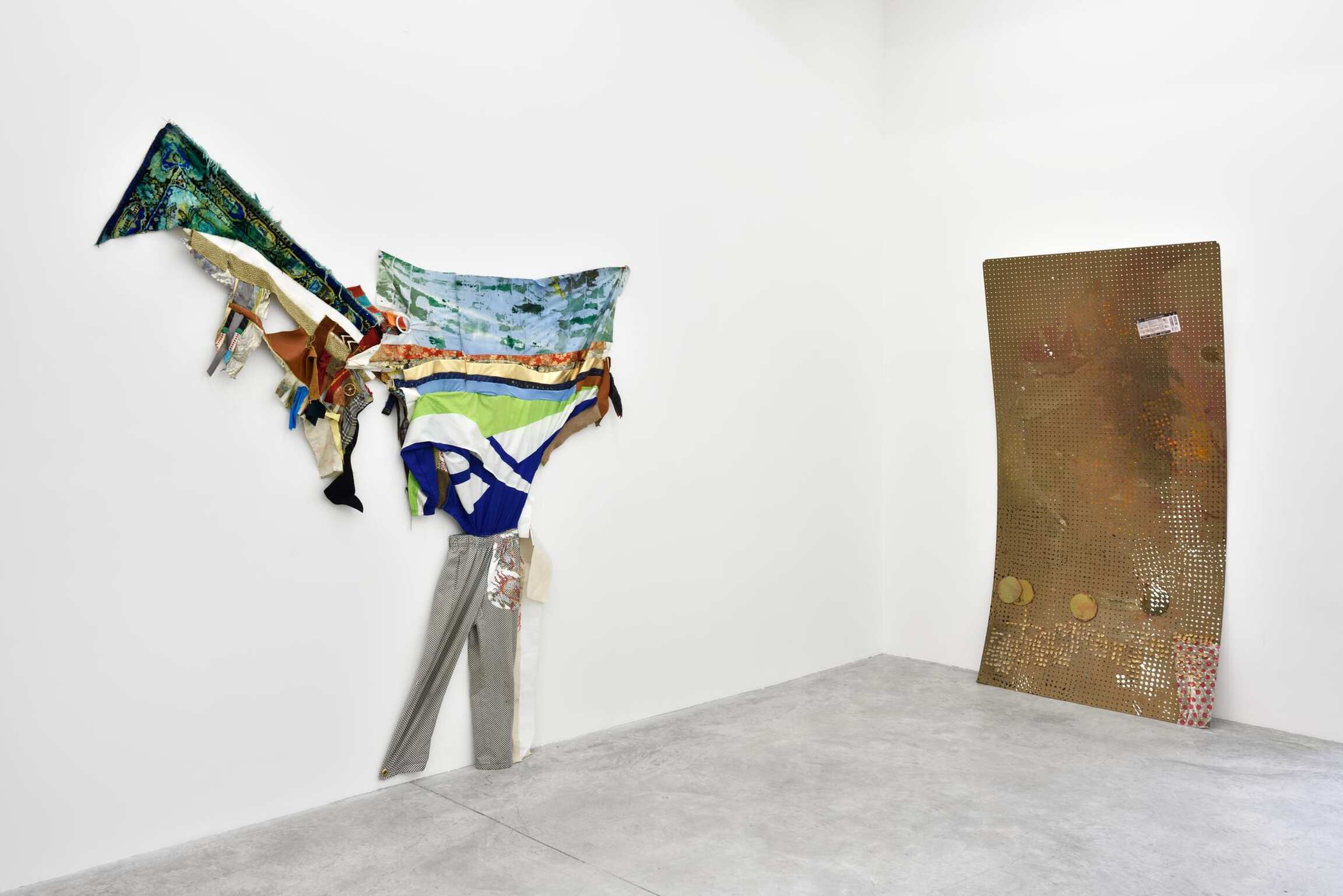 In addition to fluidly combining painting and sculpture, both artists also share a visual language that explores spatial relationships and questions the gesture's role in conceiving form. Torey Thornton’s work oscillates between legibility and abstraction, resulting in a tension that confuses our interpretation of pictorial arrangement. Utilizing common items, primarily textiles and other readymade objects, Eric Mack intervenes on these materials with paint and dye, creating a fusion of incongruous elements. Mack thinks “… a lot about abstraction and how to translate that from everyday experience.” Each artist challenges the limits of perception through surprising combinations of color and form, perspective and scale.