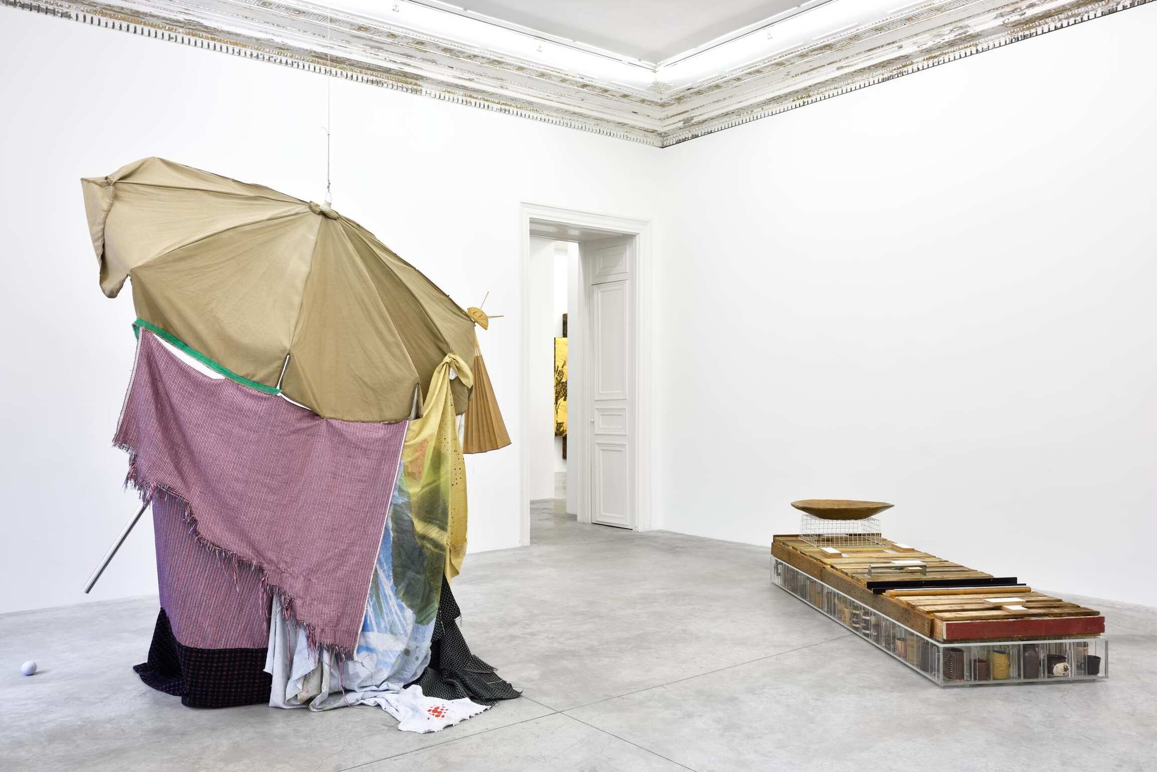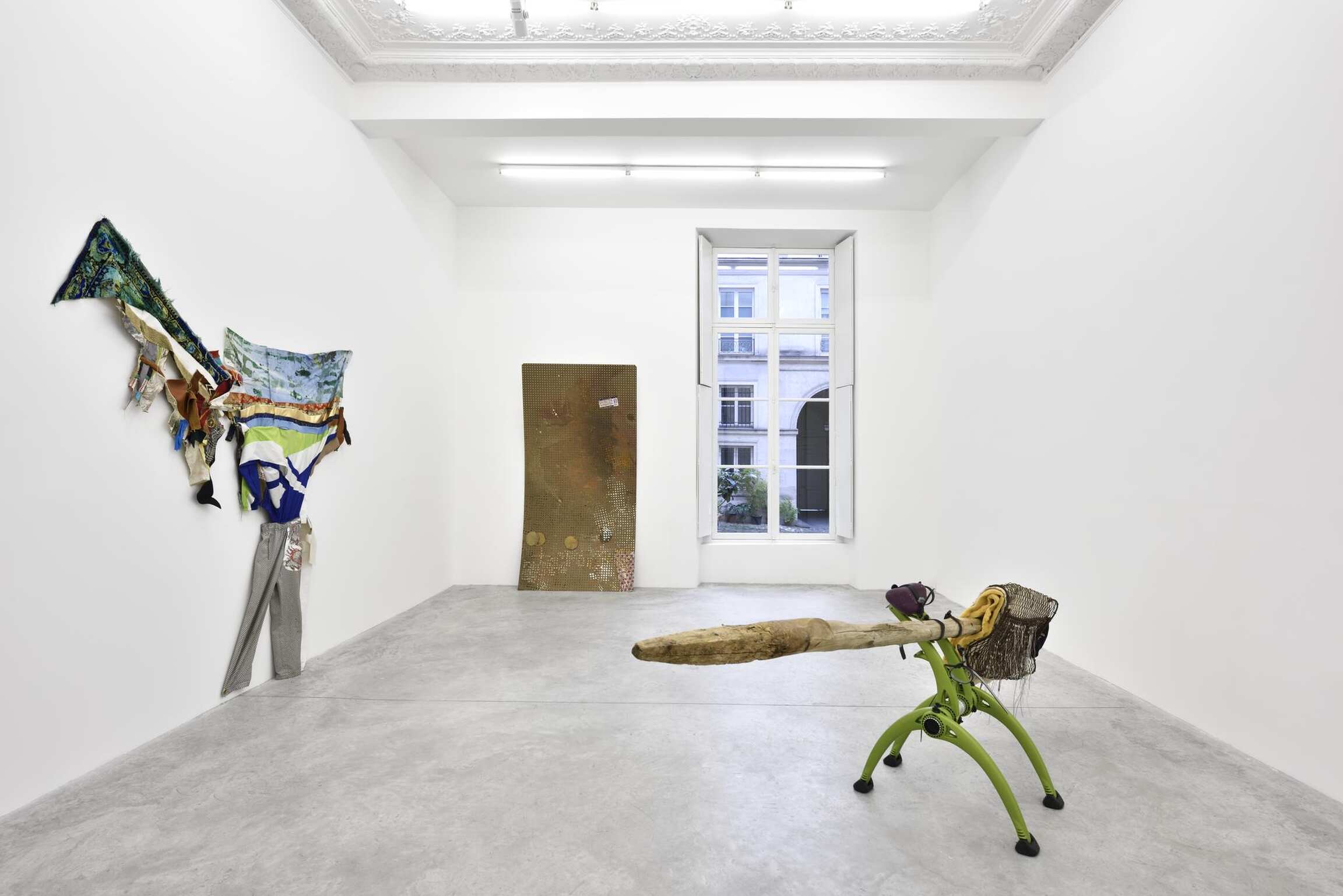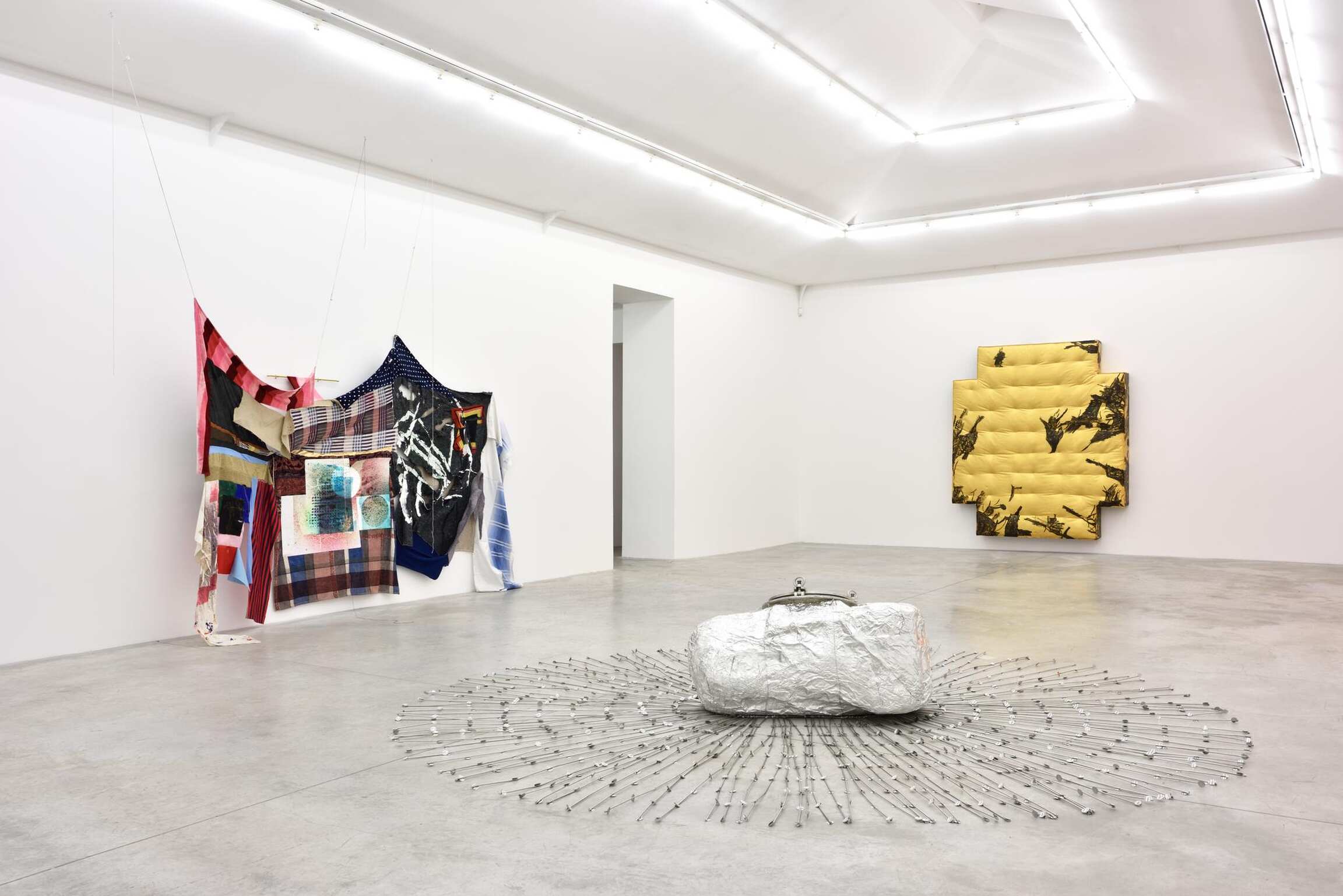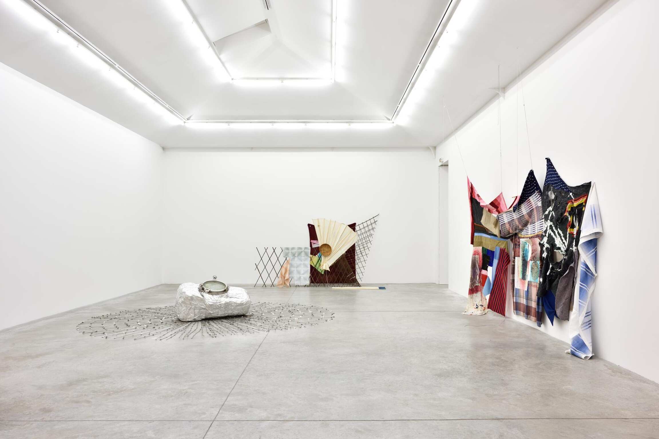 In addition to fluidly combining painting and sculpture, both artists also share a visual language that explores spatial relationships and questions the gesture's role in conceiving form. Torey Thornton’s work oscillates between legibility and abstraction, resulting in a tension that confuses our interpretation of pictorial arrangement. Utilizing common items, primarily textiles and other readymade objects, Eric Mack intervenes on these materials with paint and dye, creating a fusion of incongruous elements. Mack thinks “… a lot about abstraction and how to translate that from everyday experience.” Each artist challenges the limits of perception through surprising combinations of color and form, perspective and scale.