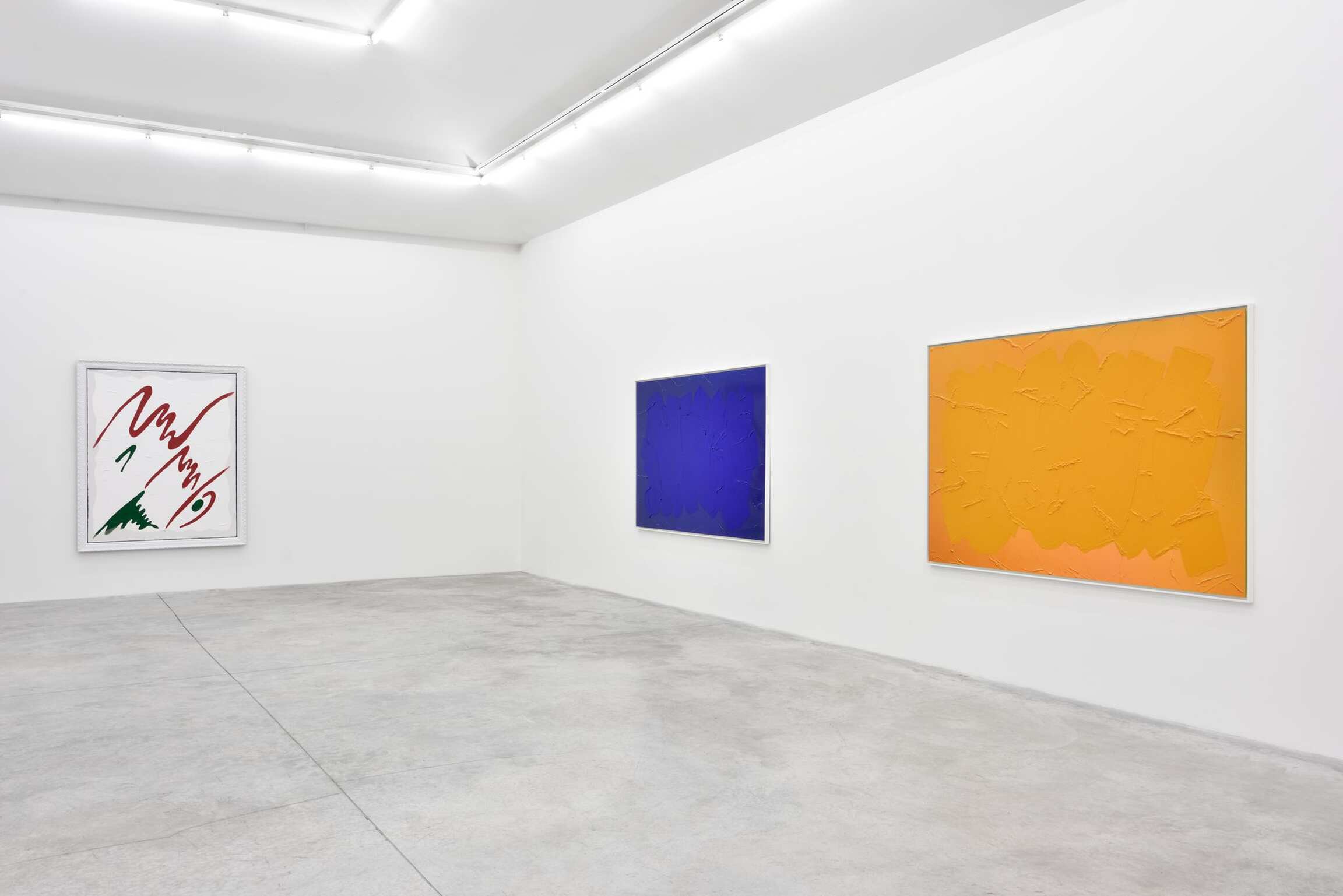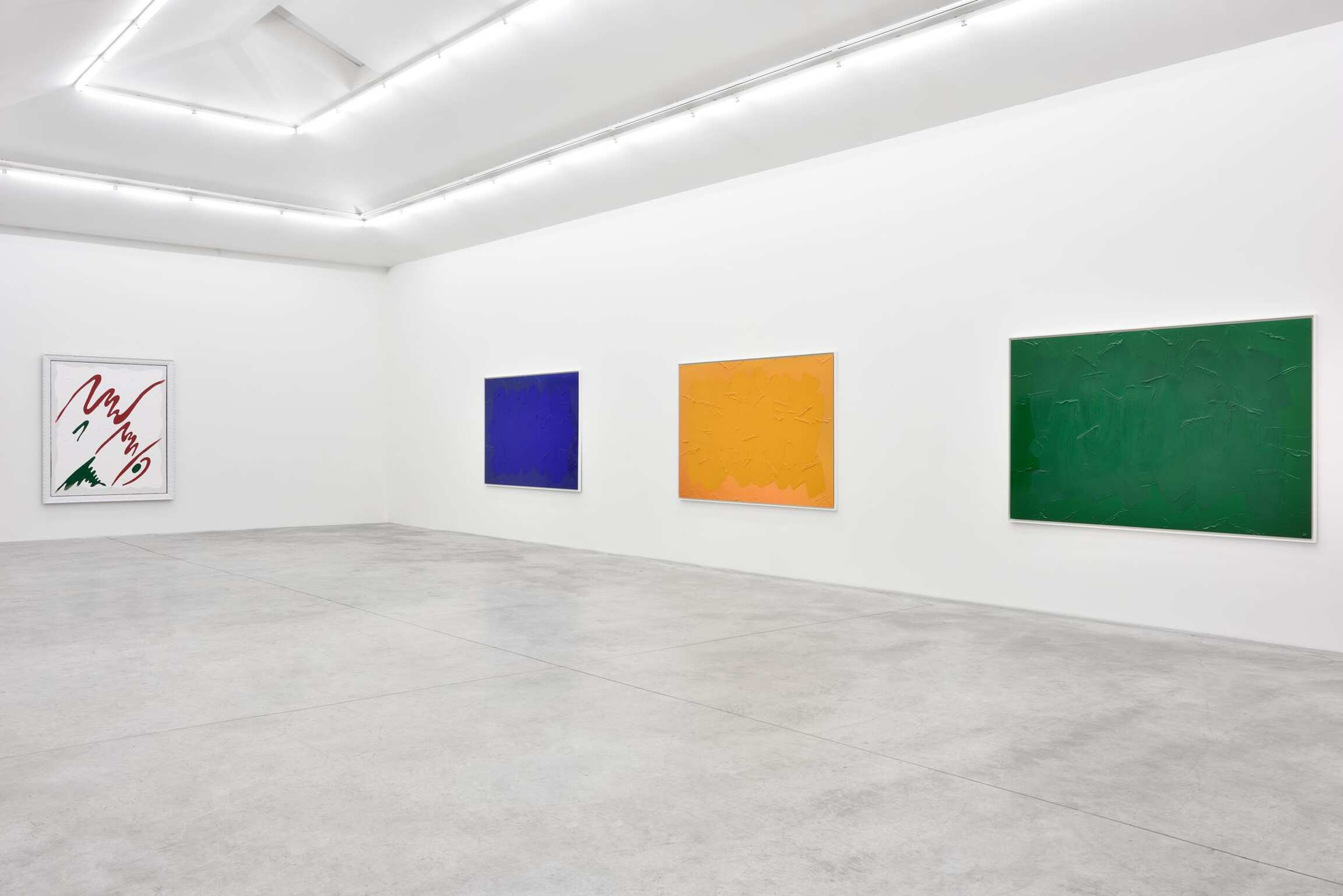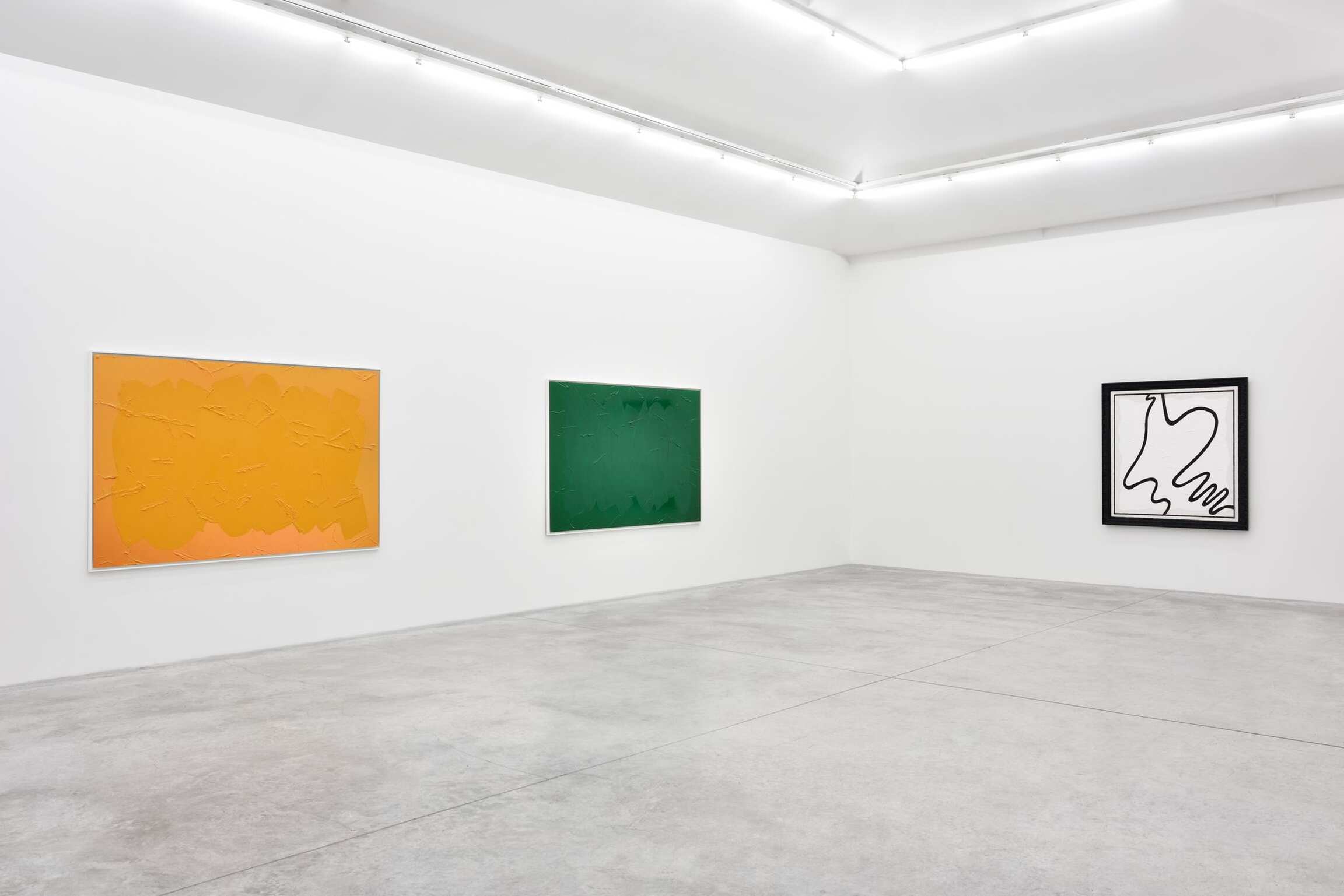Pour sa nouvelle exposition parisienne, l’artiste opère un tour de vis supplémentaire. Il aborde frontalement la question de la peinture et de la sculpture. A cappella. Le titre fait ici office de méthode. B.L. aime filer la métaphore musicale. Il évoque sa démarche comme une stridence qui consiste à « monter le niveau sonore ou visuel à une hauteur qui serait comparable au phénomène de l’incandescence ». Pour cette exposition, nul besoin pour l’artiste d’accompagnement instrumental. Ainsi ces trois monochromes qui nous accueillent : Bleu cobalt (2017), Jaune cadmium clair (2017) et Vert permanent (2017) renvoient à la série initiée en 1986 : des photographies de surfaces colorées peintes recouvertes à l’identique, de la manière la plus illusionniste possible. Dans cette série, B.L. mettait ostensiblement en exergue les différences entre peinture et photographie. Cette dimension pédagogique a aujourd’hui disparue. La différence se fait aujourdhui plus ténue, même si elle reste visible ; elle demande plus d’attention de la part du regardeur. La touche employée ici n’est pas celle de Van Gogh — qualifiée de « moderne » par l’artiste — mais celle, plus « contemporaine », du brush stroke de l’expressionnisme abstrait, dont B.L. a trouvé l’équivalence spontanée et populaire dans les vitrines passées au blanc d’Espagne de la rue Louise Weiss ou de l’avenue Montaigne à Paris. Cet effet de brouillage est également présent, d’une autre manière, dans les paysages réalisés à partir des panneaux de signalisation d’autoroutes (Paysages aixois, 2015 et Sombernon, 2016), recouverts mimétiquement d’acrylique à l’aide justement, impressionnisme oblige, de la touche Van Gogh. Que voyons-nous ? A la fois un objet de signalisation peint et une peinture de paysage. Le panneau est destiné primitivement à désigner le paysage qui se trouve hors de lui. L’opération de recouvrement effectuée par B.L. nous oblige à considérer l’objet que nous avons sous les yeux comme un paysage coupé de son contexte. De dispositifs touristiques, censés indexer un paysage ou un monument typiques, ces panneaux accèdent ainsi au statut de peintures. Par cette opération, B.L. retrouve le vrai sens étymologique du pittoresque : ce qui est digne d’être peint. Logique à rebours. Les peintures et sculptures de Bertrand Lavier réalisées à partir d’une bande dessinée de Walt Disney (Walt Disney Productions) nous font comprendre, de la même manière et de façon jubilatoire, en quoi les images de référence ont autant à voir avec l’histoire de l’art moderne qu’avec celle de la B.D.
