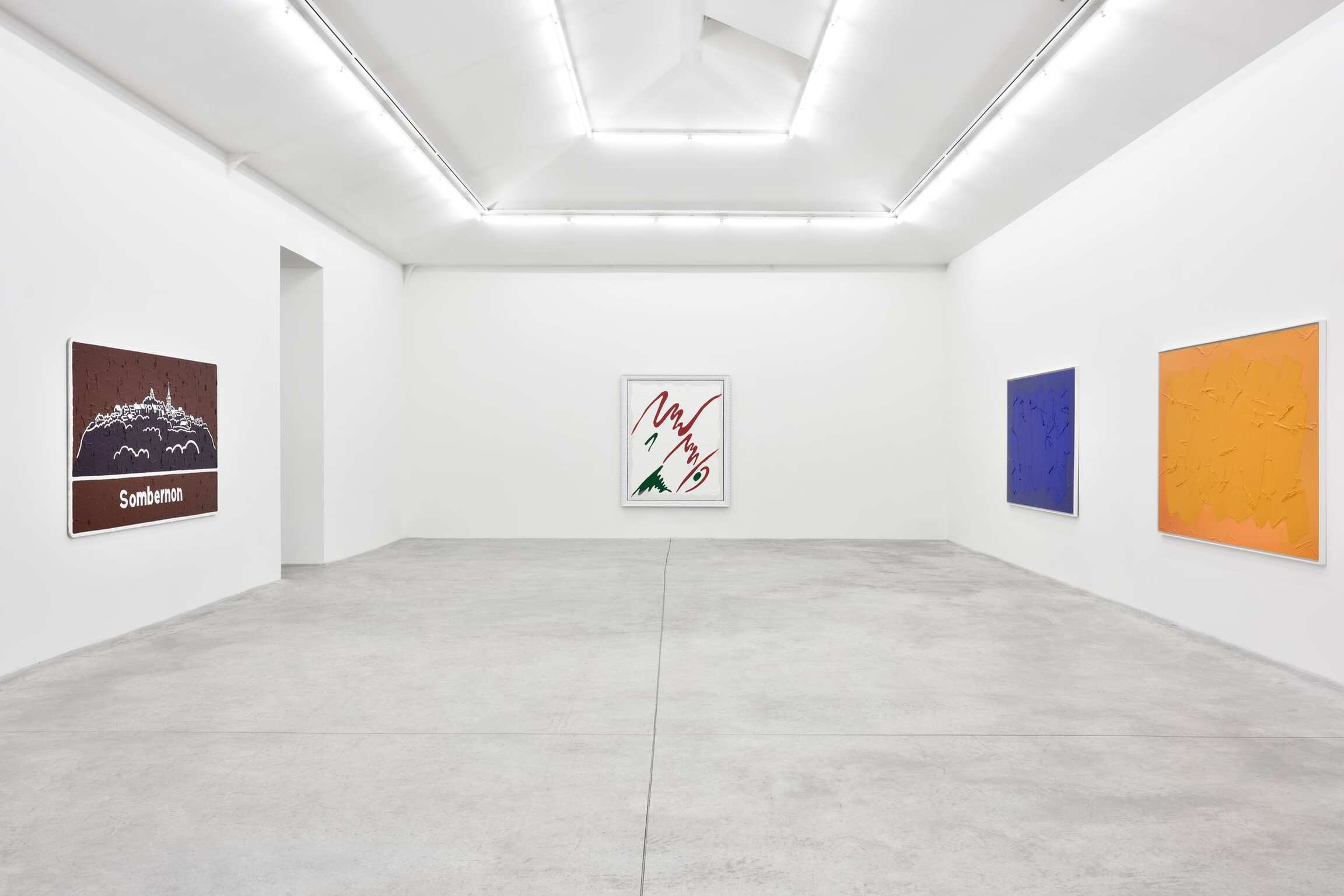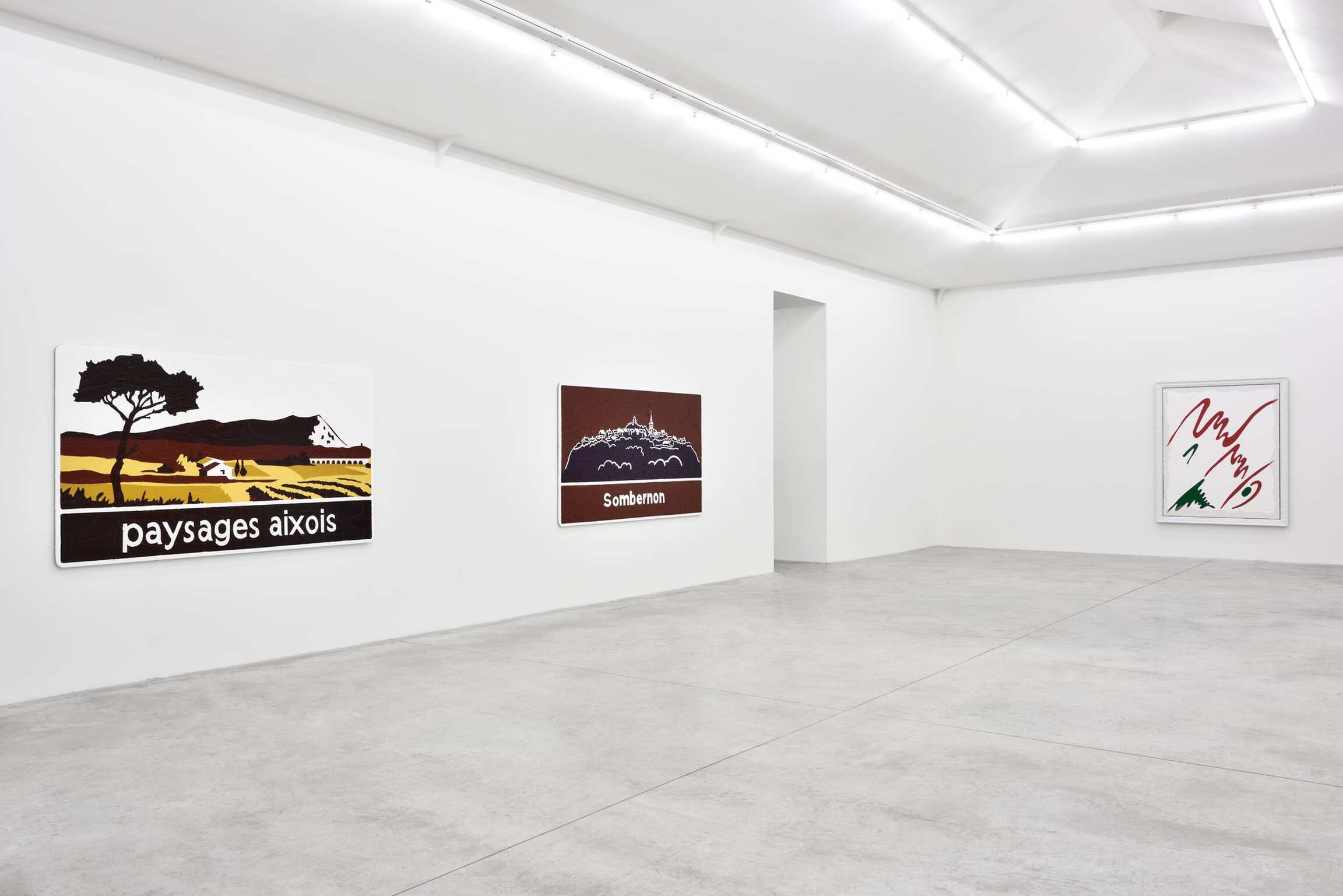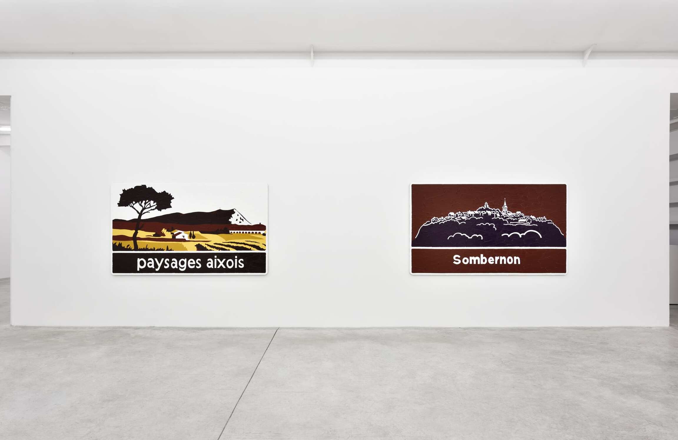 For his new exhibition in Paris, the artist goes on playfully tackling this question of painting and sculpture with one additional twist: A cappella, the title of the show, serving him as a method. Indeed, Bertrand Lavier enjoys spinning the musical metaphor, actually describing his practice as a stridence, which consists in “turning up the acoustic or visual volume to a level that could be compared to the phenomenon of incandescence.” That said, no instrumental accompaniment was needed here, hence the artist’s three monochromes that welcome us into the exhibition: Bleu cobalt (2017), Jaune cadmium clair (2017) and Vert permanent (2017). These three works further a series of monochromes, which was initiated in 1986. They are photographs of previously colored surfaces, over which the artist repainted identically, that is, the most illusionistically possible, the initial compositions. If Bertrand Lavier originally meant to highlight in this series the difference between painting and photography, the didactic dimension has since disappeared. Even though it remains visible, the distinction has now become subtler and requires more attention from the viewer. The brushwork over the photographed monochromes isn’t that of Van Gogh, which the artist qualifies as “modern,” yet it evokes the more “contemporary” touch of abstract expressionism, a spontaneous and popular equivalent of which Bertrand Lavier found on the display windows sprinkled with whiting of rue Louise Weiss or avenue Montaigne in Paris. This blurring effect takes on another form in the landscapes Paysages aixois (2015) and Sombernon (2016), which were made on found tourist signs. The artist mimetically covered them with acrylic paint and this time, impressionism oblige, a hint of Van Gogh’s stroke. What we end up seeing are both a painted tourist sign and a landscape painting. Whereas such signs are primarily designed to point at a landscape unfolding beyond them, Bertrand Lavier’s process of repainting over (and after) them forces us to reconsider the object before our eyes as a landscape that has been cut out of its context. Thus these touristic means, which are intended to index typical places or monuments, gain the status of paintings. Through this operation, Bertrand Lavier uncovers the true etymological sense of the picturesque, that is, what is worthy of being painted.