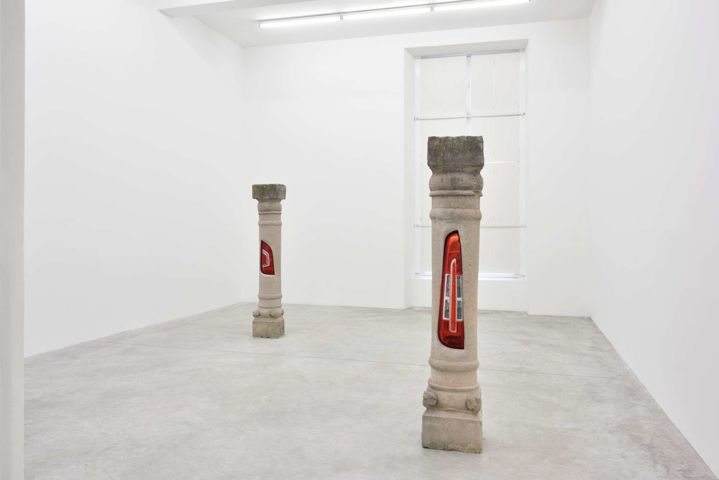 Quand en 1984, Bertrand Lavier hisse un réfrigérateur sur un coffre-fort, il met en perspective critique la dialectique socle/statue inaugurée par Rodin et Brancusi, tout en opérant une manière de greffe (l’artiste a retenu cette notion de ses études d’horticulture). Le feu arrière de la berline Ford serti dans une vieille colonne en pierre (Colonne Ford, 2017) exprime littéralement et spectaculairement cette opération en construisant une situation visuelle inédite à partir d’éléments ayant déjà fait preuve, ailleurs et autrement, de leur efficience.