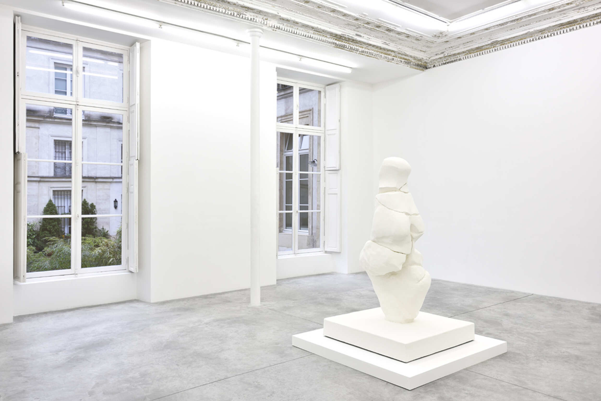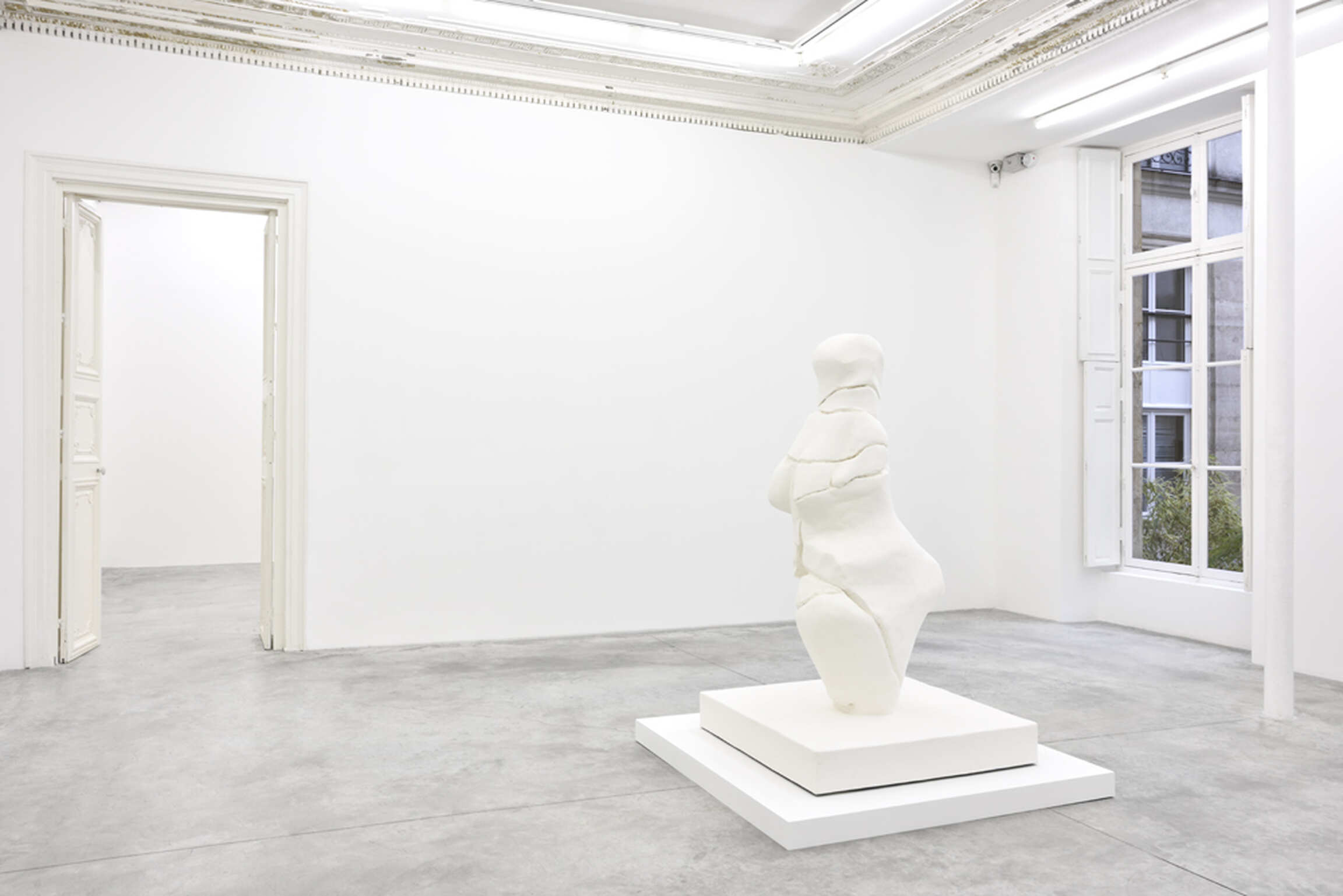 Finally, La Vénus d’Amiens (2016) is reminiscent of Nautiraid (2002), although it inverses the latter’s logics. Whereas Nautiraid gave a slightly futuristic twist to the practice of archaeology with the restoration of a contemporary object, a damaged kayak, La Vénus d’Amiens defies the laws of History in an even more untimely way. The referential object is over 23,000 years old. It consists of 19 fragments of limestone, which were found as a shapeless pile on the site of Renancourt in 2014, and which – once assembled – almost integrally reconstituted a 15-centimeter-high Venus from the Paleolithic era. Using the most contemporary tools of 3D modeling, Bertrand Lavier has transformed this statuette and its exaggerated sexual attributes into a near 2-meter-high sculpture. In doing so, he has displaced it from its archaeological context to grant it instead an eminently sculptural status within the great tradition of academic statuary. This academic dimension is further highlighted by the use of plaster. Plaster casts have been used in Europe since the 18th century as means allowing the students to access the “originals” of antique or classical sculptures without having to leave the academies or travel anywhere. Bertrand Lavier could have transposed this Venus into a nobler material (such as marble or bronze) or a more contemporary one (such as resin or nickel bronze), but he chose a material, which belongs – classically speaking – to the realm of the copy or reproduction. Reversing the usual order of precedence is a way for the artist to make this statuette from the Cro-Magnon era enter the global history of sculpture, as well as to short-circuit the temporalities of History and Art. A cappella, that is, without useless sophistication, with the humblest material there is.