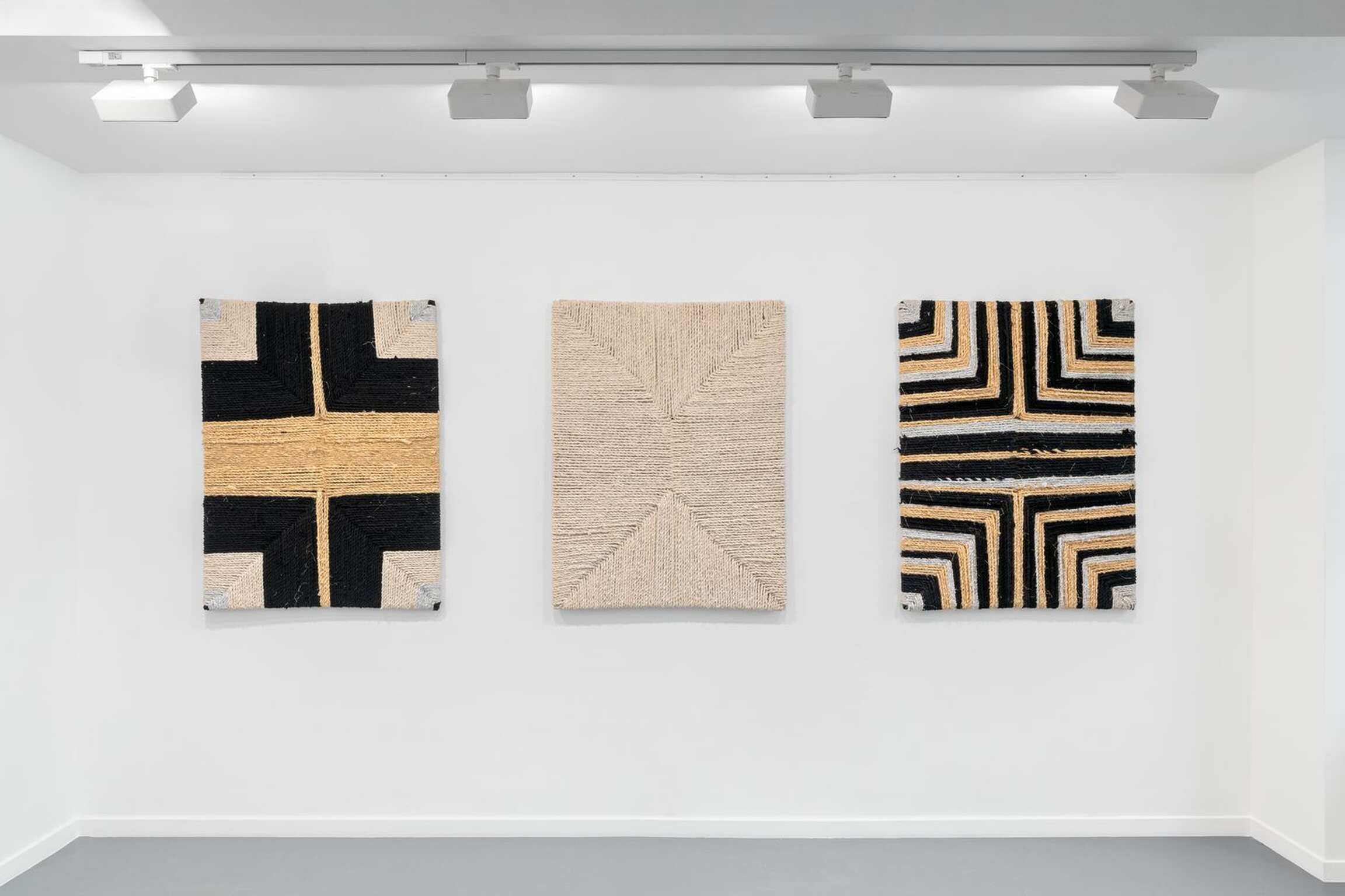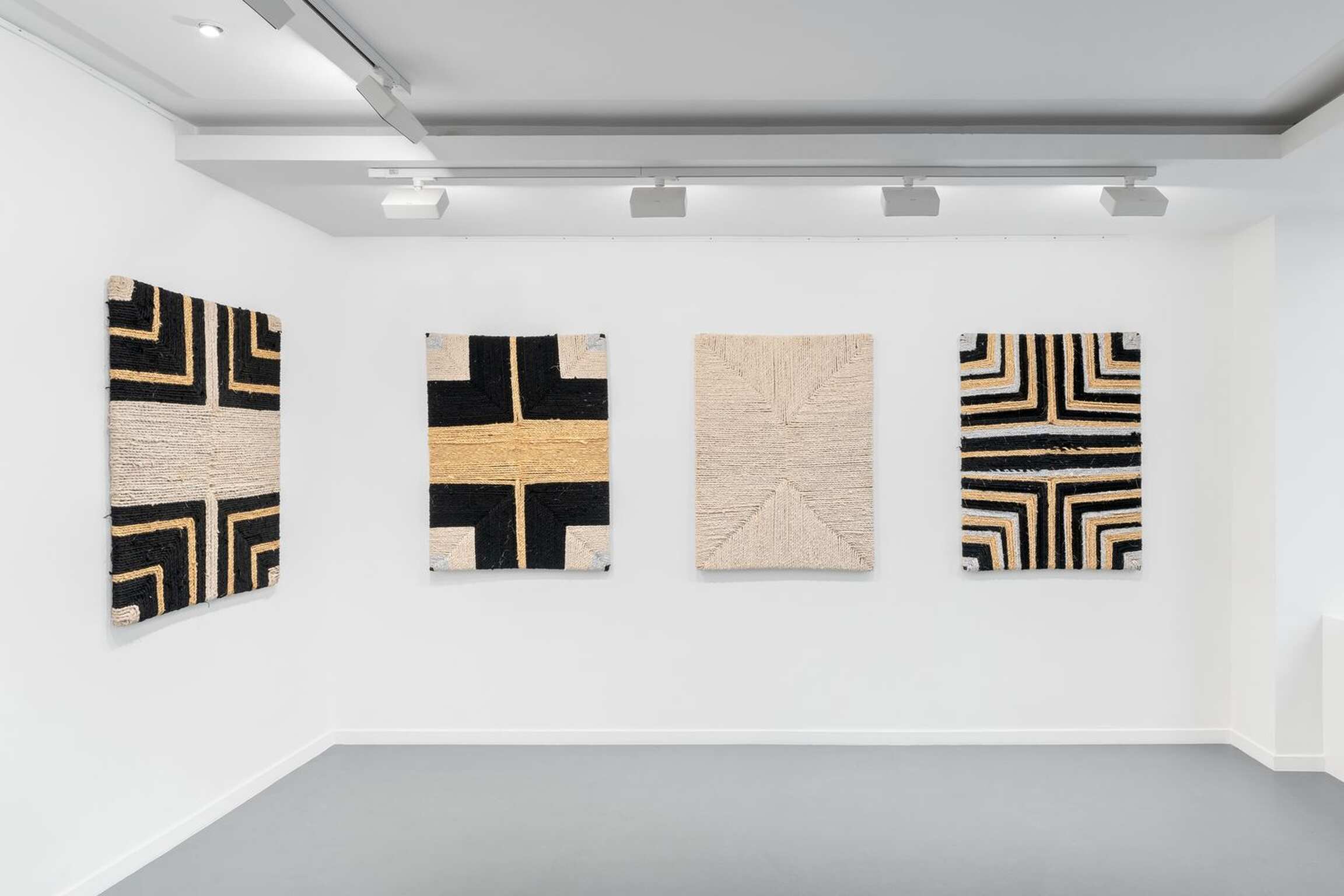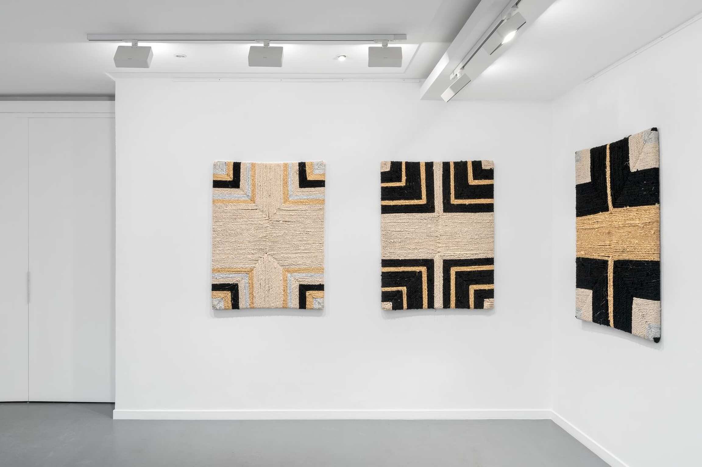 LITANIE DES HORIZONS OBSCURS emerged from the union of ancient know-how[2] and a weaving technique that appeared in the rural areas of Morocco in the 1960s, consisting in making rugs using old textiles[3]. Here, the usually knotted recycled cloths are twisted, then arranged as a set of boards of absolutely identical measurements, as if honouring the repetition of a secular gesture. Unusual nuances are created in the composition: ochre cottons, silvery jerseys and golden viscoses intertwine in the black and white monochromes, emblematic of the artist's work, to display a kinetic variation in nine stages.