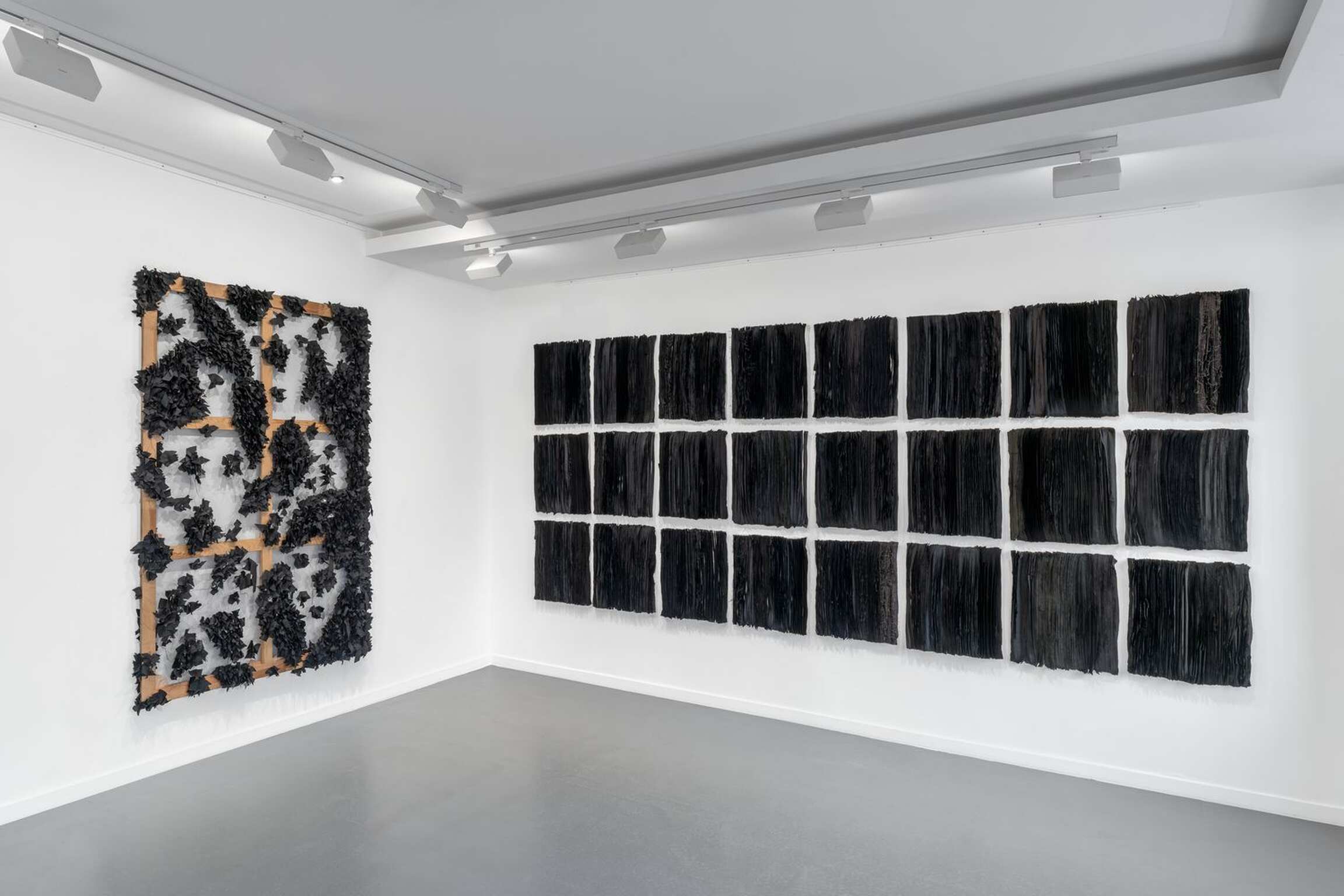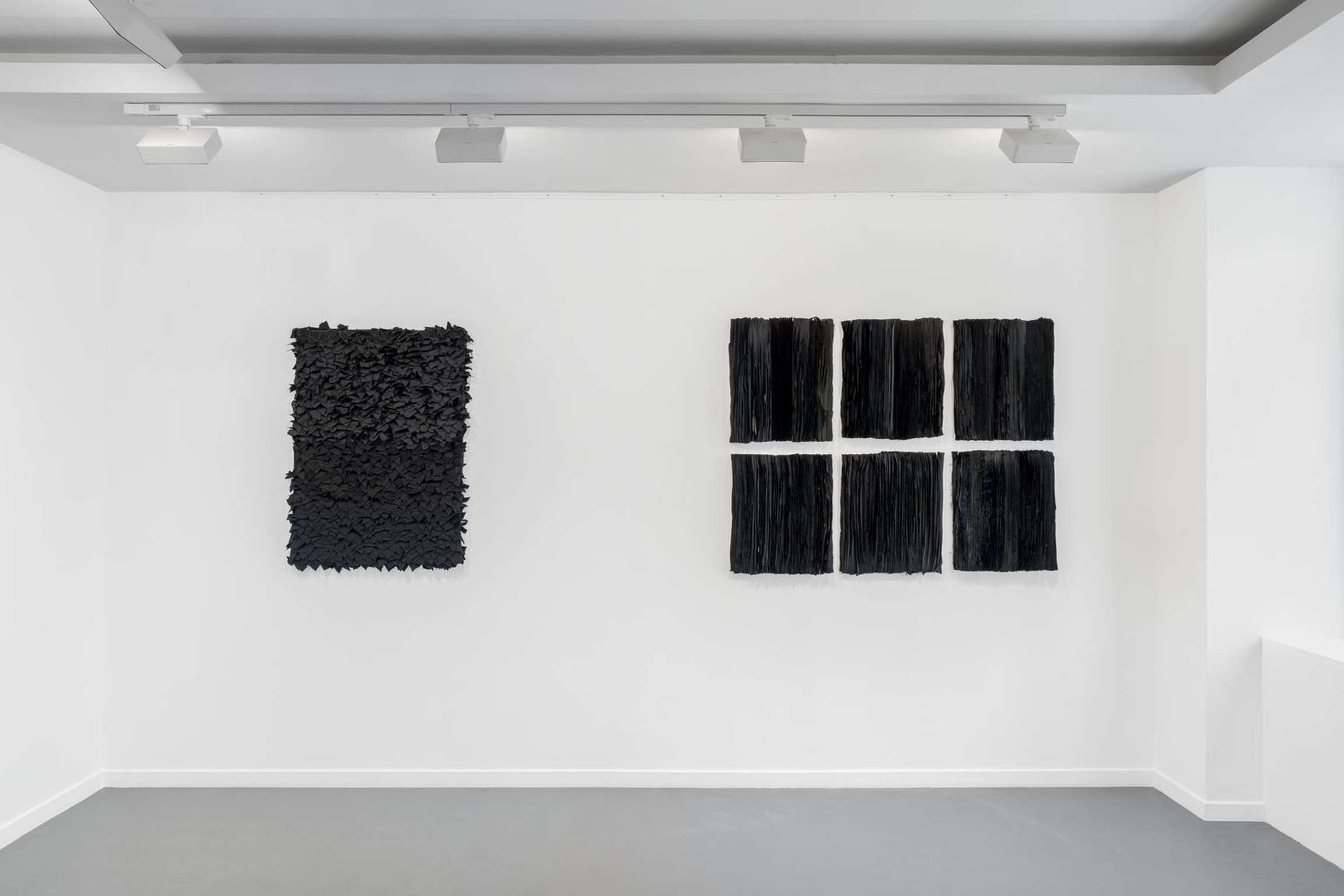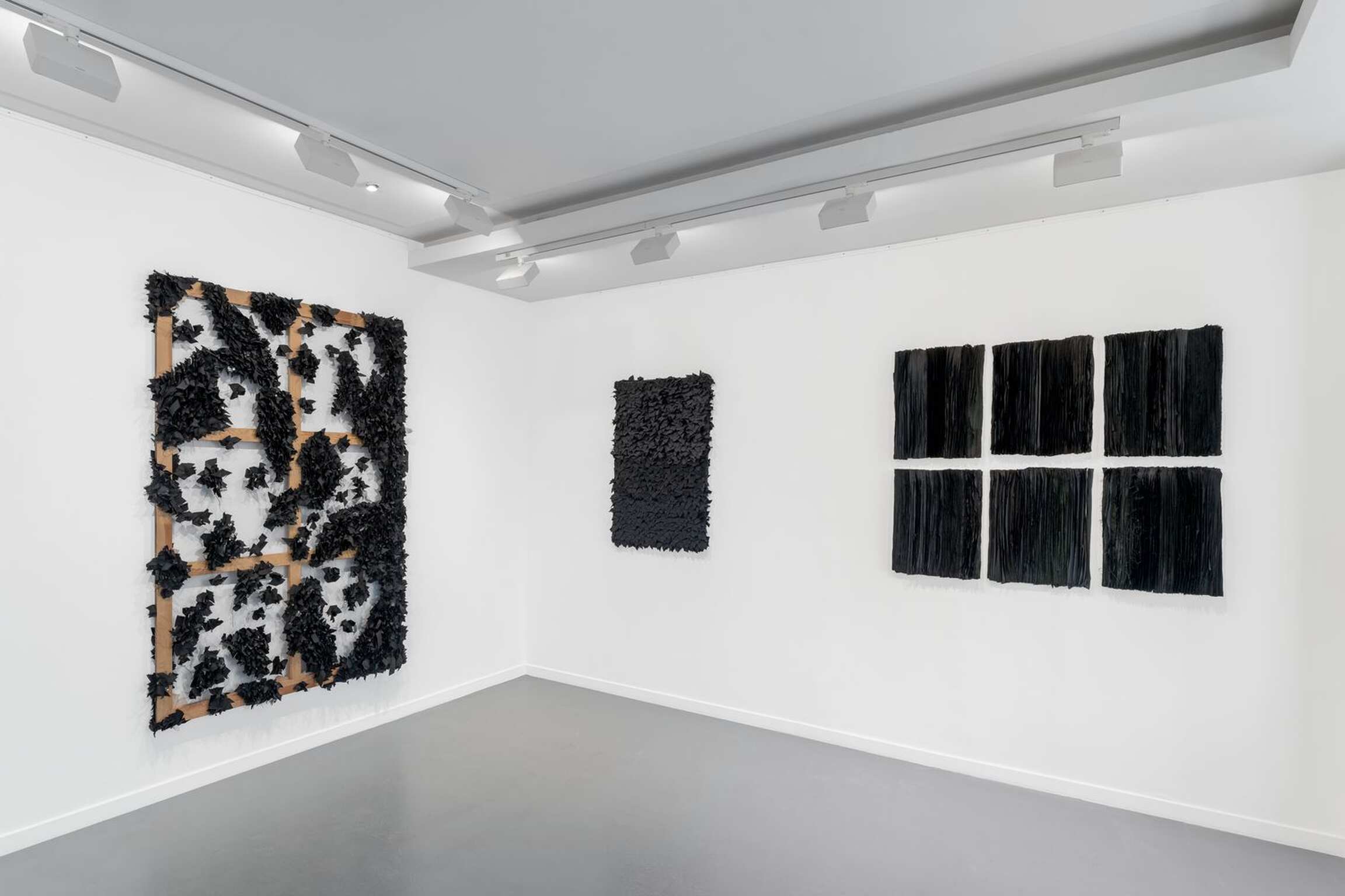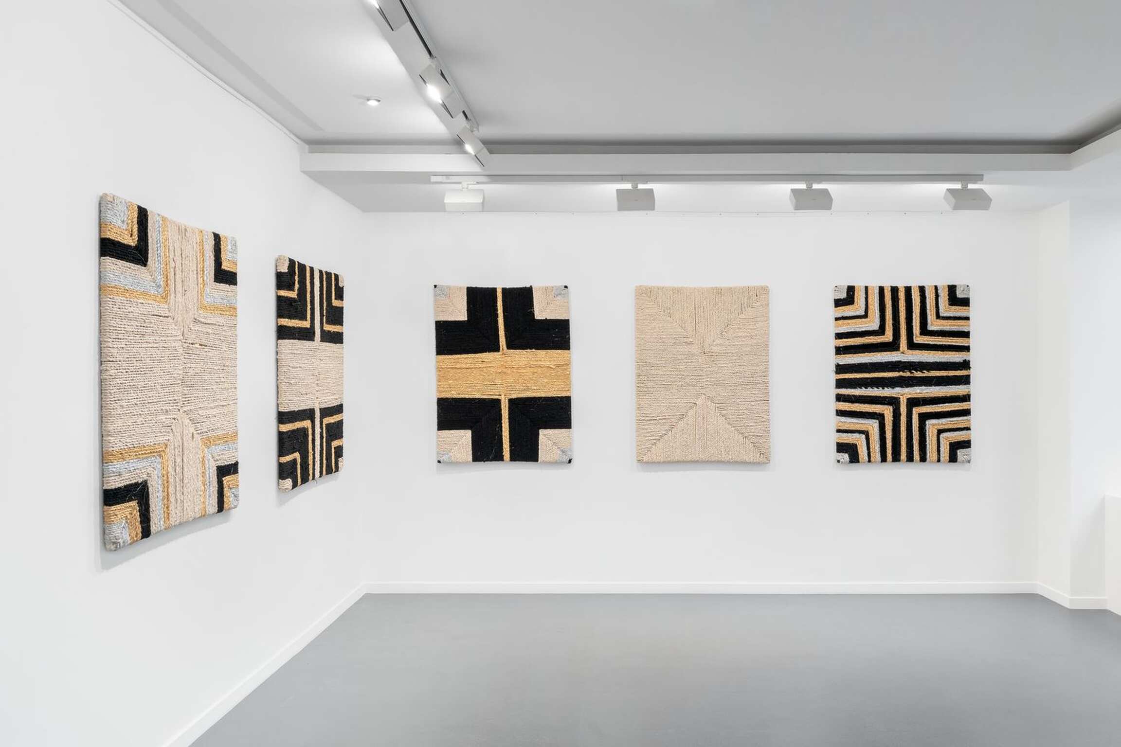 LITANIE DES HORIZONS OBSCURS emerged from the union of ancient know-how[2] and a weaving technique that appeared in the rural areas of Morocco in the 1960s, consisting in making rugs using old textiles[3]. Here, the usually knotted recycled cloths are twisted, then arranged as a set of boards of absolutely identical measurements, as if honouring the repetition of a secular gesture. Unusual nuances are created in the composition: ochre cottons, silvery jerseys and golden viscoses intertwine in the black and white monochromes, emblematic of the artist's work, to display a kinetic variation in nine stages.