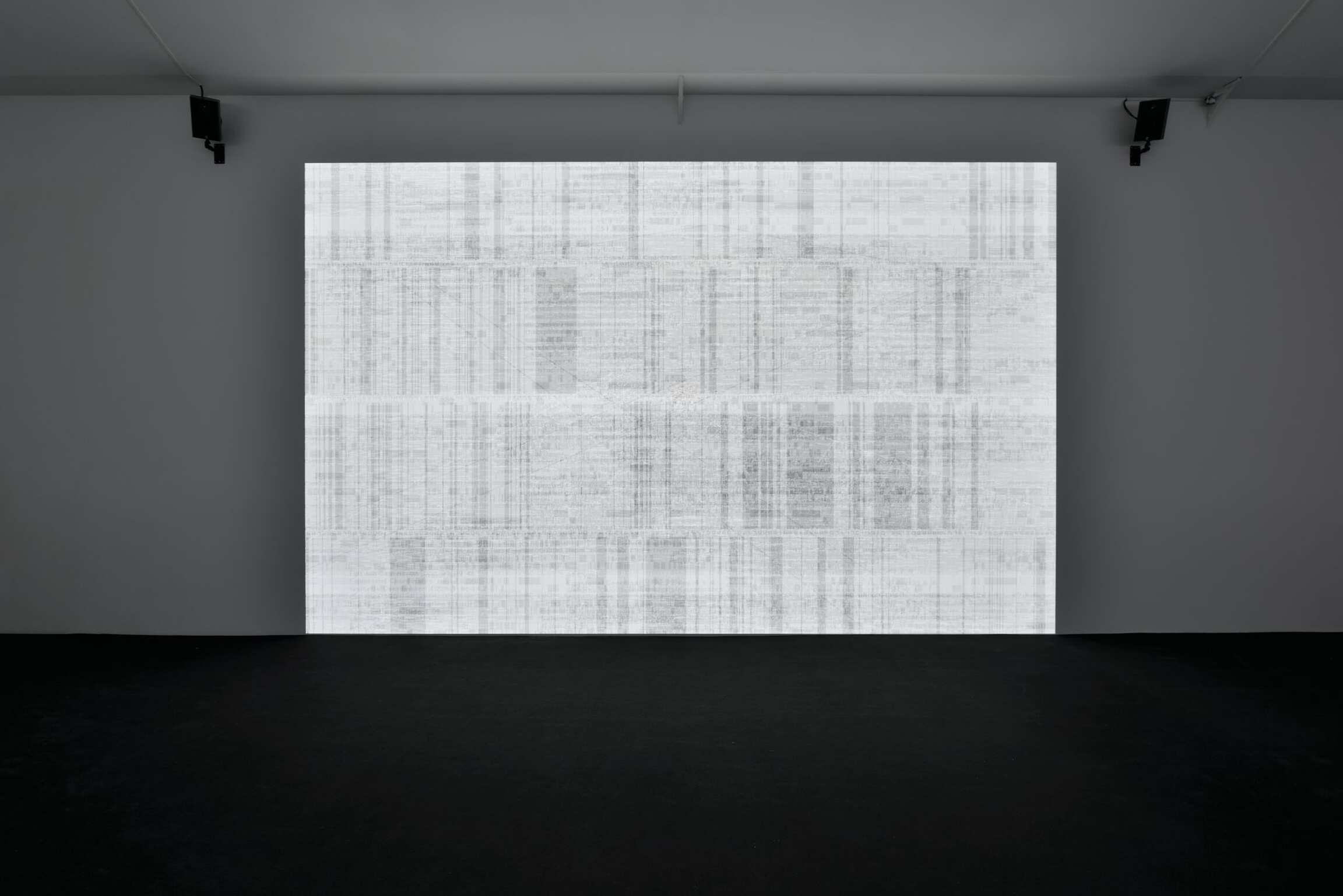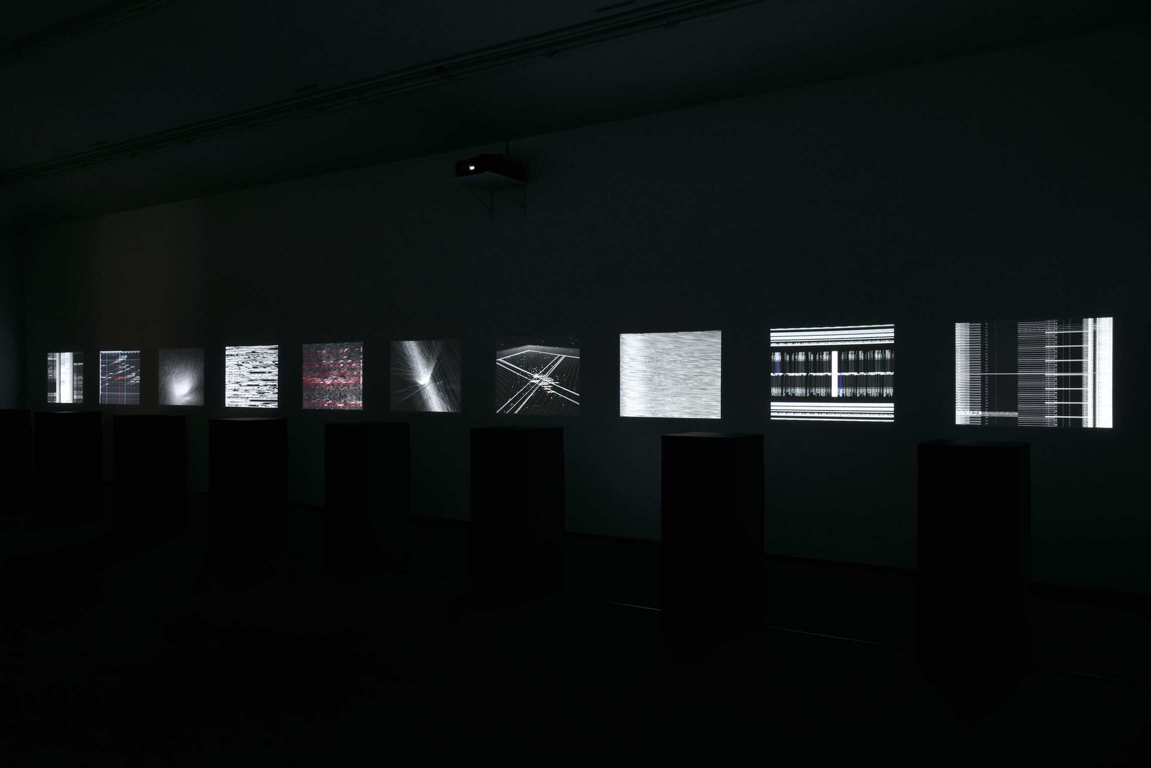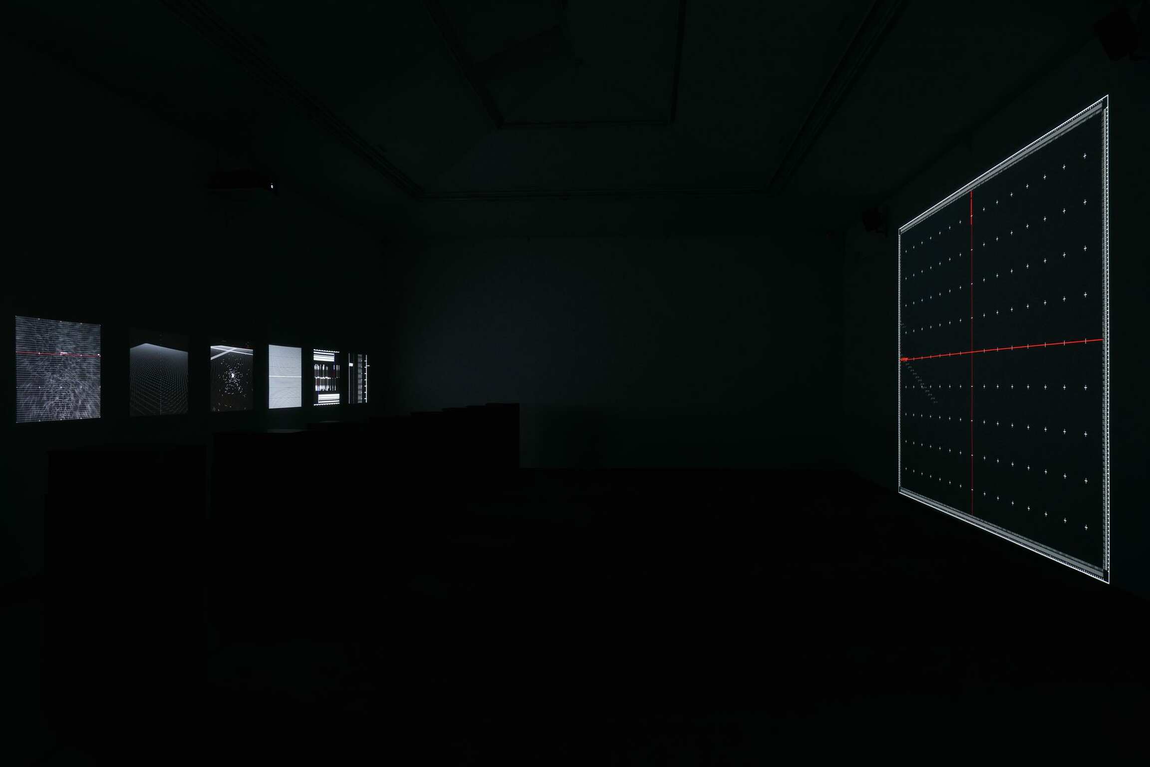 Found in the back room, both data.tron (WUXGA version), and data.matrix (n°1-10) belong to the seminal datamatics series, which Ikeda has been unfolding since 2006. Its sounds and images are derived from the endless fluxes of data we are surrounded by, albeit invisible and silent until they are decoded by any of the devices we use as receivers – mobile telephones, tablets, computers, etc. Data in transit consists of electrical impulses traveling at the speed of light from one end of the world to the other, before being transformed into content. Regardless of its nature, information therefore is somewhat dematerialized most of the time. Yet, it is a matter that has profound perceptual and cognitive effects on the way we relate to our realm. With his immersive audiovisual environments, Ikeda materializes the data cloud, and thus creates an awareness of how it reshapes our perception of the world in real time. Map and territory can no longer be dissociated, as our information society fully integrates newsfeeds, social media and other means of instant communication in an evermore seamless fashion. Blending “brick-and-mortar” with information architecture, Ikeda reveals how both have become intertwined to create a new condition sometimes referred to as “augmented reality”.