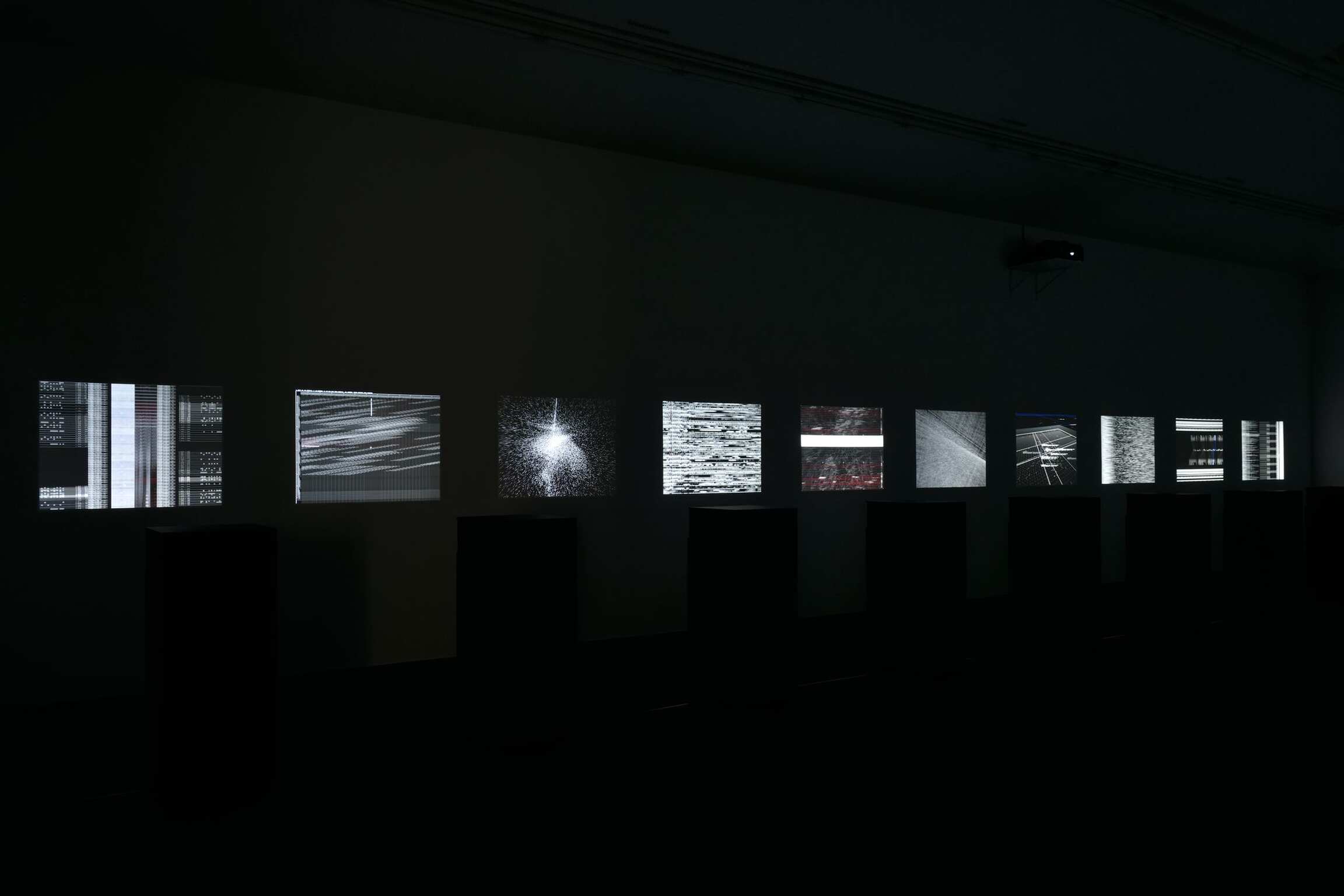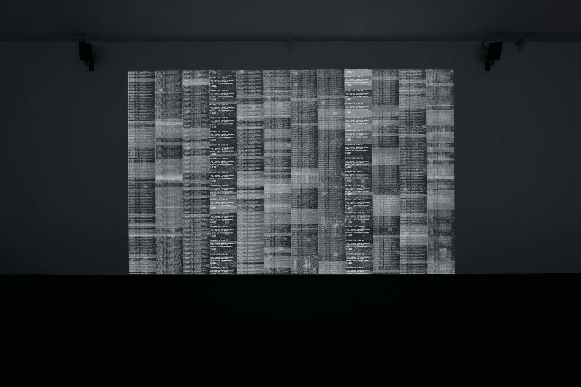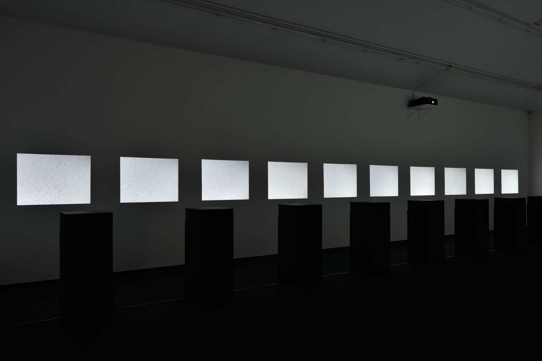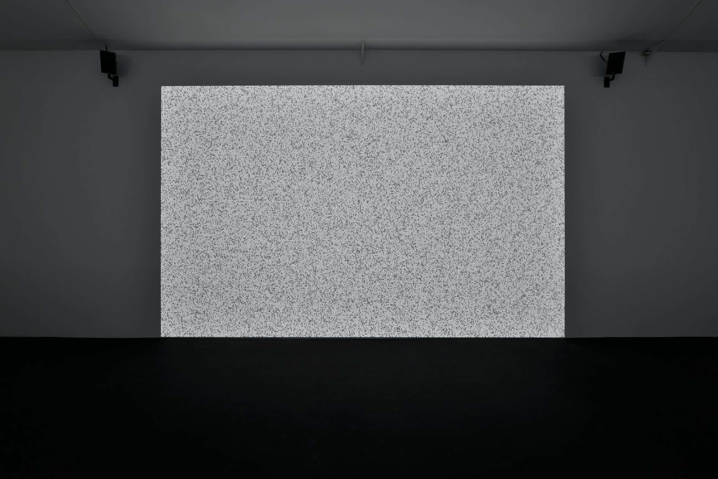 Found in the back room, both data.tron (WUXGA version), and data.matrix (n°1-10) belong to the seminal datamatics series, which Ikeda has been unfolding since 2006. Its sounds and images are derived from the endless fluxes of data we are surrounded by, albeit invisible and silent until they are decoded by any of the devices we use as receivers – mobile telephones, tablets, computers, etc. Data in transit consists of electrical impulses traveling at the speed of light from one end of the world to the other, before being transformed into content. Regardless of its nature, information therefore is somewhat dematerialized most of the time. Yet, it is a matter that has profound perceptual and cognitive effects on the way we relate to our realm. With his immersive audiovisual environments, Ikeda materializes the data cloud, and thus creates an awareness of how it reshapes our perception of the world in real time. Map and territory can no longer be dissociated, as our information society fully integrates newsfeeds, social media and other means of instant communication in an evermore seamless fashion. Blending “brick-and-mortar” with information architecture, Ikeda reveals how both have become intertwined to create a new condition sometimes referred to as “augmented reality”.