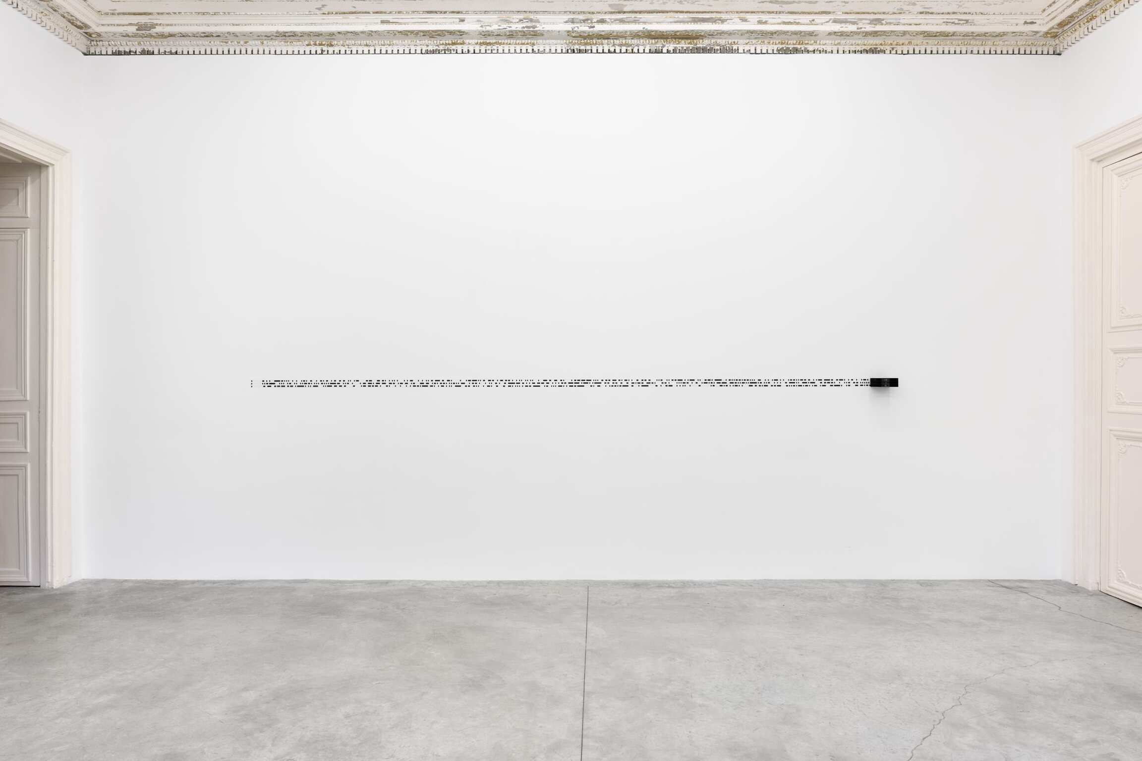 Framed as a classical landscape, 4’33” consists of magnetic film footage for a duration that is similar to John Cage’s work of the same name, dating from 1952. In this case, Ikeda chooses to materialize silence, another immaterial yet essential element in human life. Film, which was conceived to be moving is now still, is now framed as a relic, as if to materialize infinity. This is precisely the subject matter of another film work, π, e, ø, which title takes its cue from three irrational numbers that represent different dimensions of the infinite. The 1 x 1 pixel-like prints somehow function in a similar fashion: the sleek surface of the black, white or grey paper holds almost invisible information, which happens to be fragments of those same numbers.