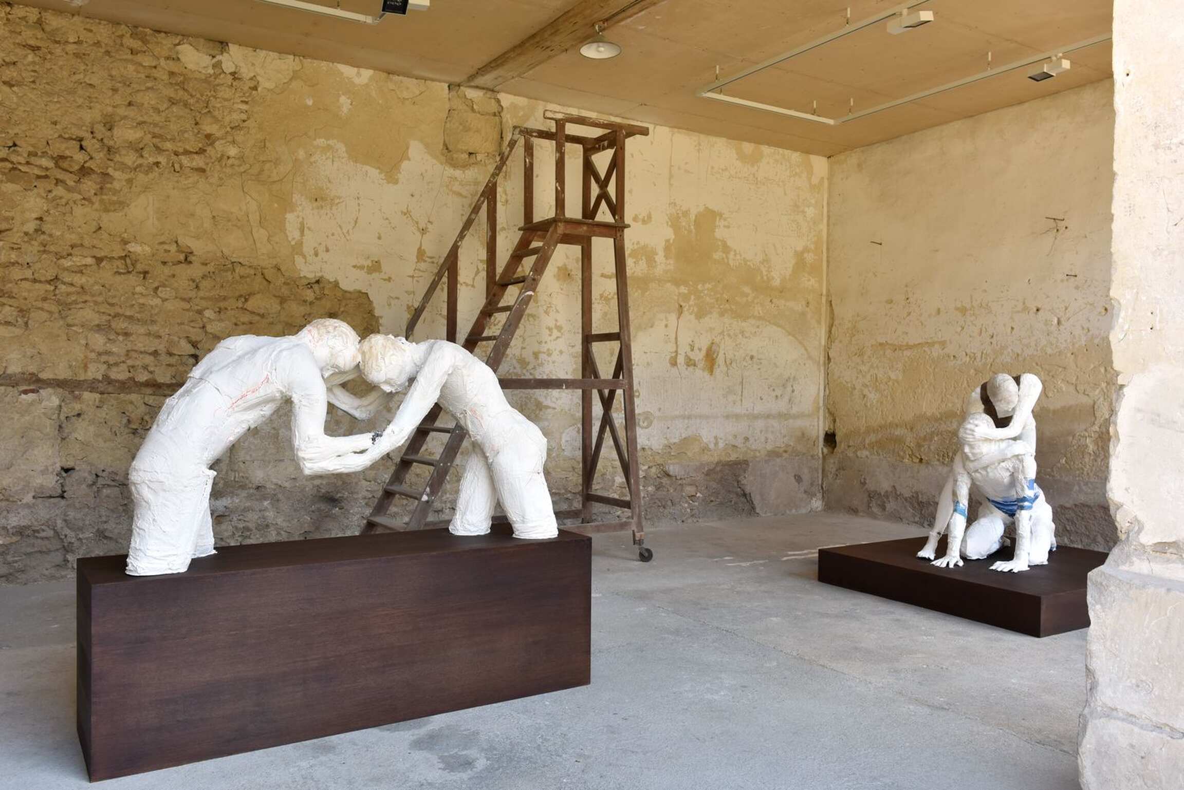 Claire Tabouret’s first plaster sculptures are visual representations of instinctive moods, of innate, uncontrollable drives. One can easily recognize oneself in these figures, with their ability to convey subtle psychological tensions. Made with sculpted plaster, a material reminiscent of Picasso’s work produced in the studio at Boisgeloup, the sculpture of two embracing figures Holding Back (2018) physically embodies contradiction and tension: notions present in all the artist’s representations of wrestlers. Abandoning the colour of paint in favour of three-dimensionality, the full-scale engaged bodies are animated by their volume. Influenced by Picasso’s intuitive, impulsive side as described by Brassaï in their discussions (Conversations with Picasso, 1964), these new plaster sculptures by Claire Tabouret pay tribute to the place where the master once lived and worked.