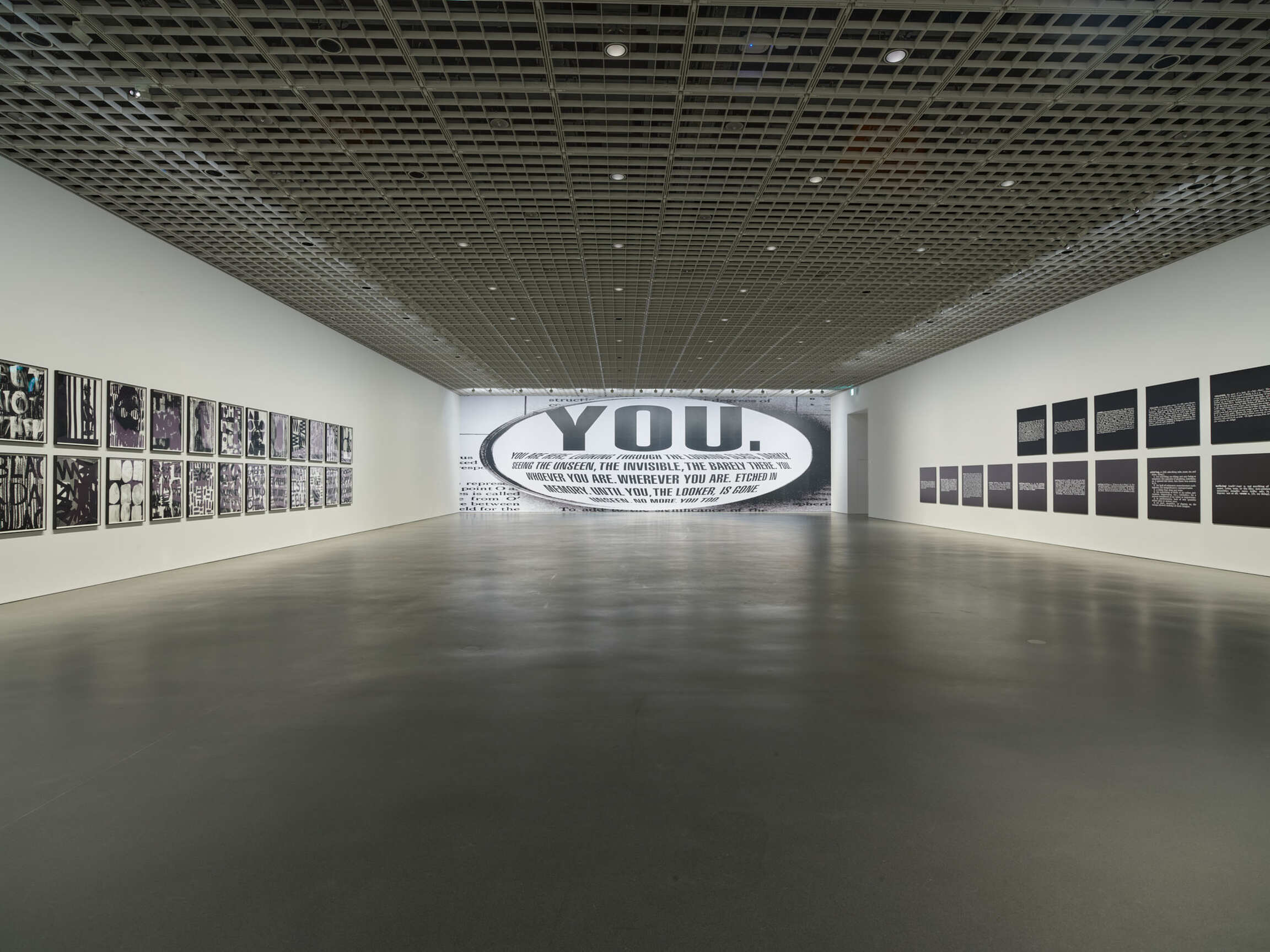 Exhibition Rooms 4 and 5 present sculptural and painted works that embody a broad range of themes and formal experiments. Artworks like The Painter, Fig 2, a sculpture by Elmgreen & Dragset, as well as Orange Aerobic Shower by Katherine Bernhardt,offer an overwhelming experience to viewers. Room 6 features large-scale works that express their message through the shared medium of text, including Barbara Kruger’s digital print, Untitled (FOREVER), and the works of Joseph Kosuth, and Adam Pendleton.