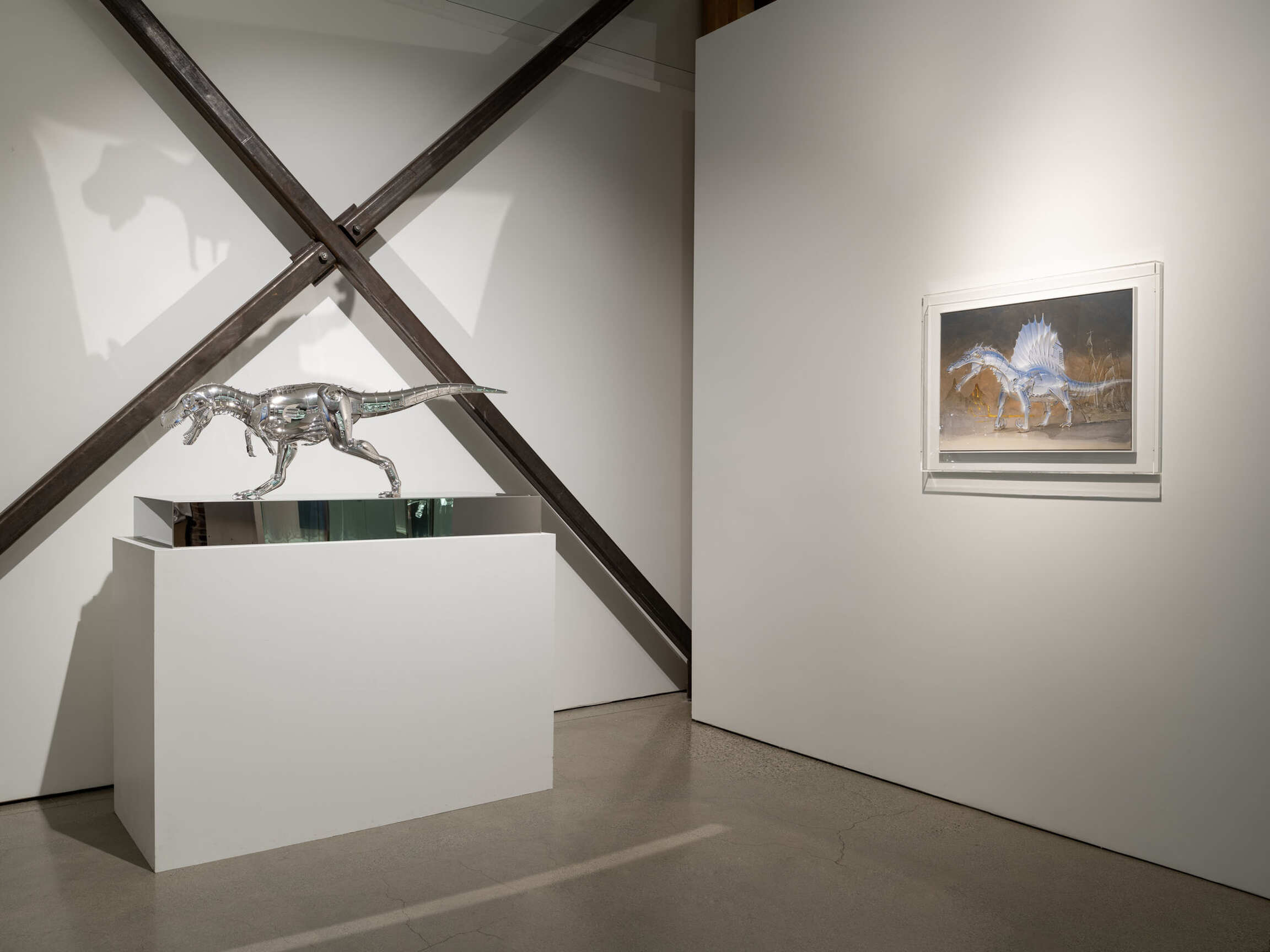 In 1988, Sorayama manifested his understanding of this intricate bond between robots and humans through two compelling paintings (Untitled, 1988; Untitled, 1988). One symbolized a cordial alliance, while the other encapsulated the idea of redemption for robots by a human hand. While AI and robots possess remarkable intelligence, computational power, and strength, their inherent vulnerability arises from their creation by humanity. Sorayama personified a complex range of human desires, artfully concealing them beneath indomitable metallic exteriors. It is noteworthy that his mechanical creations were never depicted as violent or menacing. Instead, his inspiration drew from extinct dinosaurs, endangered marine life, and “pin-up” girls from male-oriented magazines such as Penthouse Magazine and Playboy TV.