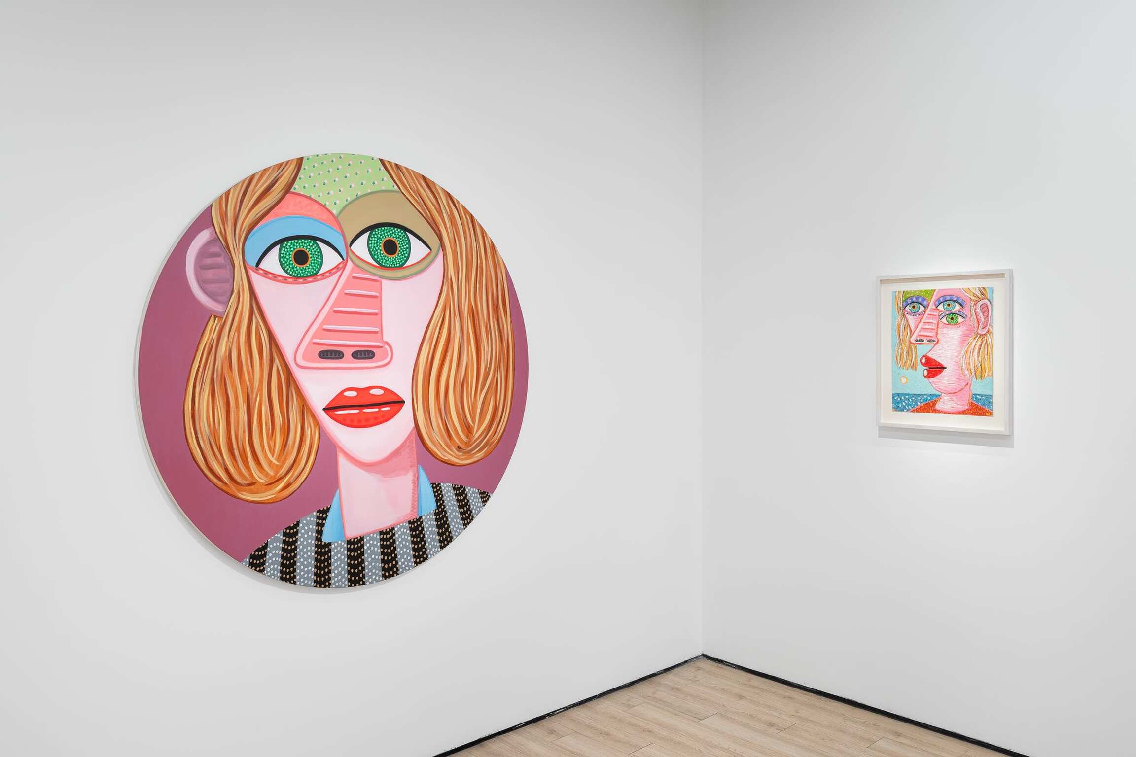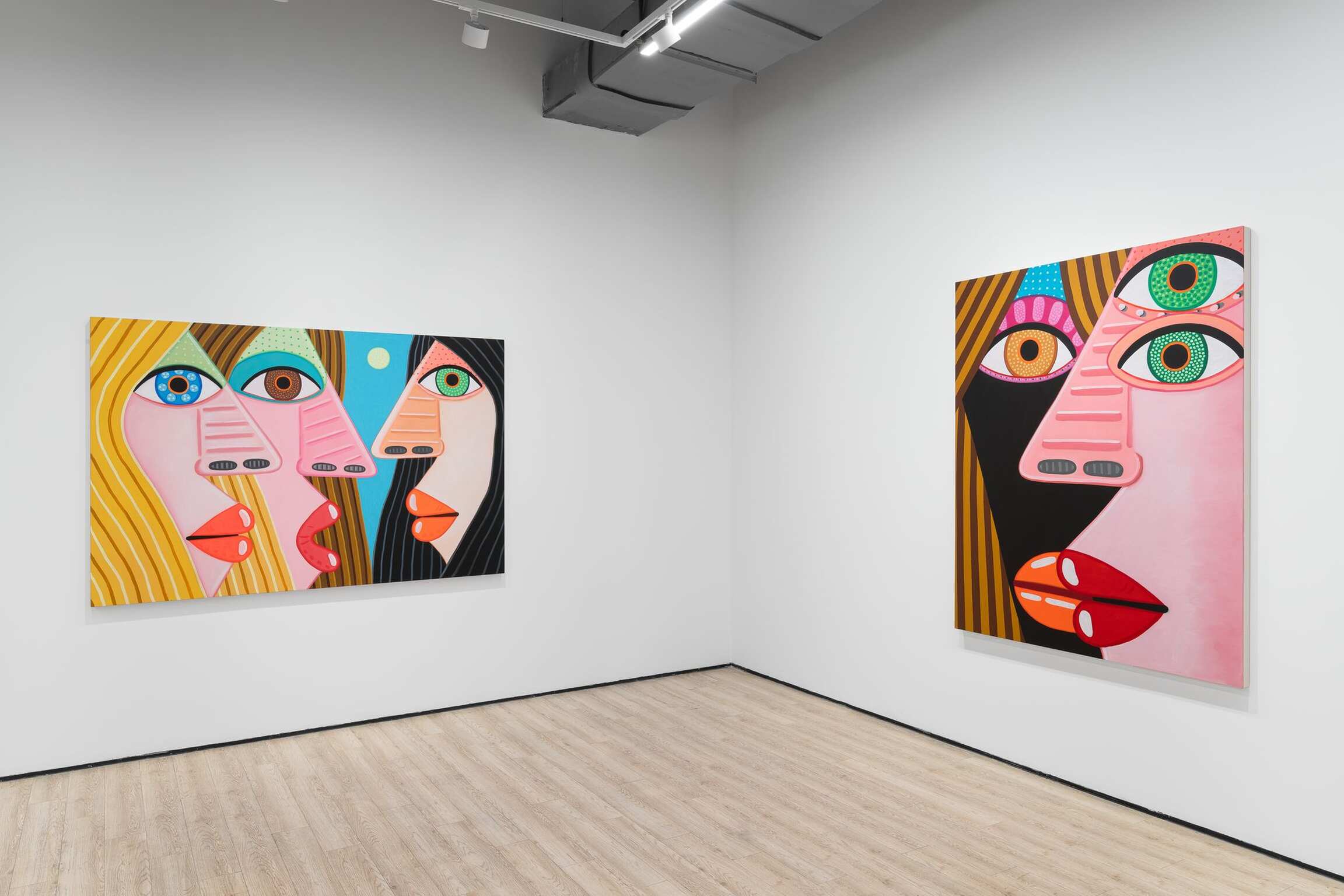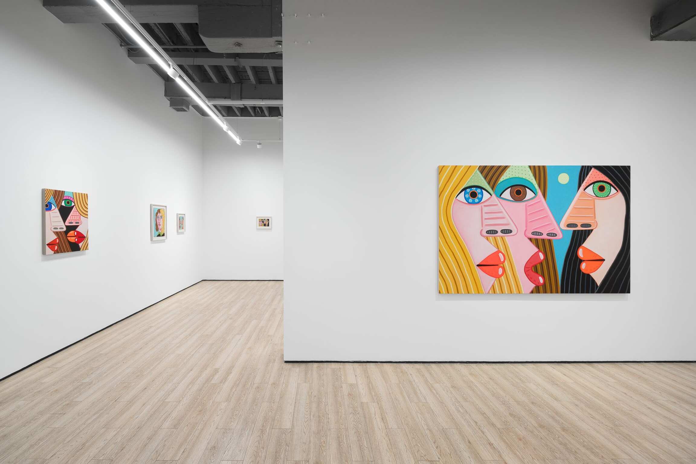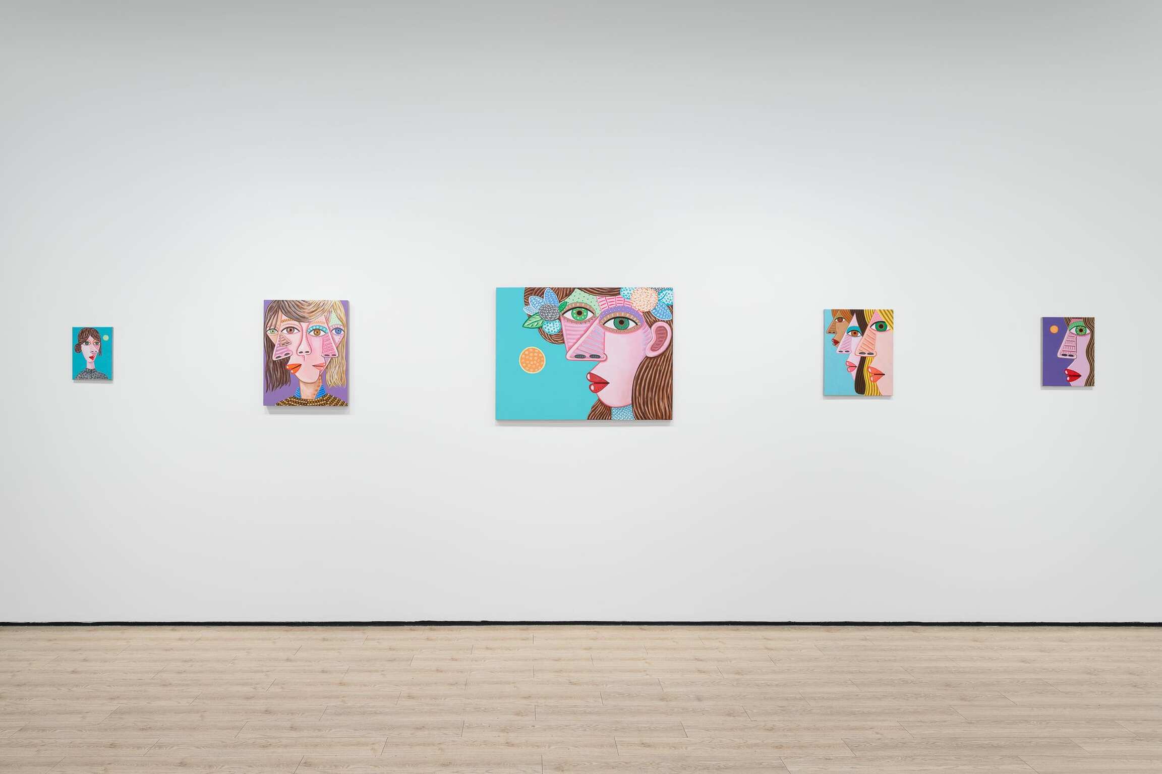 Over and over again, he paints the features of a face. Sometimes many times on one canvas and on one body. Because life is people and in the space of a human face there is infinite variation. The faces are so big, so vast, varied with flat and decorated expanses. They are made for falling into and floating on. There’s room in there, in each of them, even when crowded together up close, to see other things and find hidden worlds. Deep horizons and vortices, whole landscapes and high-rises with windows reside inside eyeballs, parted mouths, sheets of hair, and the side of a nose. She is monumental, containing and producing multitudes. Perhaps within the simplicity of her masklike features, she stands for the humanity of hundreds and thousands and millions of people. Repetition allows for play and recombination. The face—in certain prescribed views and mannered stylizations—is Calvin’s chosen structure within which he wants to dwell. It’s his way into paint, responding to the logic, wants, and needs of form and color. Often a visual stutter leads to two eyeballs being stacked one above the other, or lining up side-by-side and nearly touching end-to-end—the effect is mesmerization spiked by a jolt, an eye-rubbing double-take. The paintings, especially the many-headed stacked ones, are, in their way, a figurative take on abstraction, which is fitting because these specters of people do a good job portraying each person’s ultimate unknowability, opacity, and abstractness. The face is an excuse to make a painting, and that’s what he most wants to be doing, making a painting. And yet, a face is not just any arbitrary subject matter, it is, in fact, the most primary arrangement of shapes that we as humans are hardwired to make sense of and be engaged by from the start of our tiny lives. It is that thing we will never get over and that thing he cannot stop painting. Because life is people.