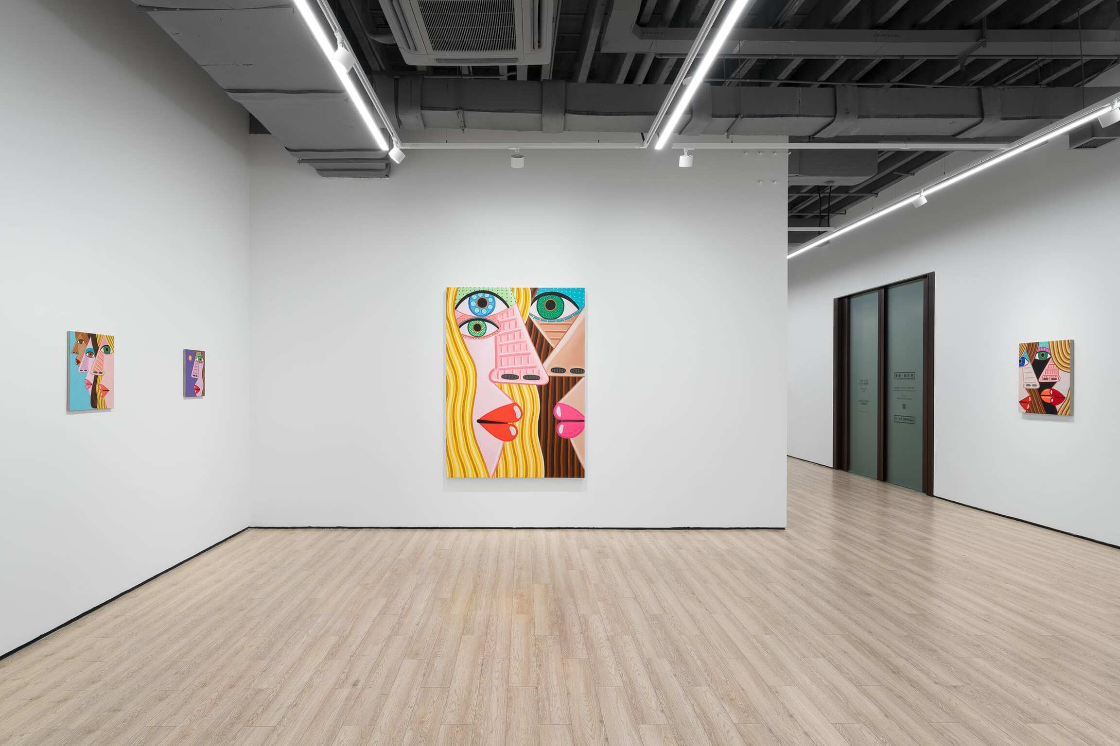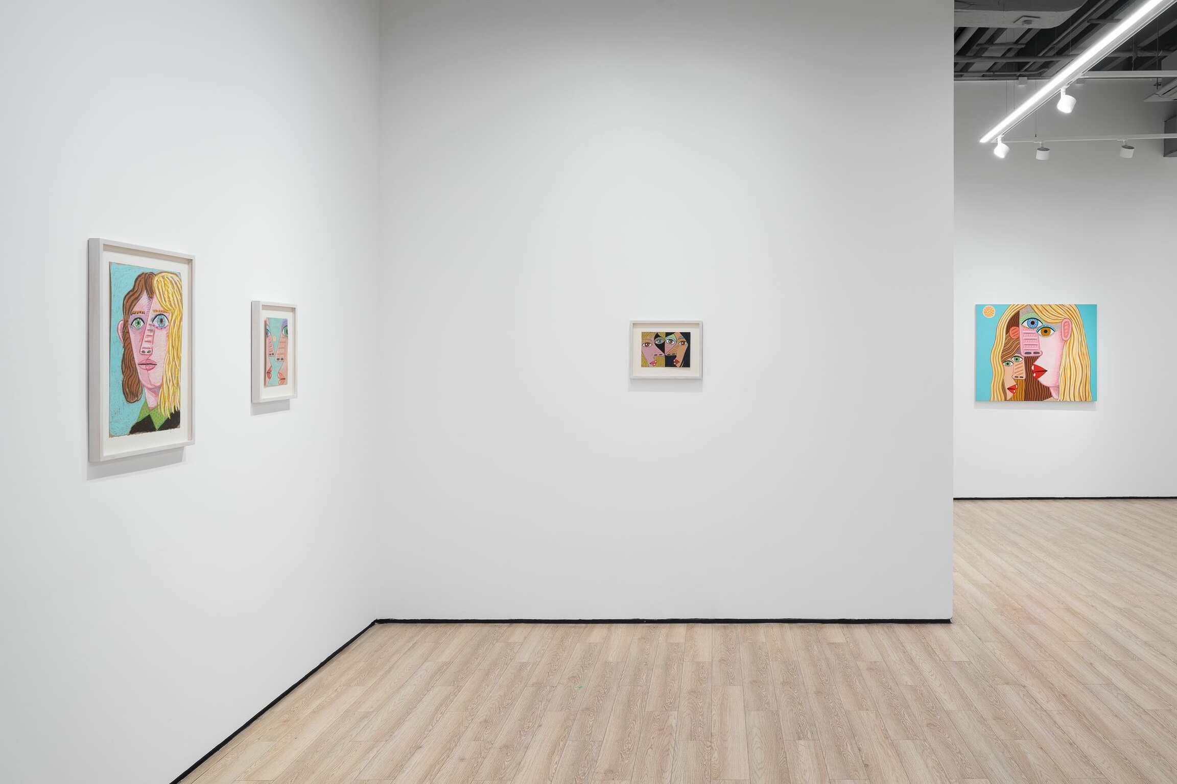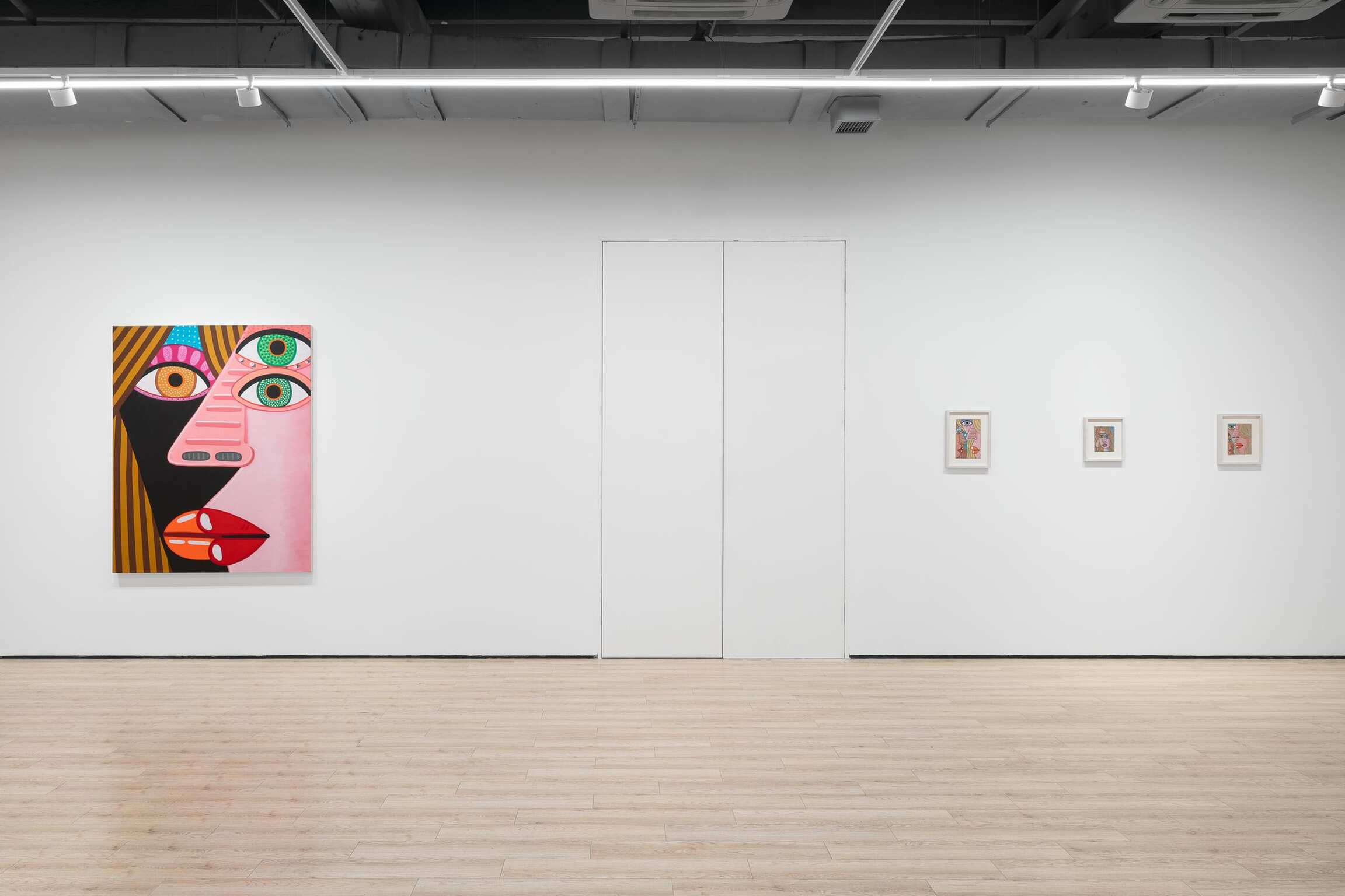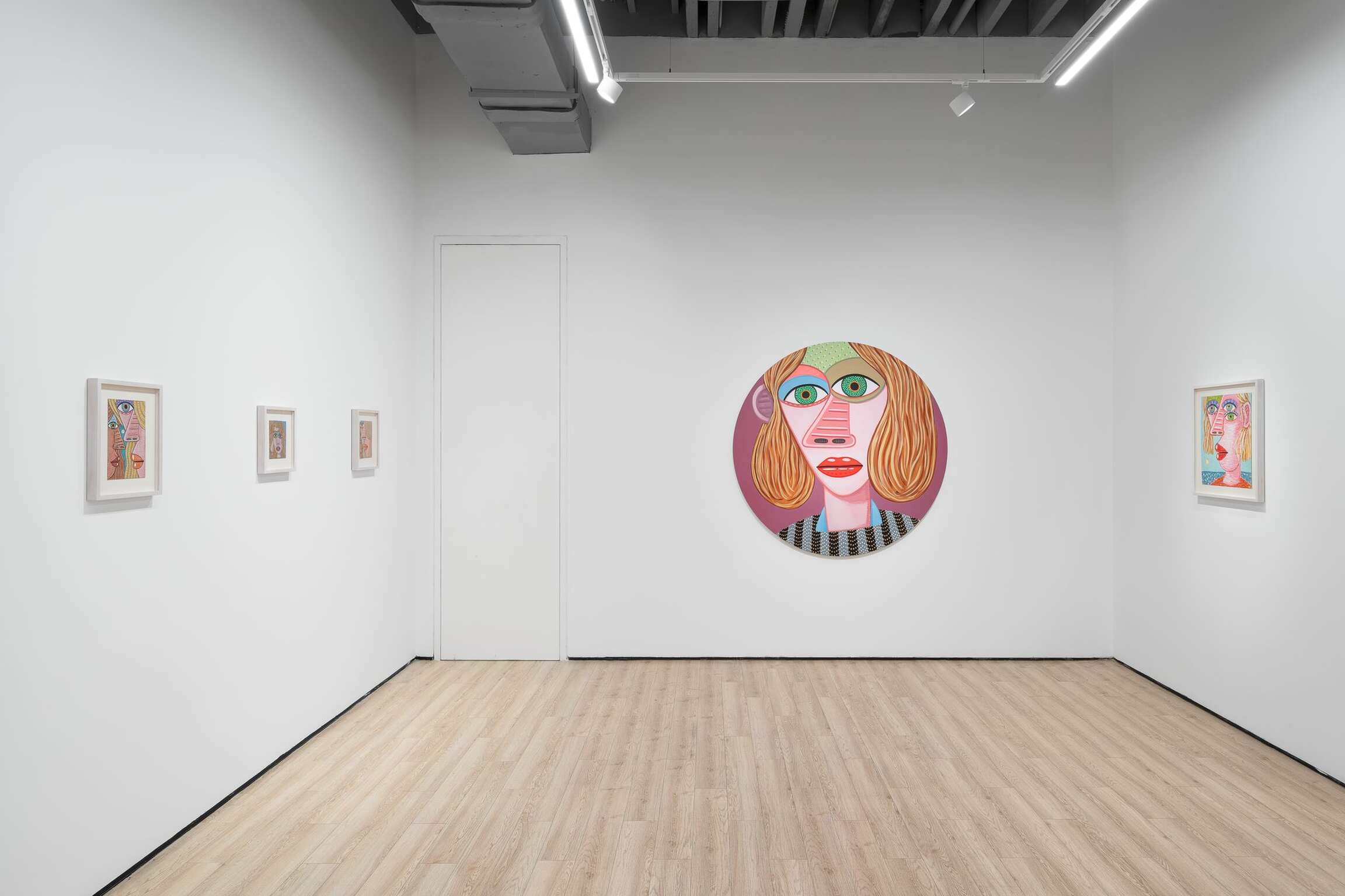 Over and over again, he paints the features of a face. Sometimes many times on one canvas and on one body. Because life is people and in the space of a human face there is infinite variation. The faces are so big, so vast, varied with flat and decorated expanses. They are made for falling into and floating on. There’s room in there, in each of them, even when crowded together up close, to see other things and find hidden worlds. Deep horizons and vortices, whole landscapes and high-rises with windows reside inside eyeballs, parted mouths, sheets of hair, and the side of a nose. She is monumental, containing and producing multitudes. Perhaps within the simplicity of her masklike features, she stands for the humanity of hundreds and thousands and millions of people. Repetition allows for play and recombination. The face—in certain prescribed views and mannered stylizations—is Calvin’s chosen structure within which he wants to dwell. It’s his way into paint, responding to the logic, wants, and needs of form and color. Often a visual stutter leads to two eyeballs being stacked one above the other, or lining up side-by-side and nearly touching end-to-end—the effect is mesmerization spiked by a jolt, an eye-rubbing double-take. The paintings, especially the many-headed stacked ones, are, in their way, a figurative take on abstraction, which is fitting because these specters of people do a good job portraying each person’s ultimate unknowability, opacity, and abstractness. The face is an excuse to make a painting, and that’s what he most wants to be doing, making a painting. And yet, a face is not just any arbitrary subject matter, it is, in fact, the most primary arrangement of shapes that we as humans are hardwired to make sense of and be engaged by from the start of our tiny lives. It is that thing we will never get over and that thing he cannot stop painting. Because life is people.