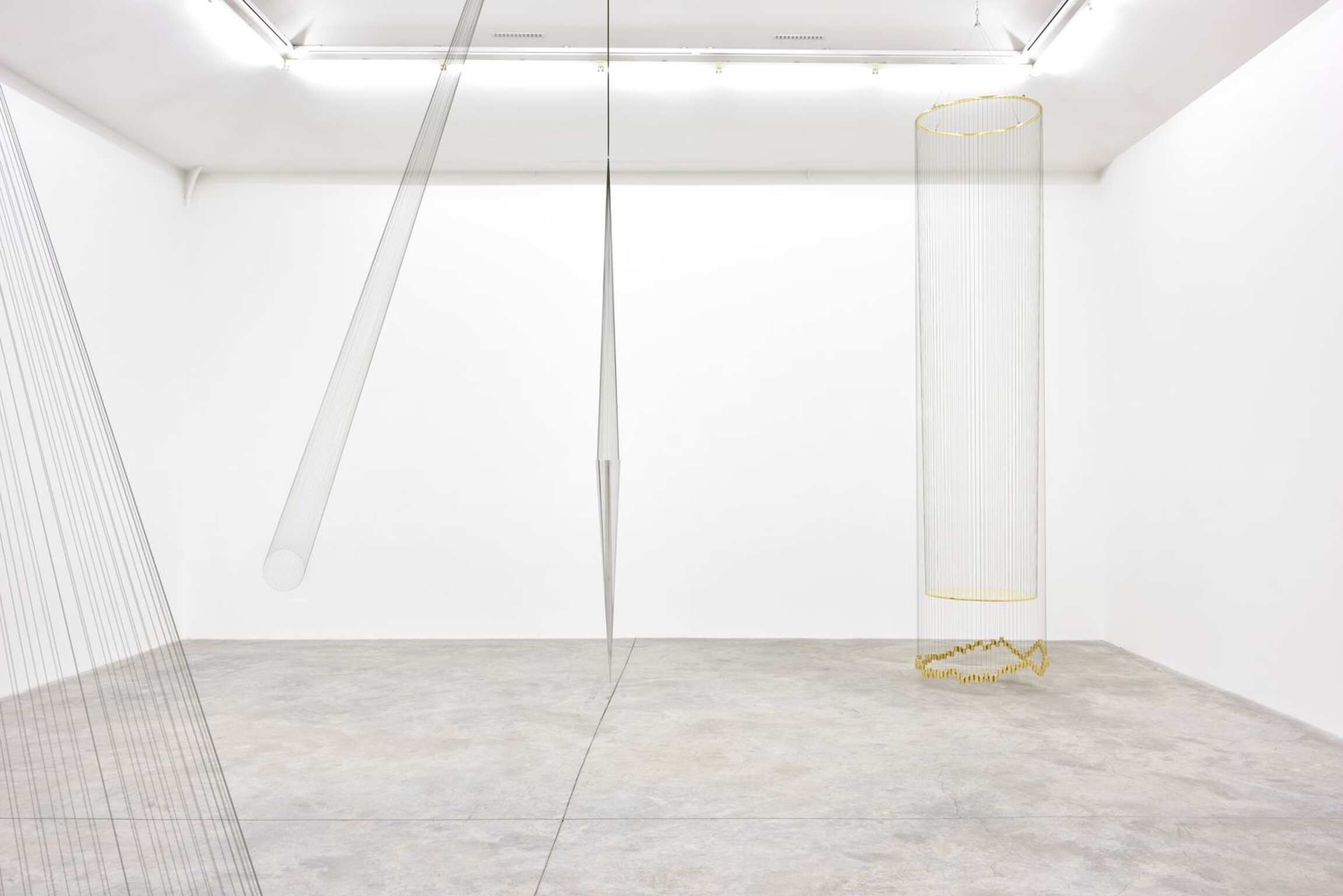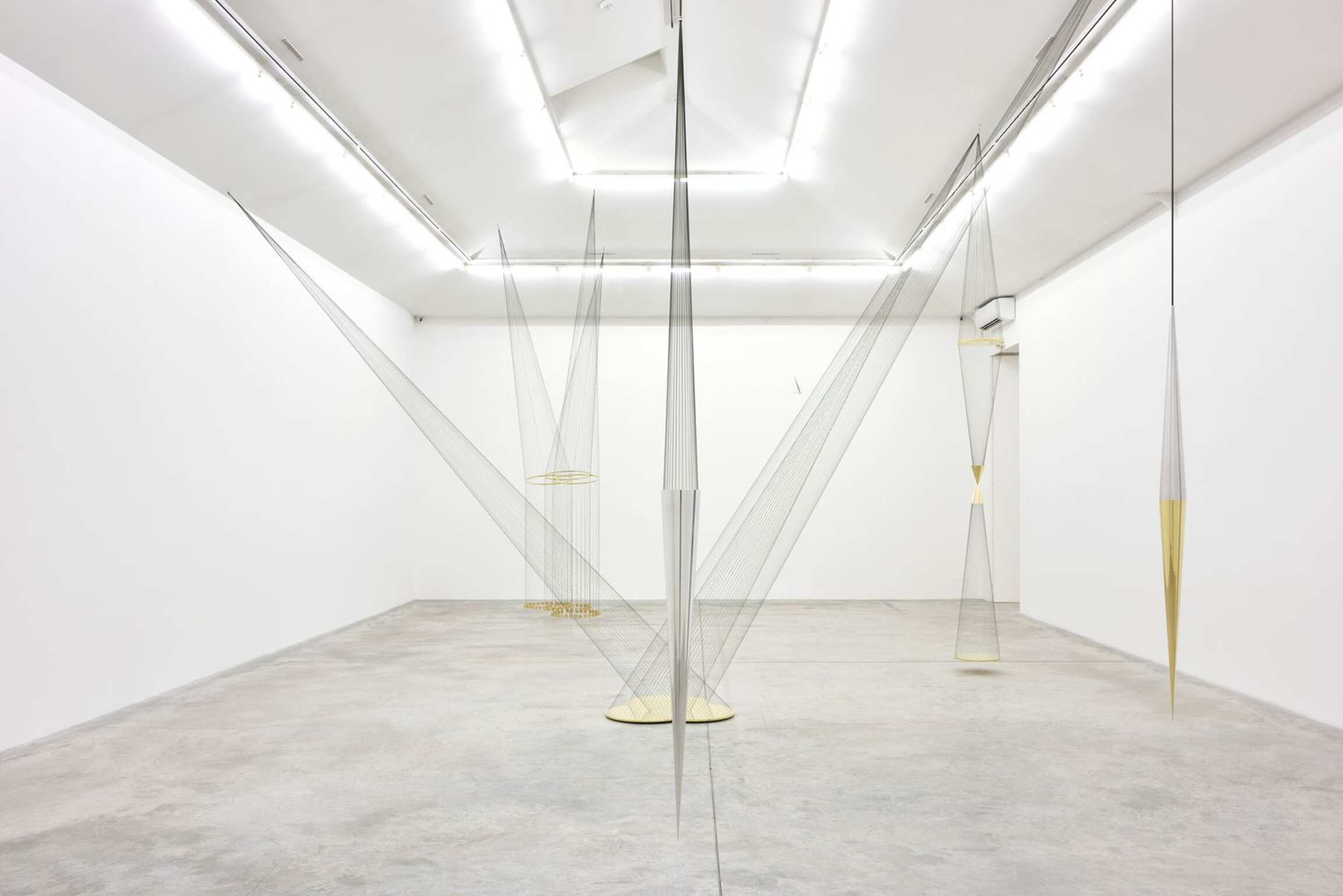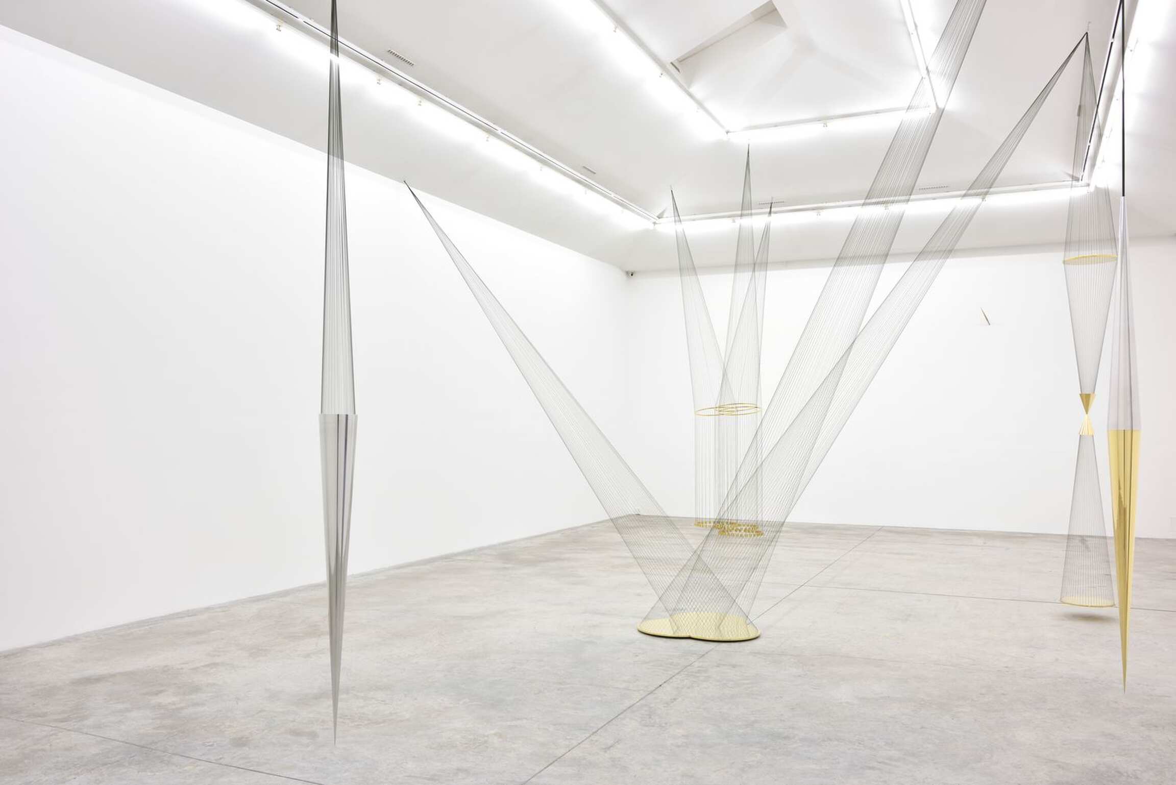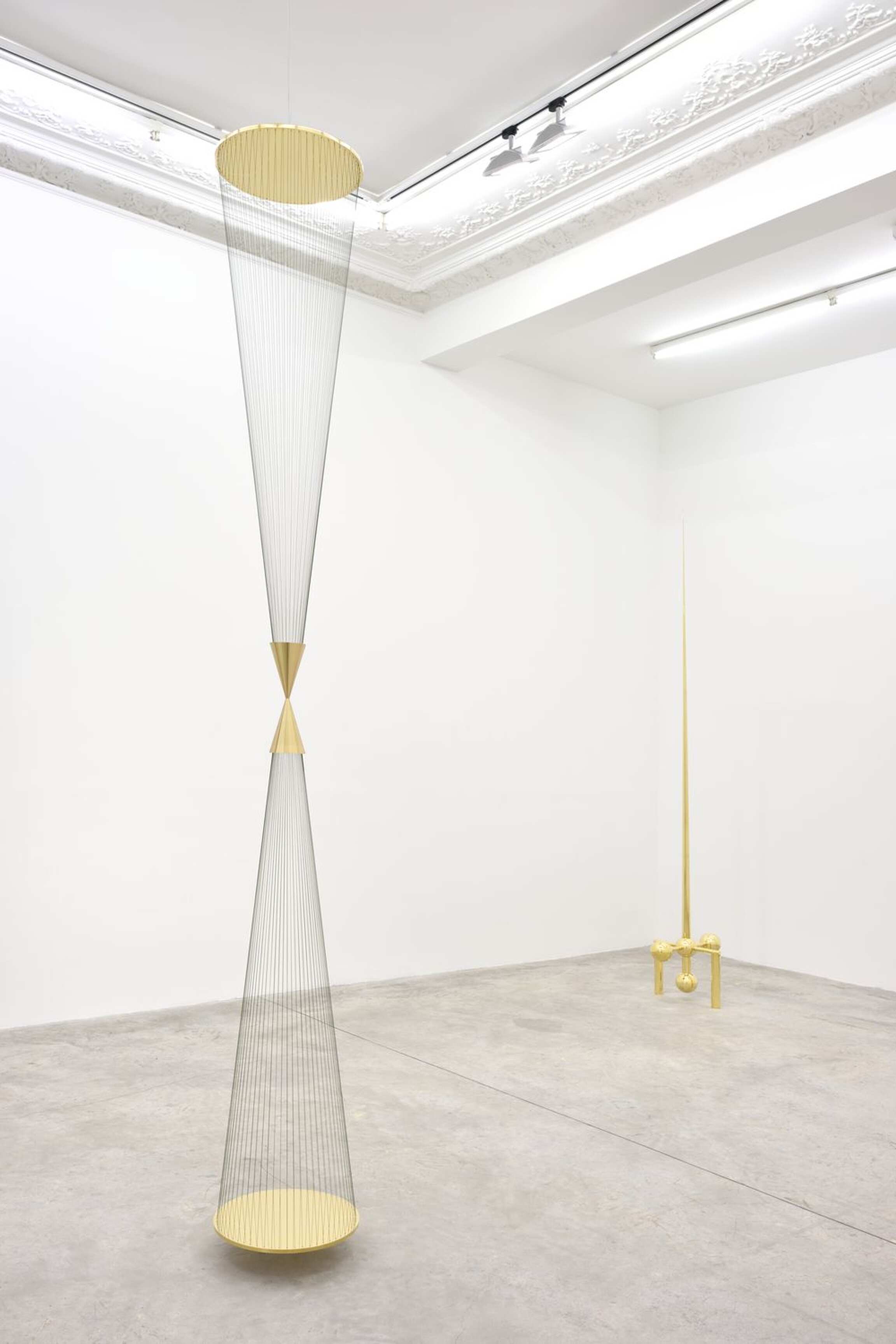 The arrangement across the gallery’s three rooms composes a constellation, interpreted by the artist, which invites the beholder to a kind of astral voyage. The stars converse, repel and attract each other. Here, the references and suspension will not fail to remind visitors of Foucault’s pendulum hanging from the Pantheon dome, and the experimental origin of this attempt to demonstrate the earth’s oscillation without external observation is reminiscent of Sextante, Alnilan or even Cardenal in its ability to express forces beyond our understanding. Lescher’s pieces are all the more fascinating as their extreme precision and formal execution, along with their relationship to the architecture, beyond their own geometry, also reflect the extreme relativity of time and space…