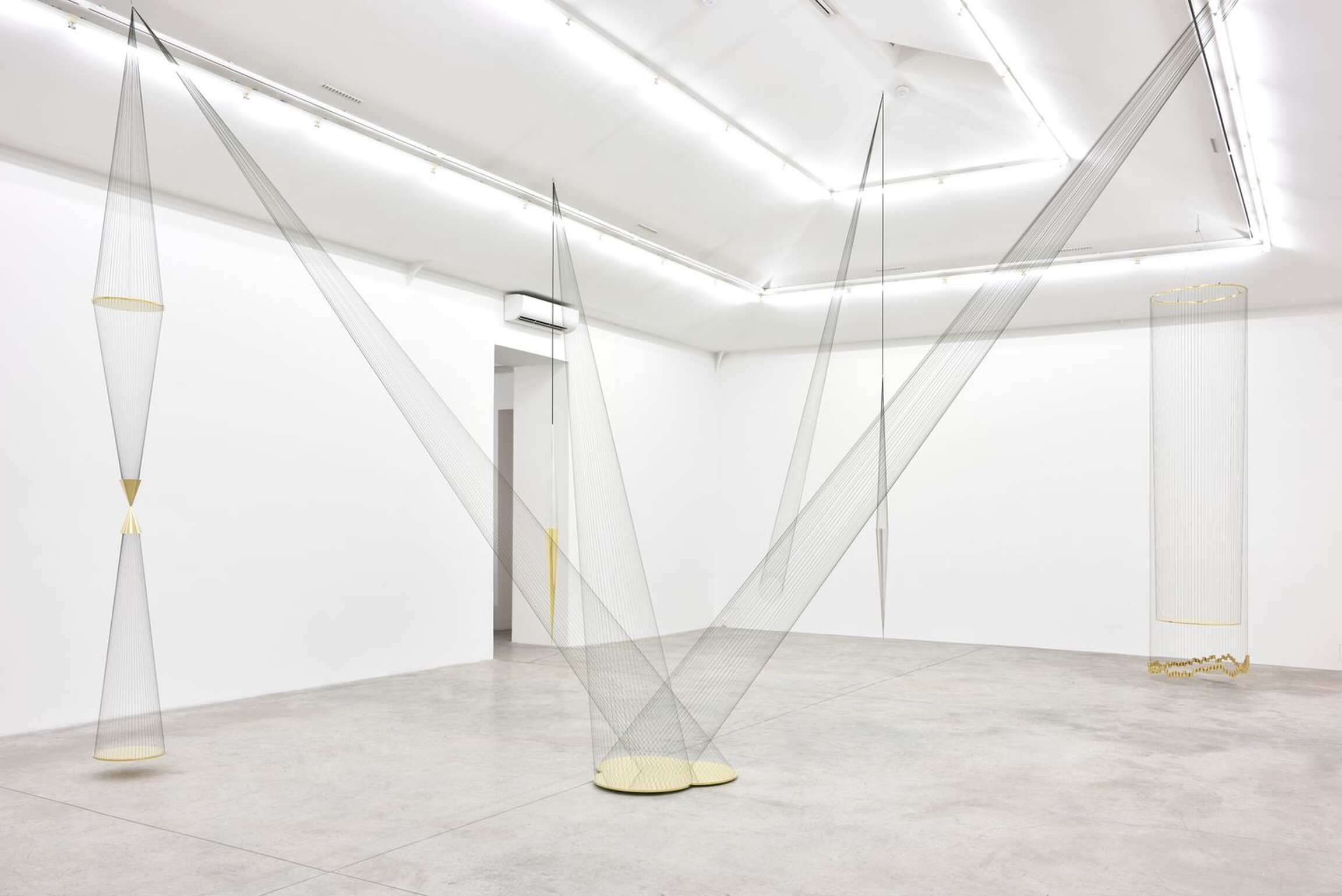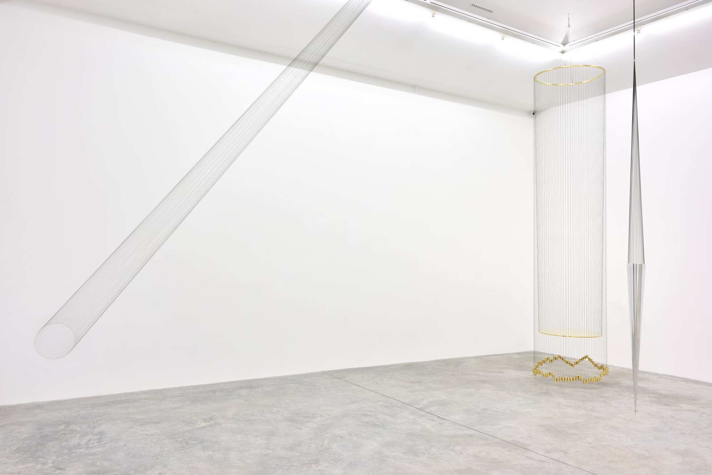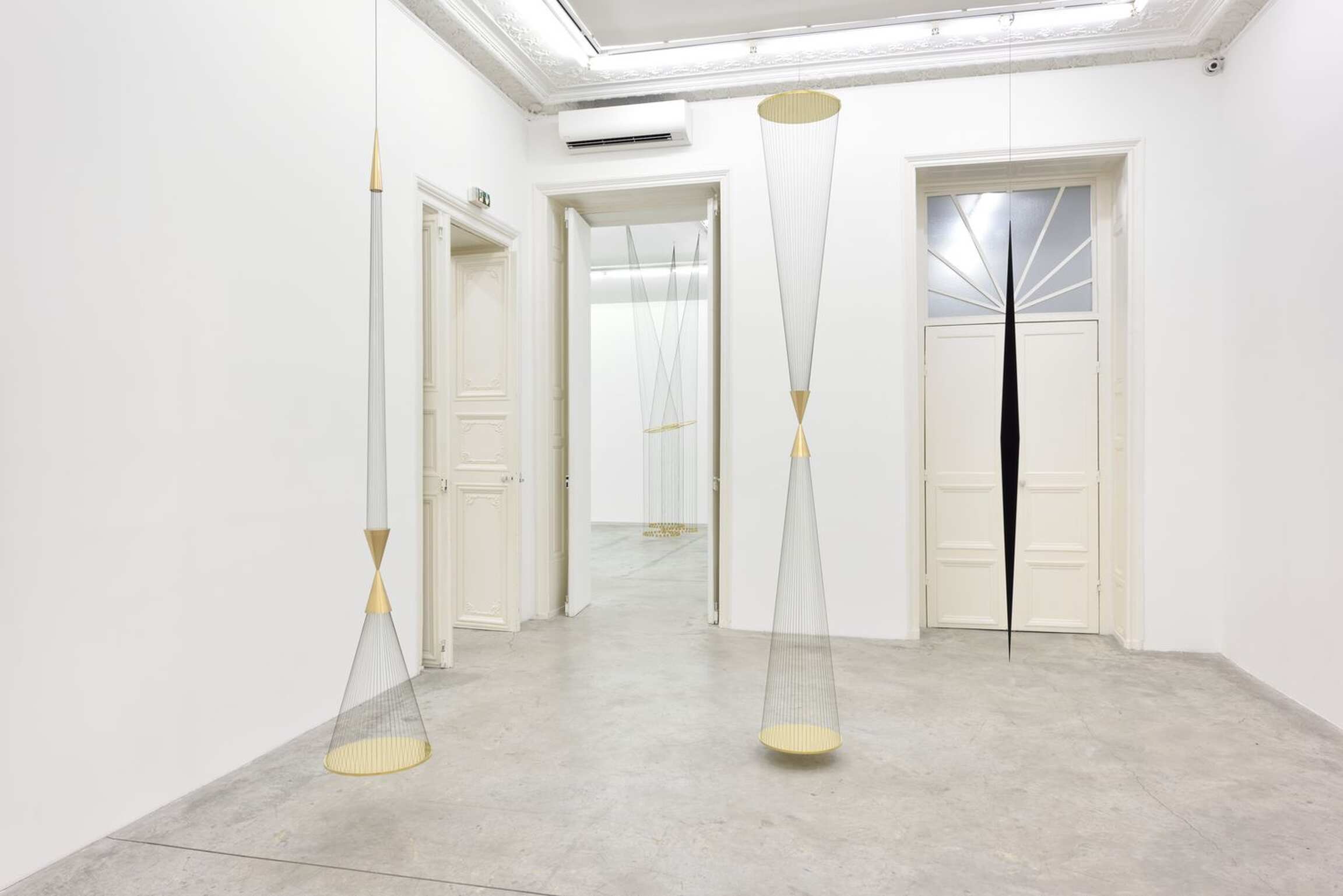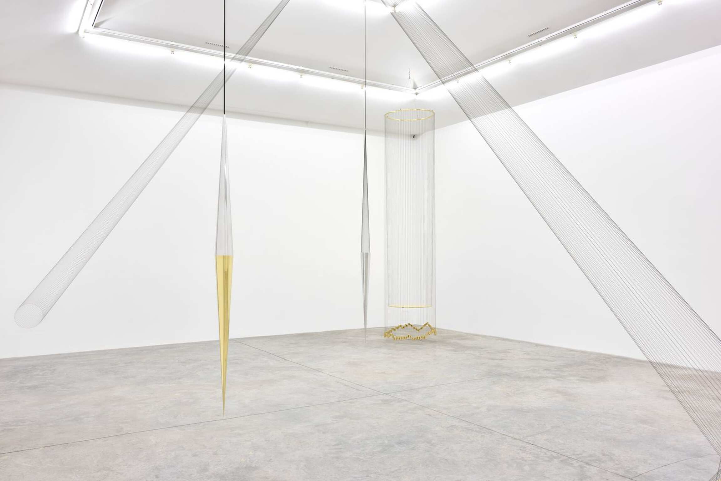 The arrangement across the gallery’s three rooms composes a constellation, interpreted by the artist, which invites the beholder to a kind of astral voyage. The stars converse, repel and attract each other. Here, the references and suspension will not fail to remind visitors of Foucault’s pendulum hanging from the Pantheon dome, and the experimental origin of this attempt to demonstrate the earth’s oscillation without external observation is reminiscent of Sextante, Alnilan or even Cardenal in its ability to express forces beyond our understanding. Lescher’s pieces are all the more fascinating as their extreme precision and formal execution, along with their relationship to the architecture, beyond their own geometry, also reflect the extreme relativity of time and space…