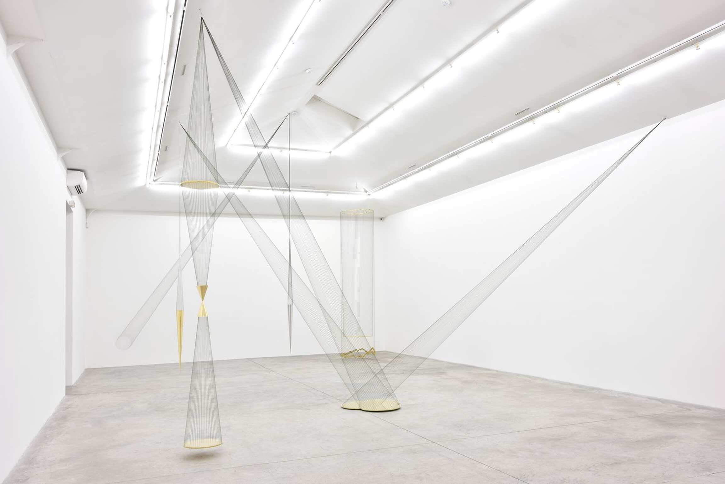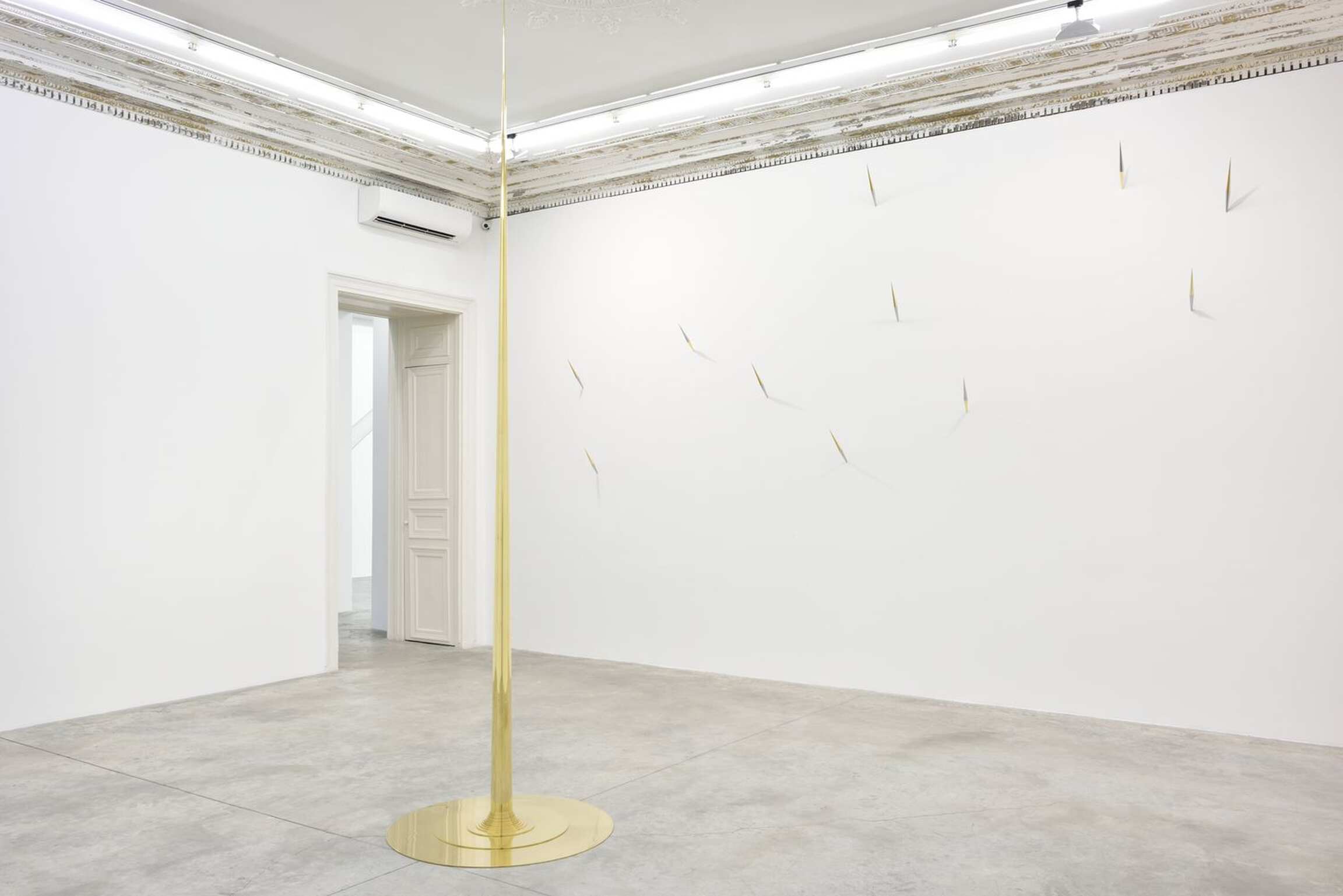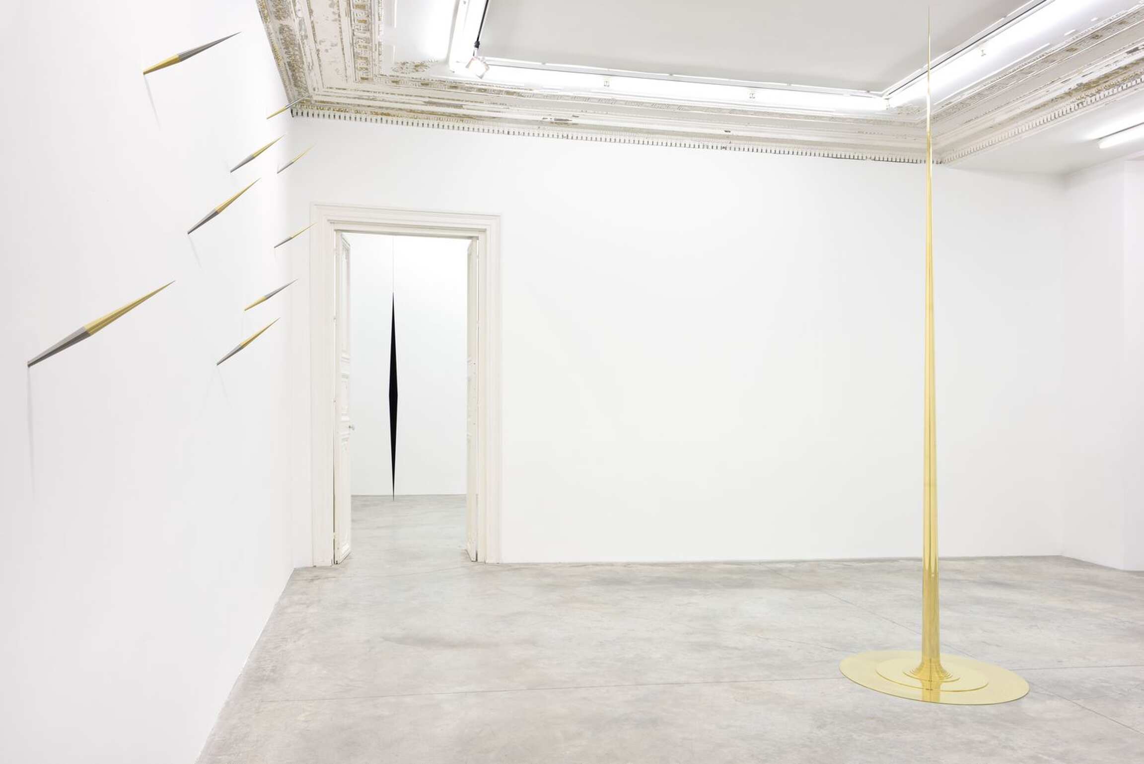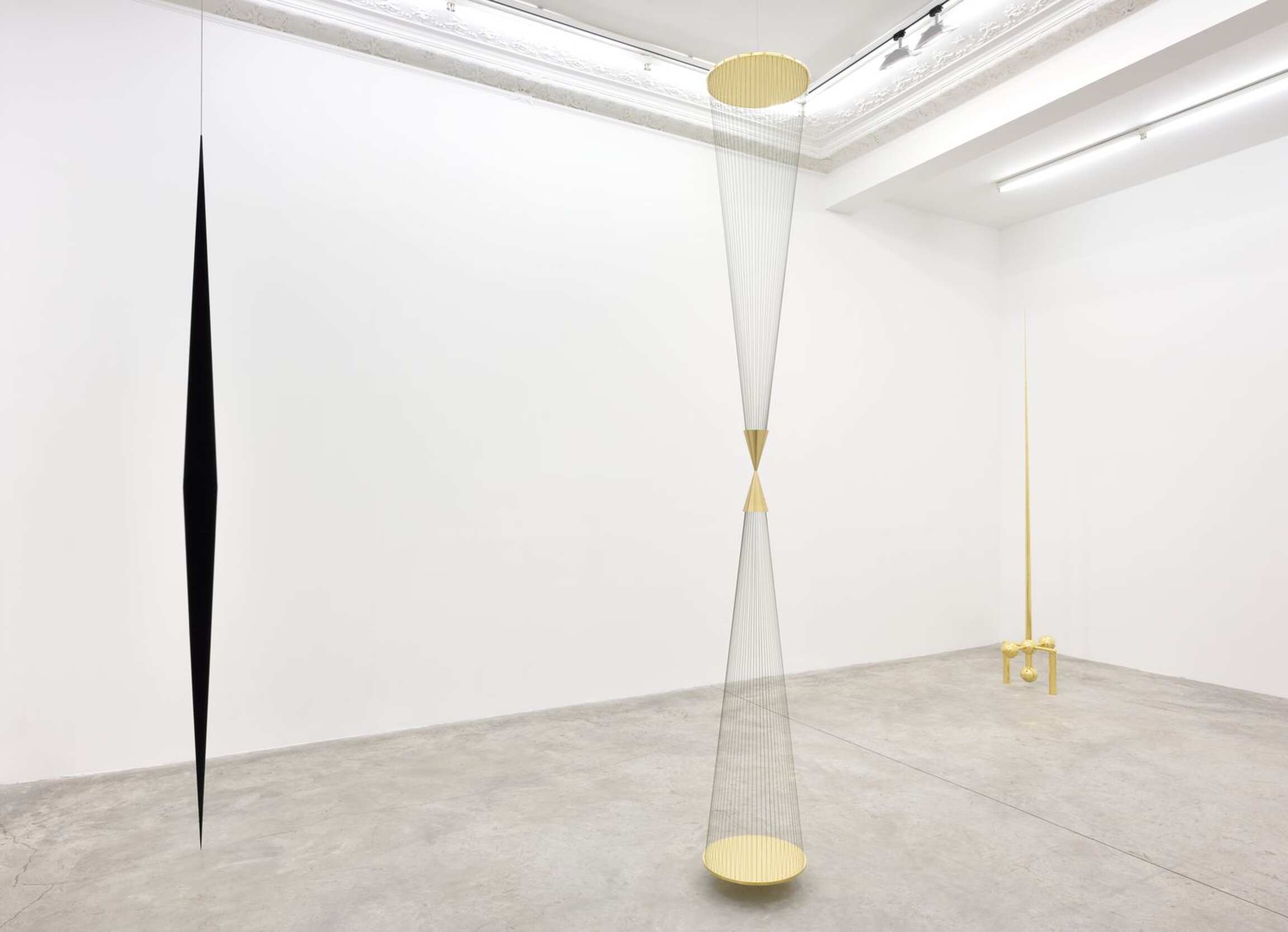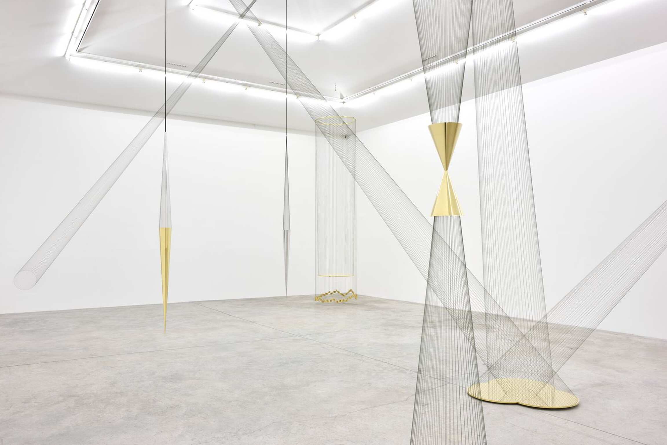 The arrangement across the gallery’s three rooms composes a constellation, interpreted by the artist, which invites the beholder to a kind of astral voyage. The stars converse, repel and attract each other. Here, the references and suspension will not fail to remind visitors of Foucault’s pendulum hanging from the Pantheon dome, and the experimental origin of this attempt to demonstrate the earth’s oscillation without external observation is reminiscent of Sextante, Alnilan or even Cardenal in its ability to express forces beyond our understanding. Lescher’s pieces are all the more fascinating as their extreme precision and formal execution, along with their relationship to the architecture, beyond their own geometry, also reflect the extreme relativity of time and space…